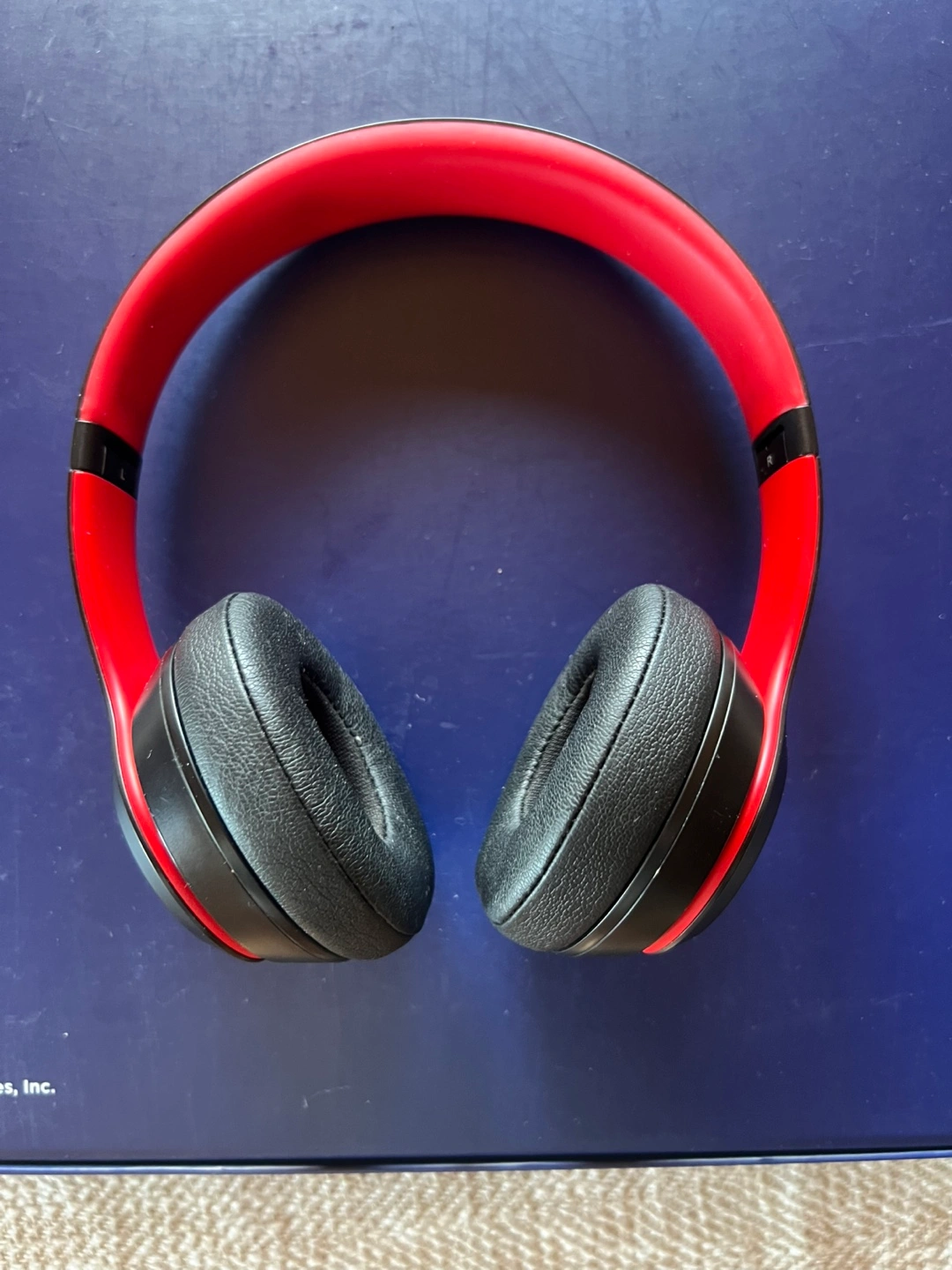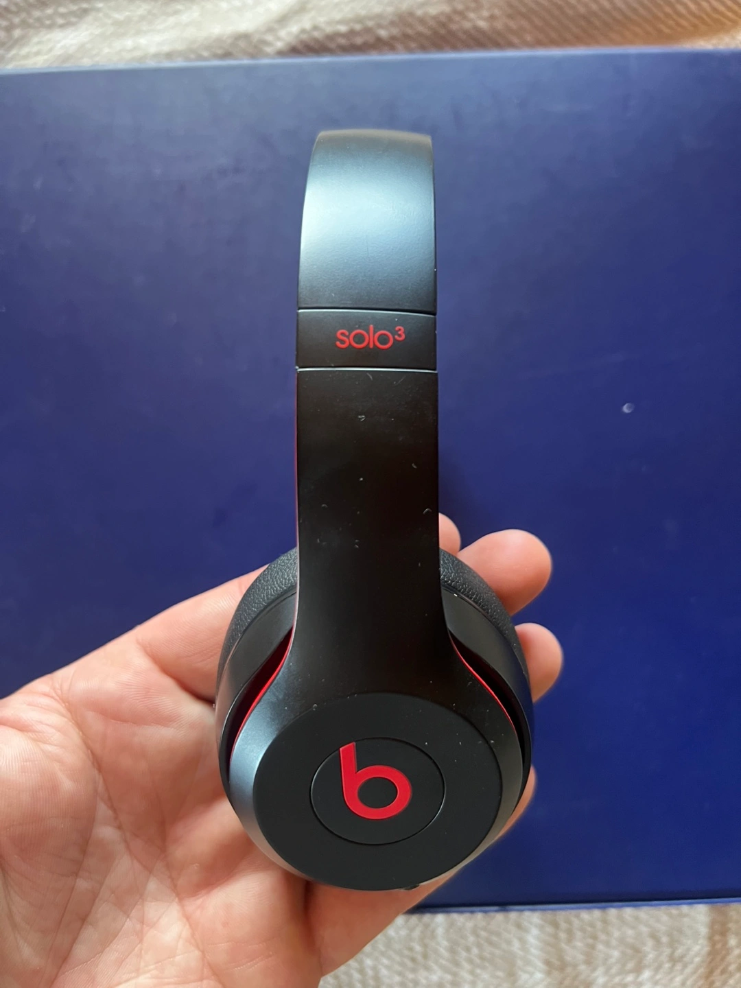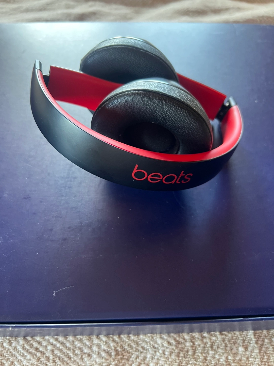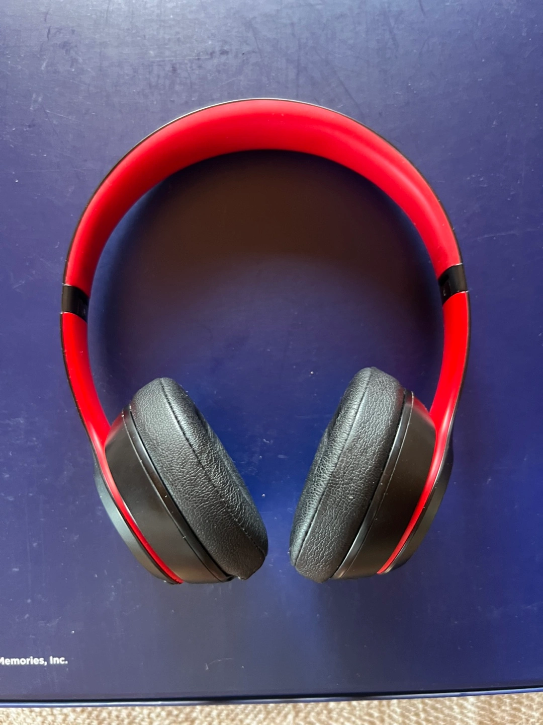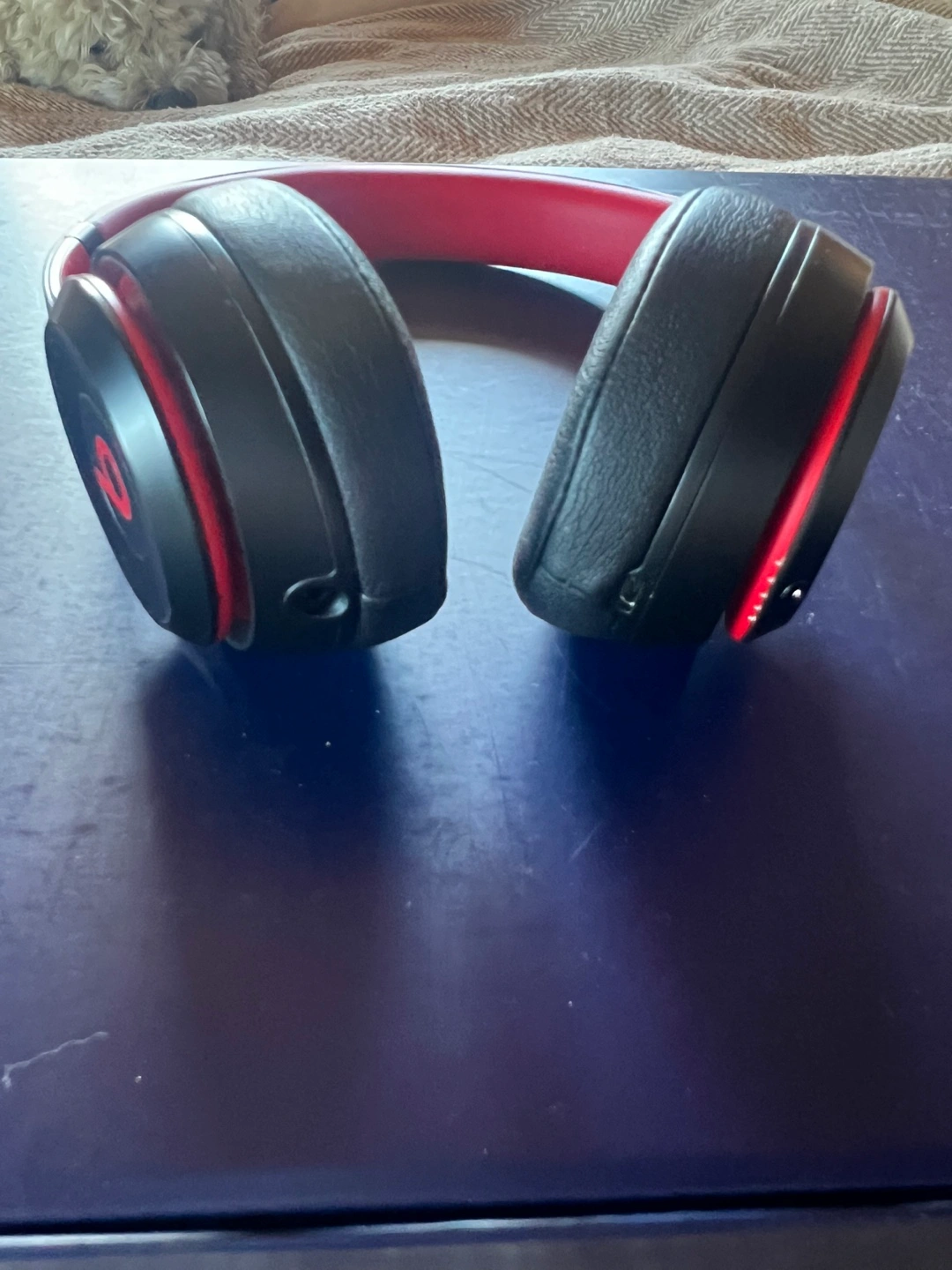 Selling a pair of Beats Solo3 wireless headphones in red and black. They're in great shape and ready for a new home! These headphones are known for their comfort and sound quality, perfect for everyday use or travel
