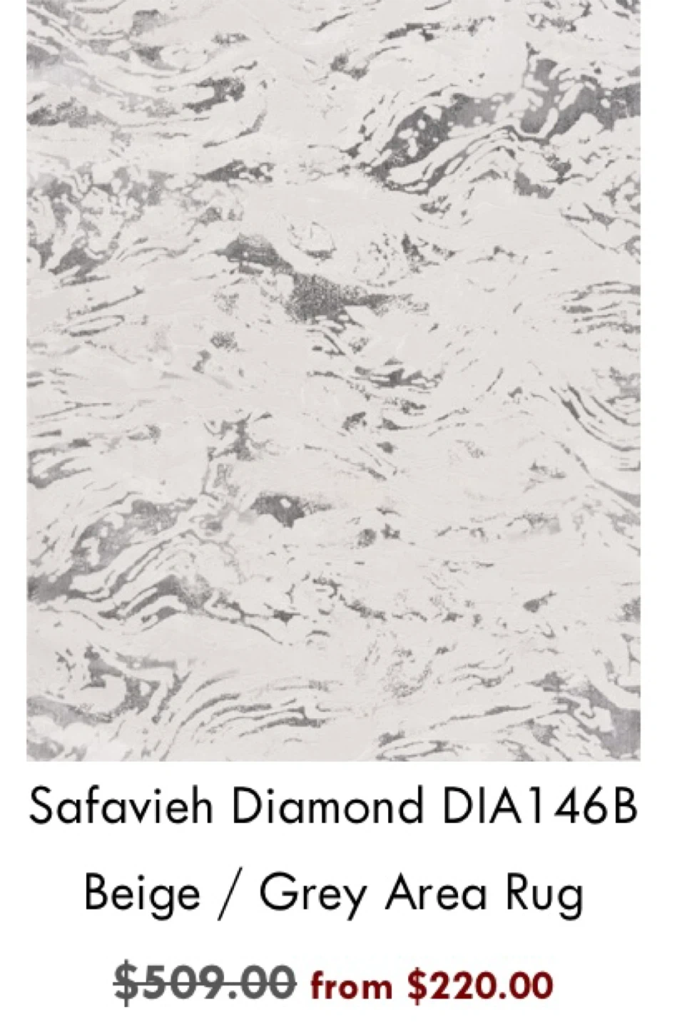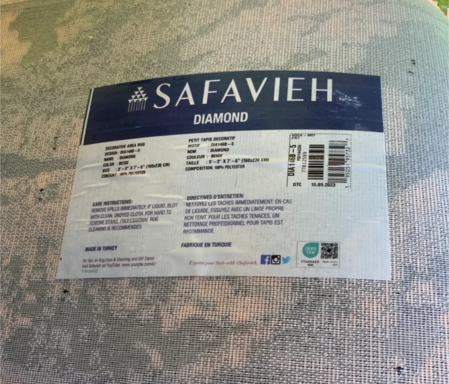 • 7 ft 6 inch x 5 ft 3 inch • Model: DIA146B • Safavieh Diamond • greys & soft sand colors • 100% polyester • pressure washed & carpet machine used Clean … very good condition