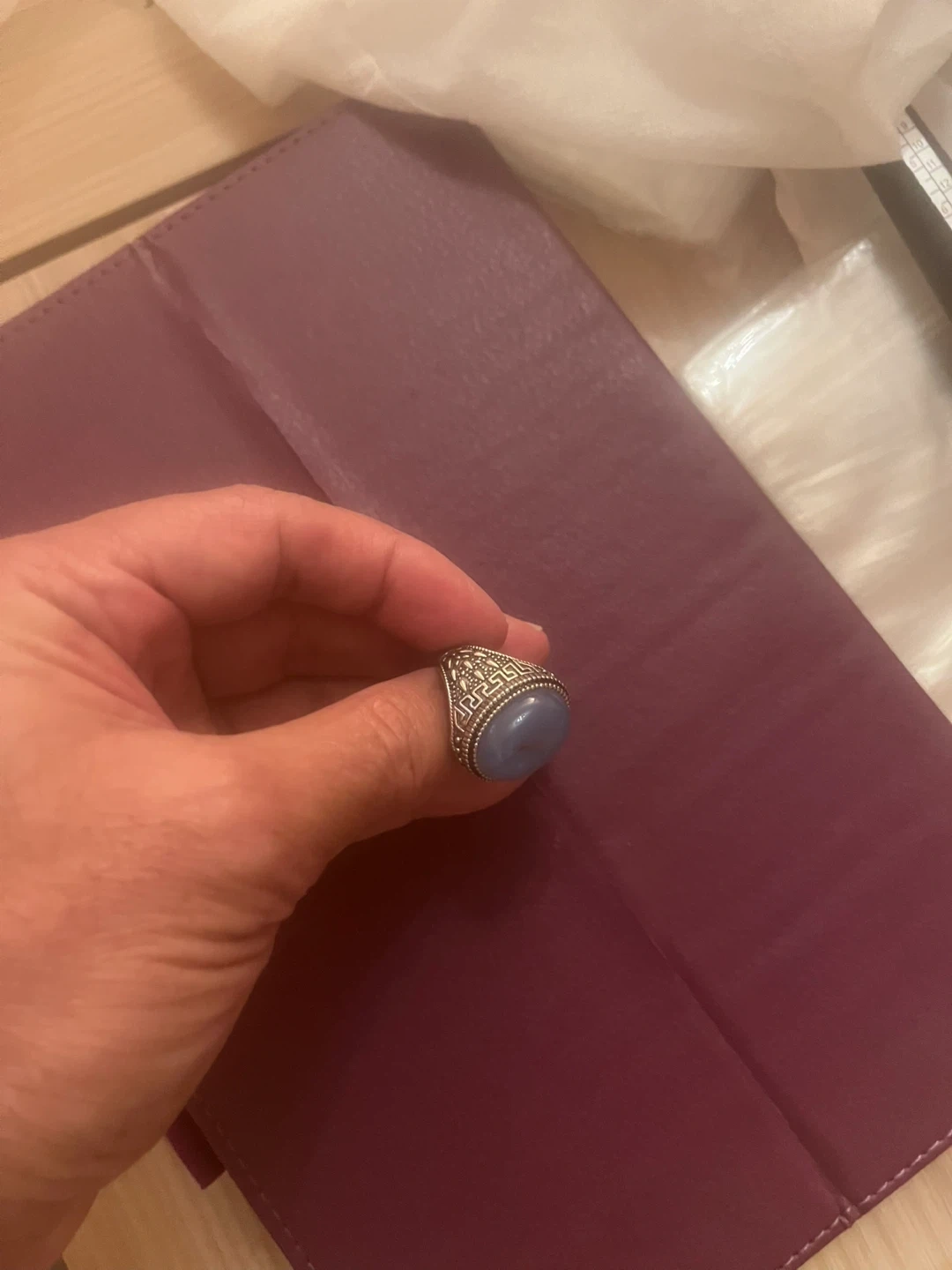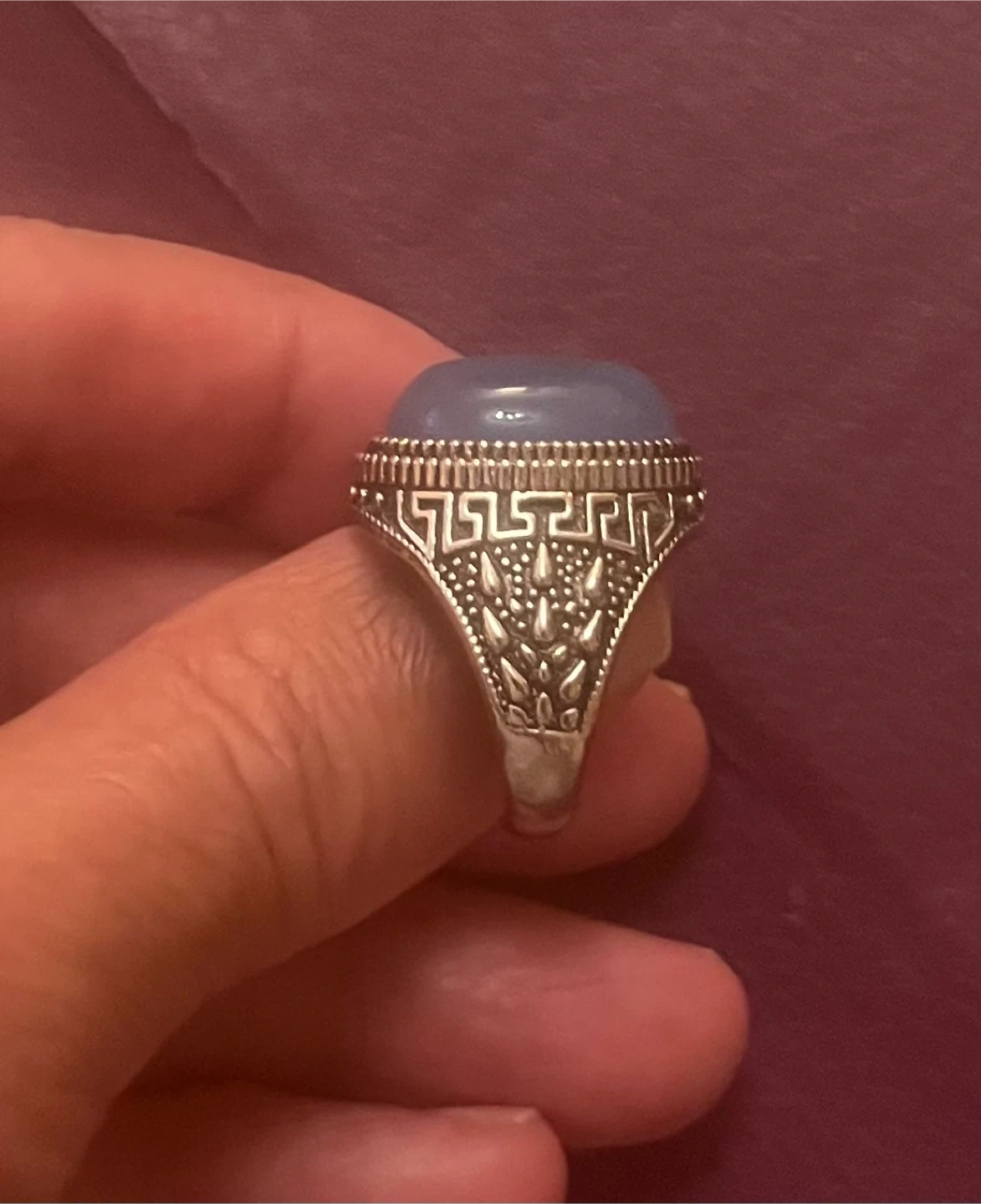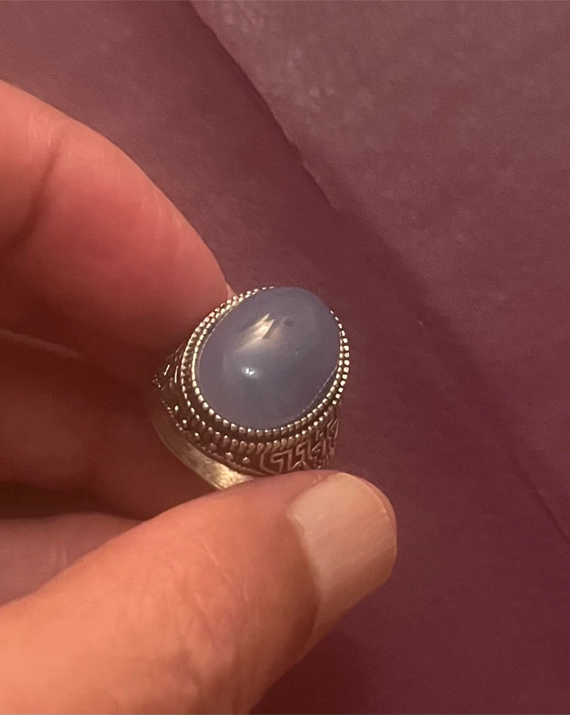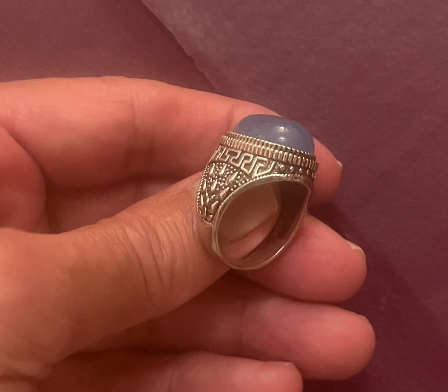 A vintage ring with a light blue stone. It features a unique design around the band. In good condition and ready for a new home