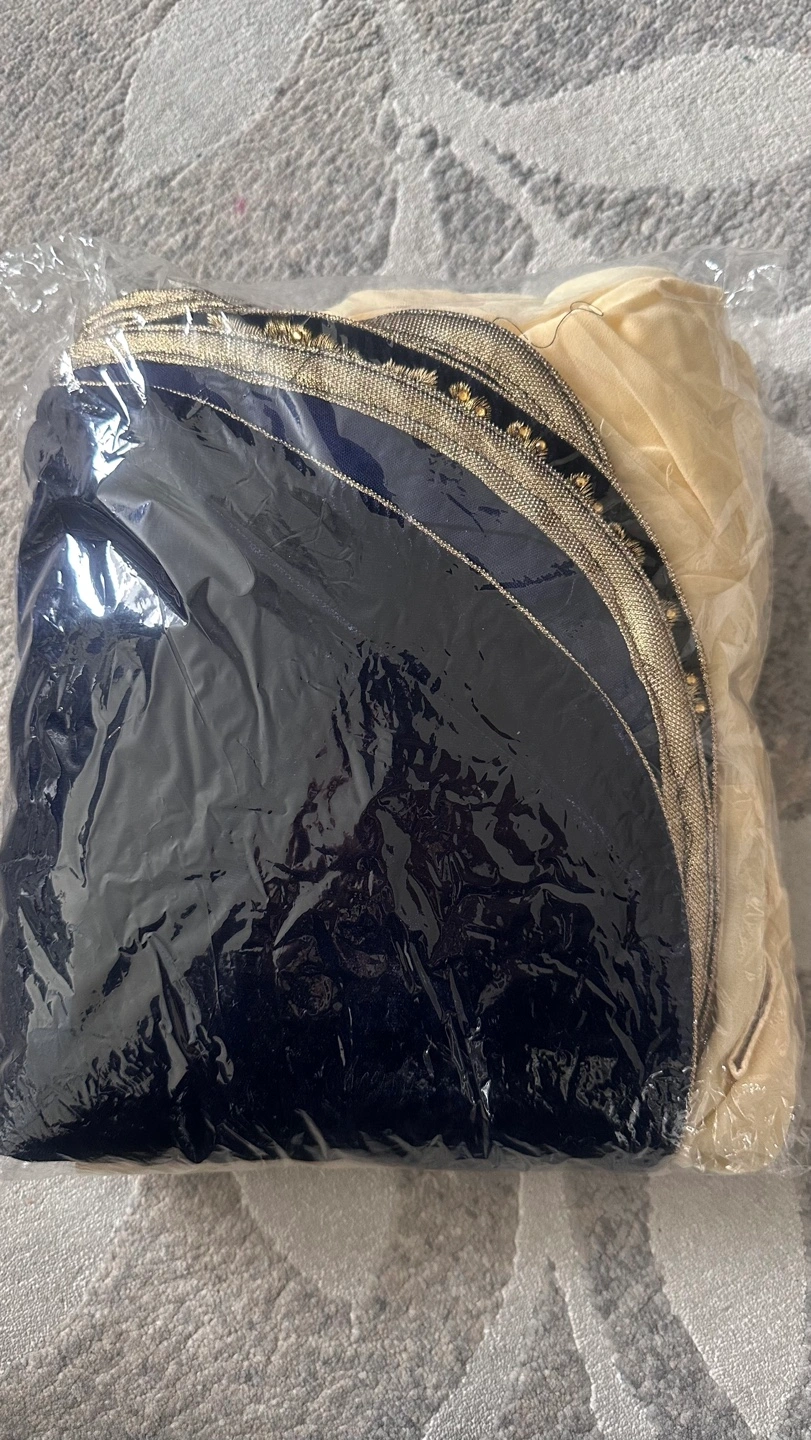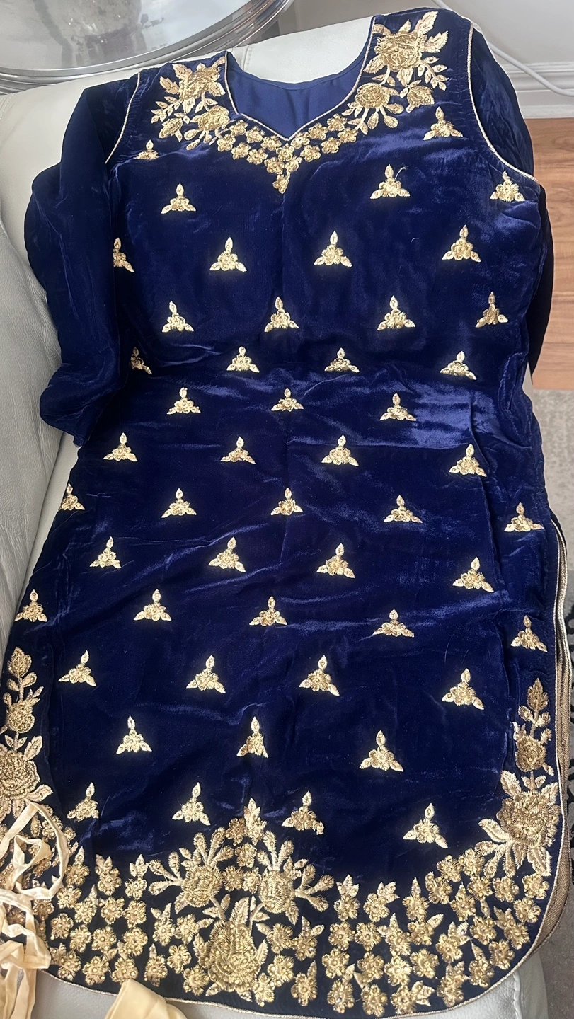 Stunning navy blue velvet salwar kameez. Features intricate gold embroidery. Includes matching pleated cream-coloured pants. Gorgeous outfit, perfect for special occasions.