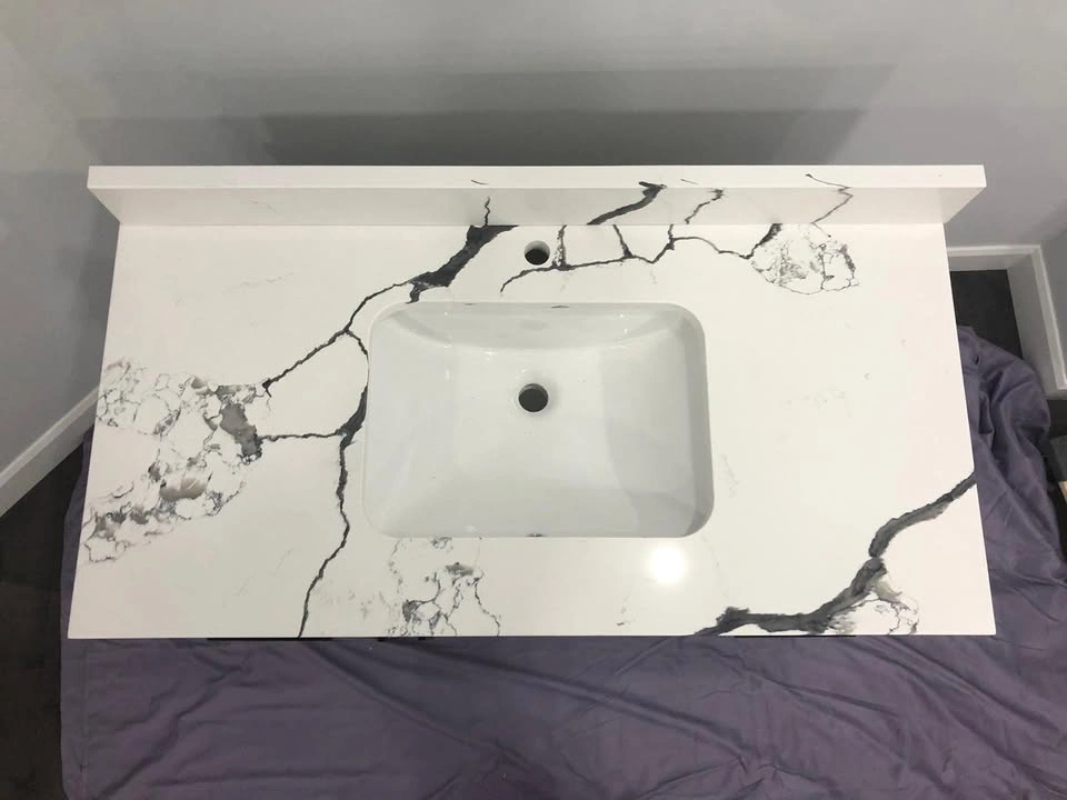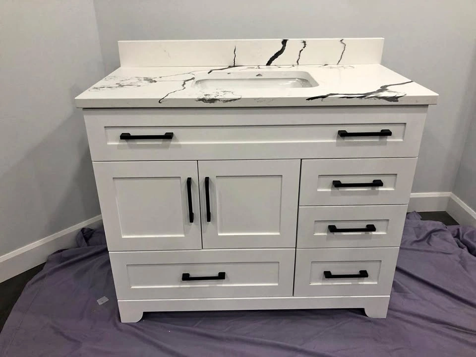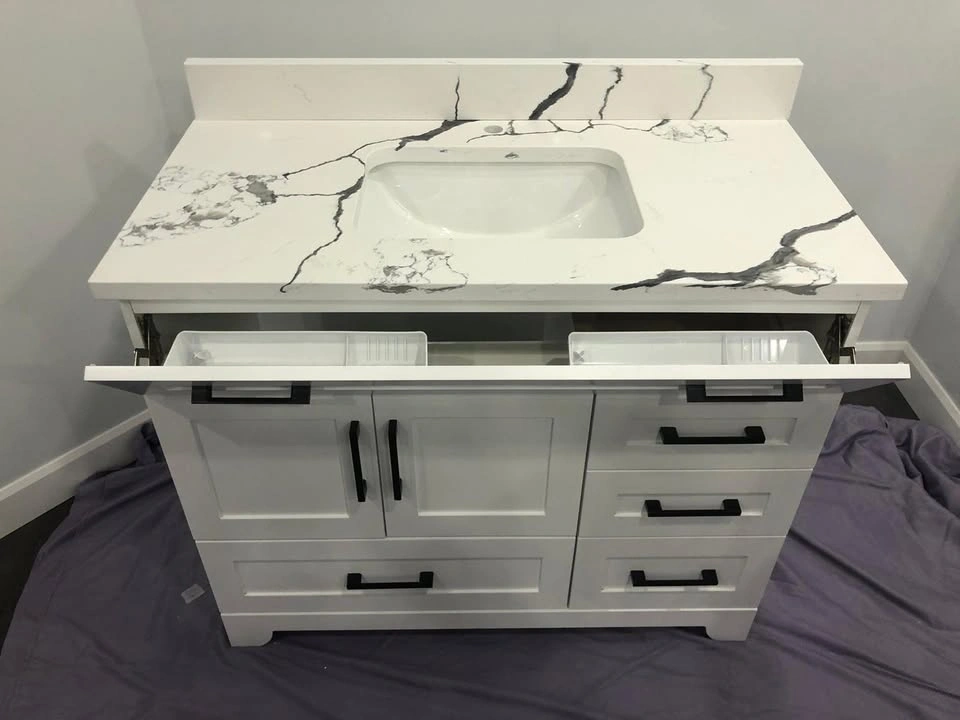 Very Attractive free-standing bathroom vanity. Brand New. Never used. Comfort Height Height: 36 in Width: 43 in Depth: 22 ¾ in Stylish white Quartz countertop with black veins. White cabinets and drawers with tip out tray. Soft close doors and drawers. Single Undermount Square Sink Maximized storage space. Extra side splashes included just like the “back splash” shown in the picture, can be used on either left, right or both sides Pickup only.