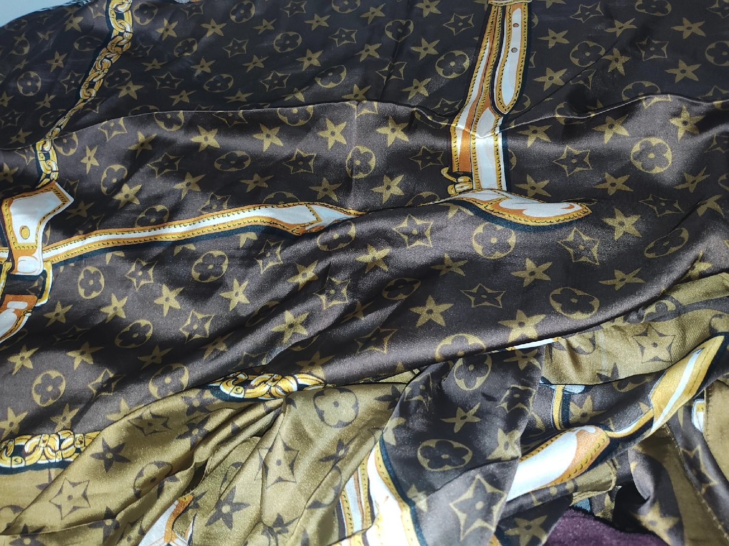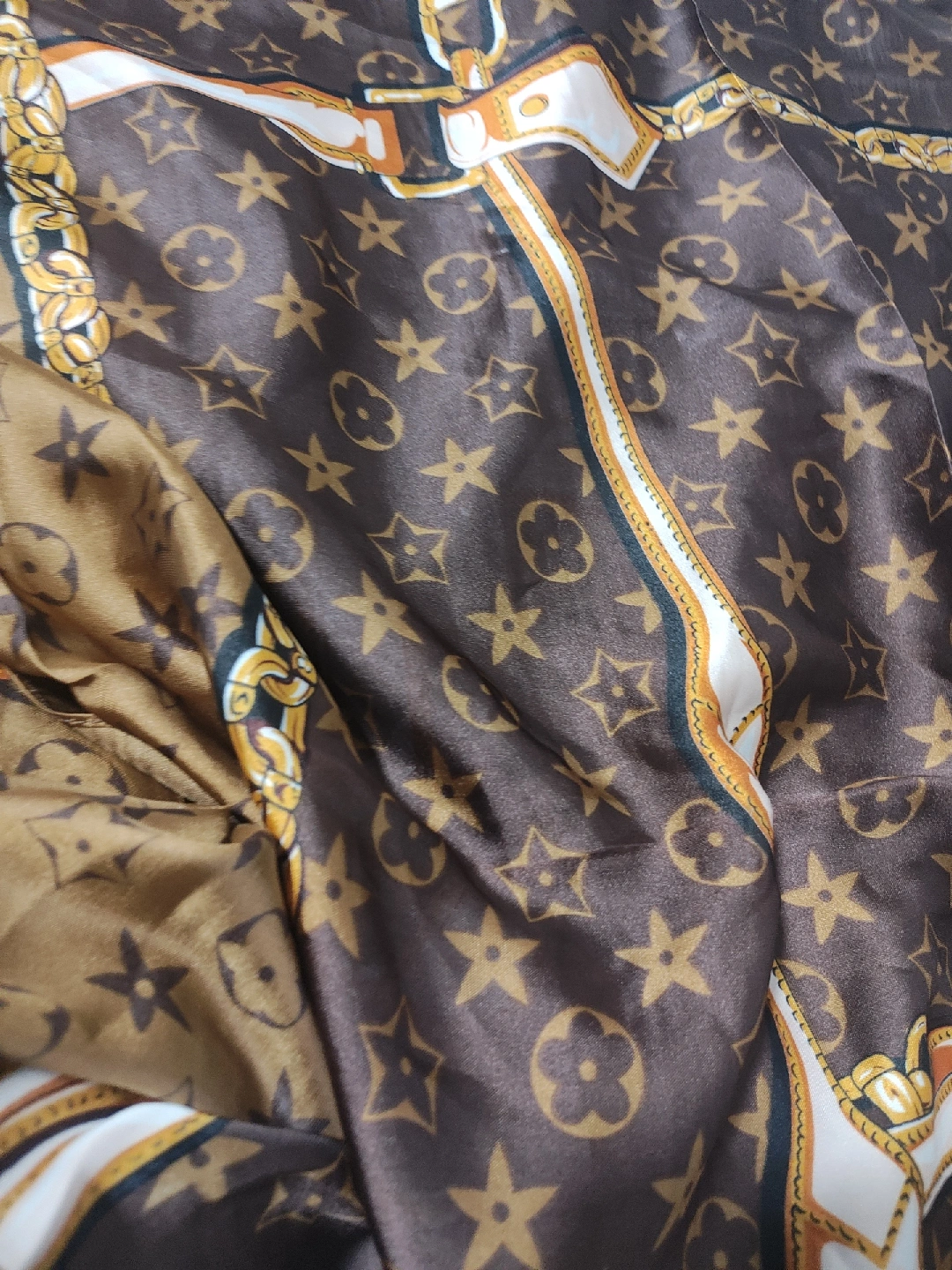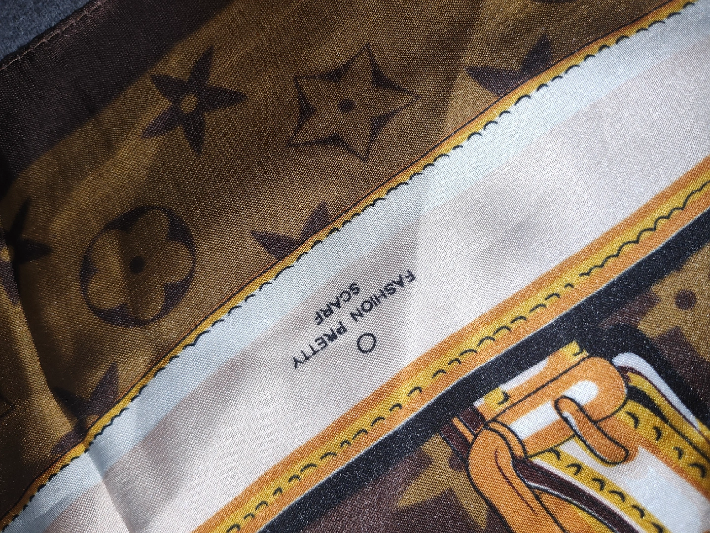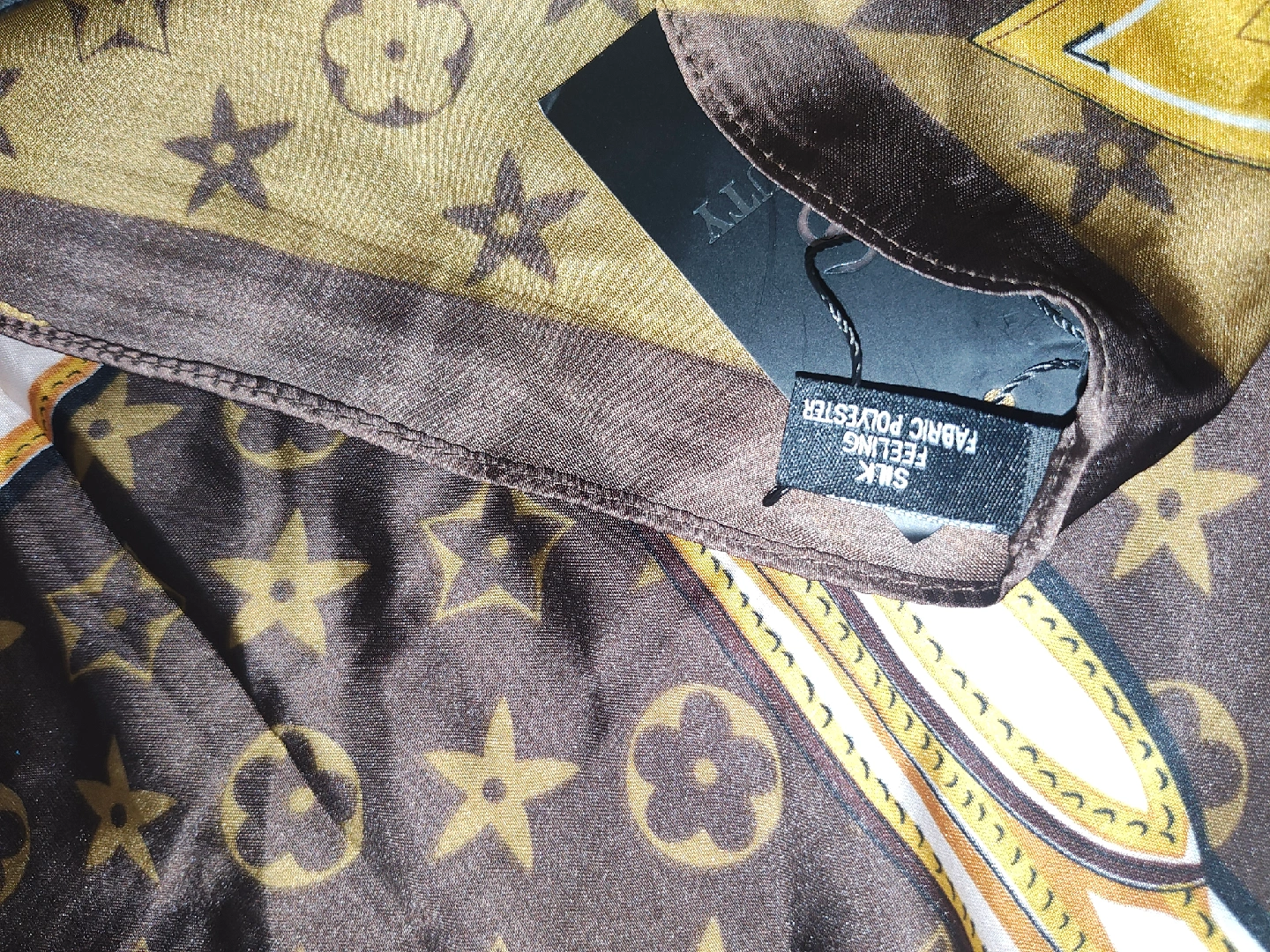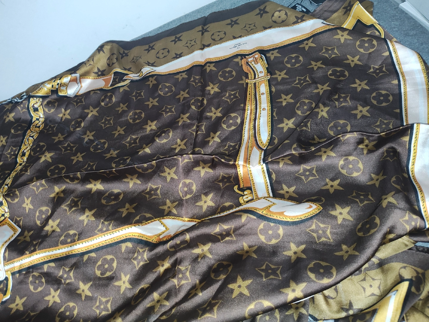 Here's a beautiful scarf with a silk feeling fabric made of polyester! It features the classic Louis Vuitton pattern in brown and gold tones. It's in great condition and ready to add a touch of luxury to your wardrobe