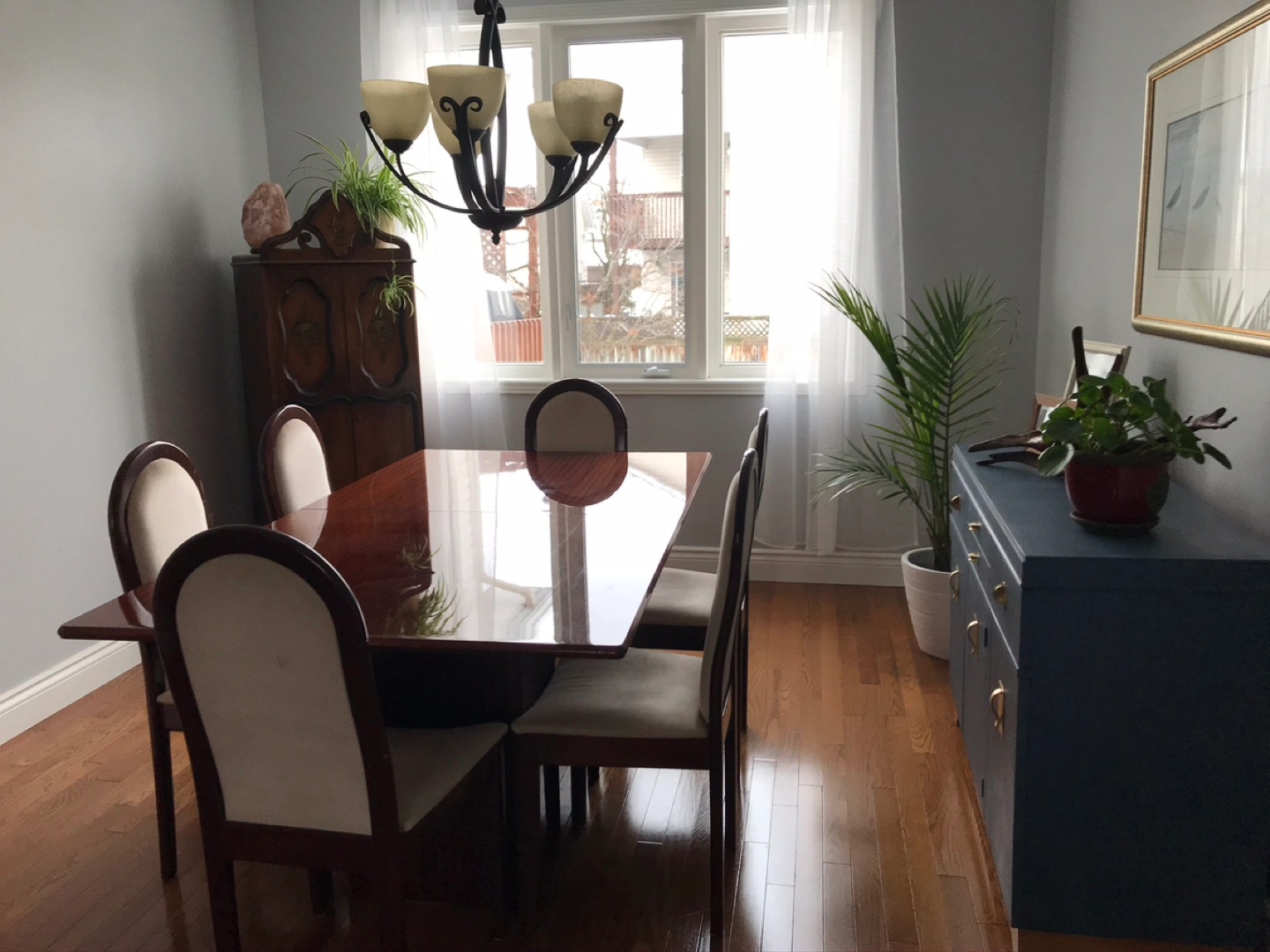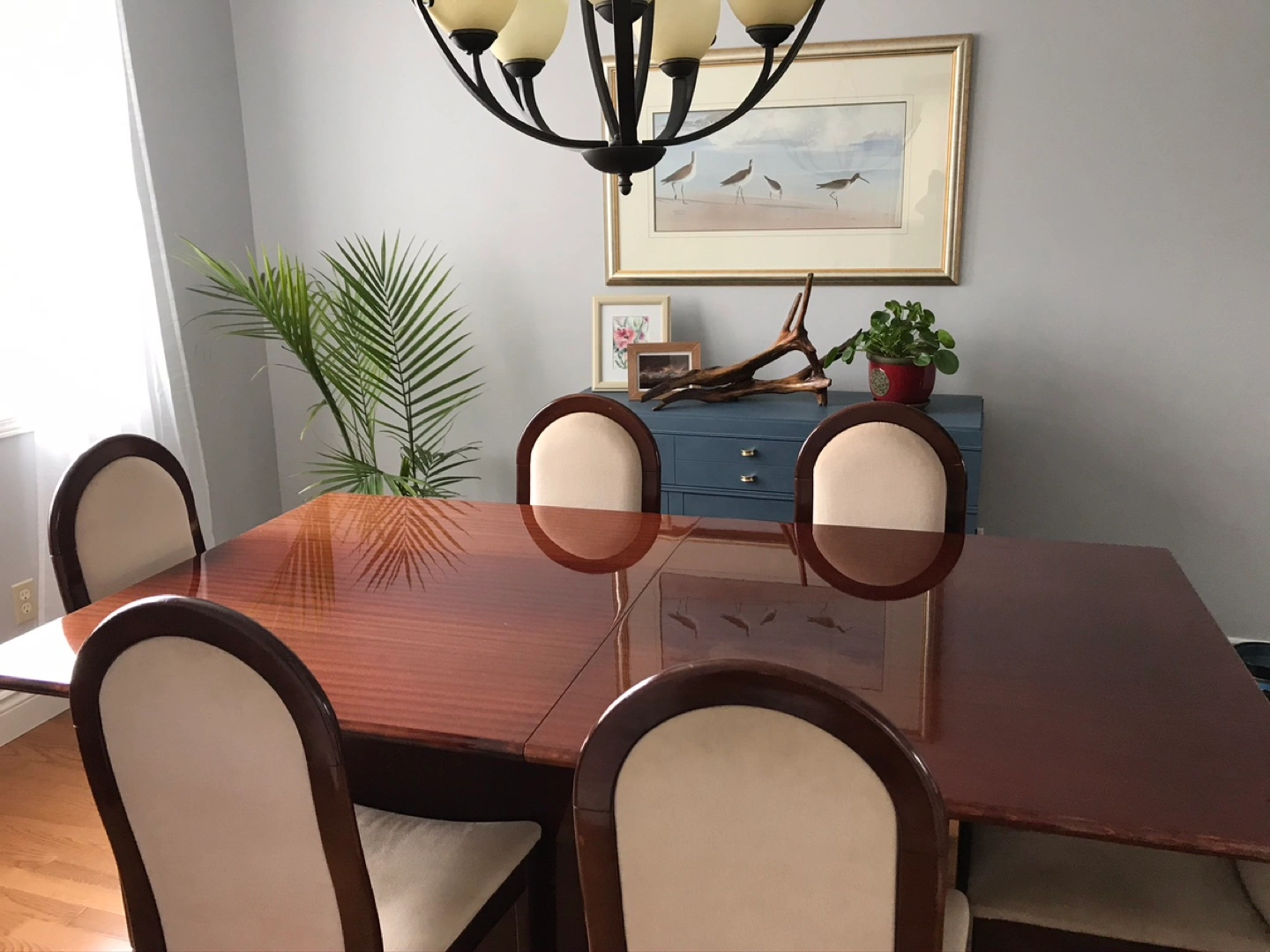 Stunning dark mahogany dining table, six chairs included. Table extends by 18 inches. Solid wood construction. Elegant design. Perfect for formal or casual dining.