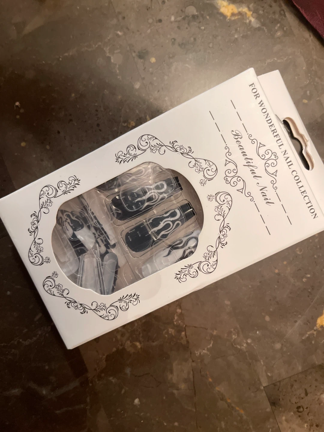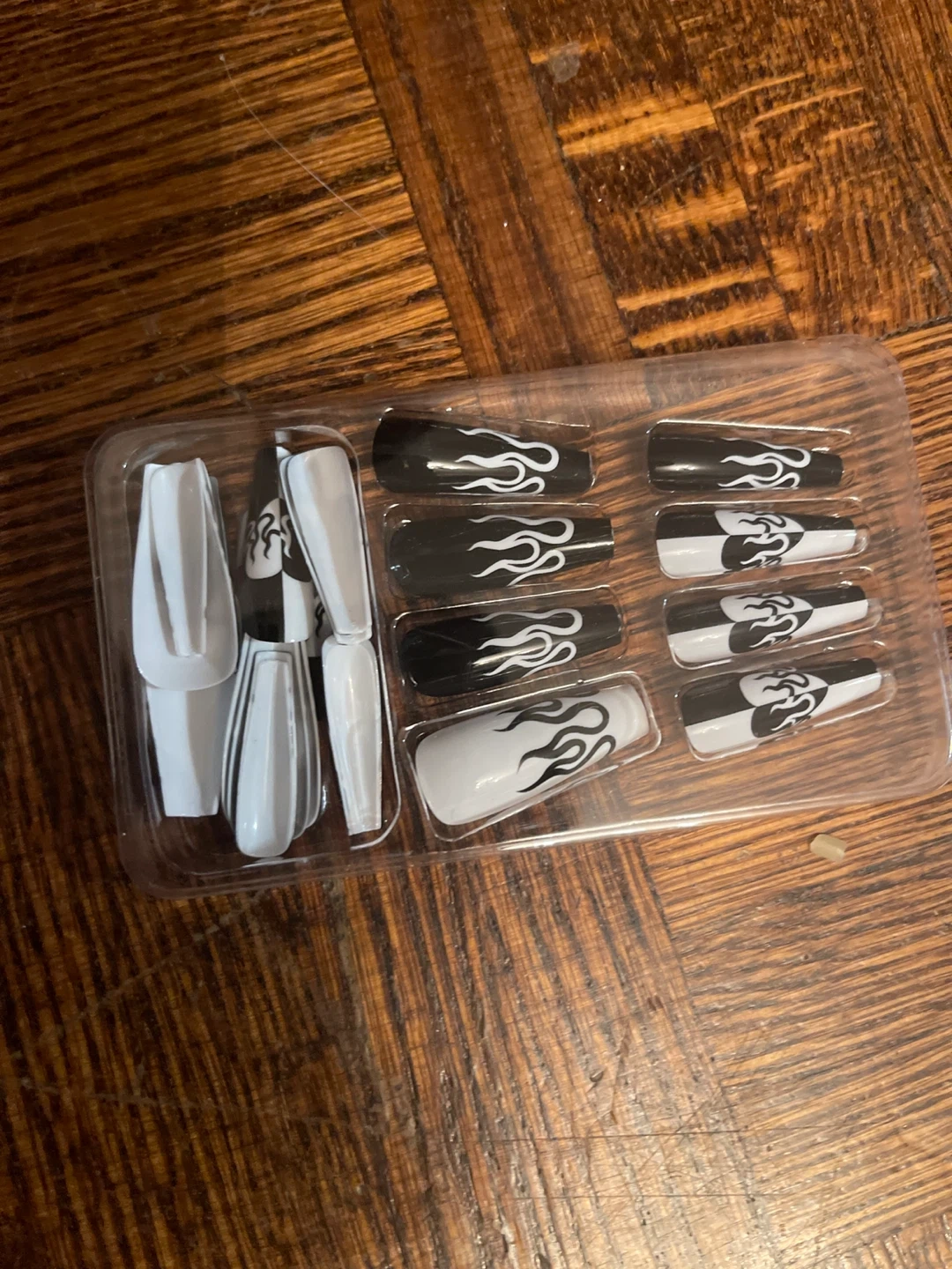 Selling a set of beautiful nails with a striking black and white flame design! Perfect for adding a touch of edgy style to your look. These nails come in their original packaging, ensuring they're in great condition and ready to wear