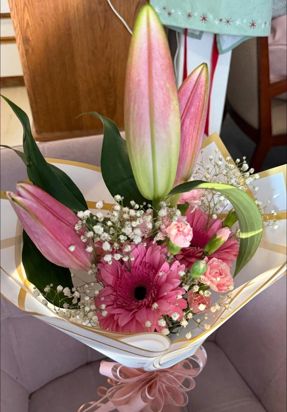 Lovely pink flower arrangement. Includes lilies, gerbera daisies, carnations, and other fillers. Wrapped in elegant paper. Perfect gift.