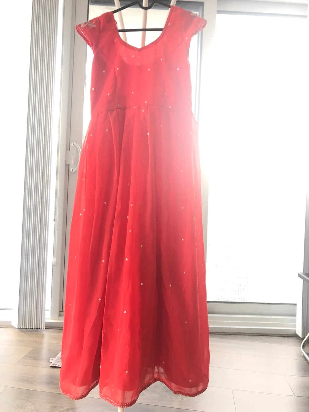 Gorgeous red girl's dress. Intricate silver embroidery and embellishments. Short sleeves. Flowy A-line silhouette. Perfect for special occasions. Custom-made! Negotiable!