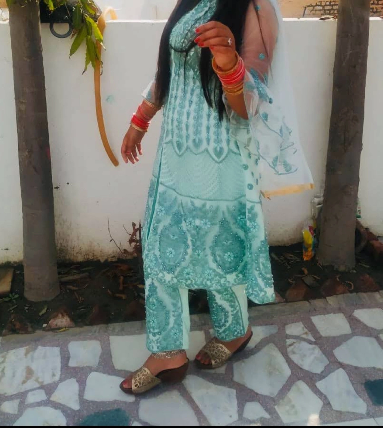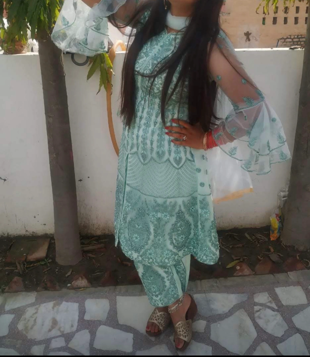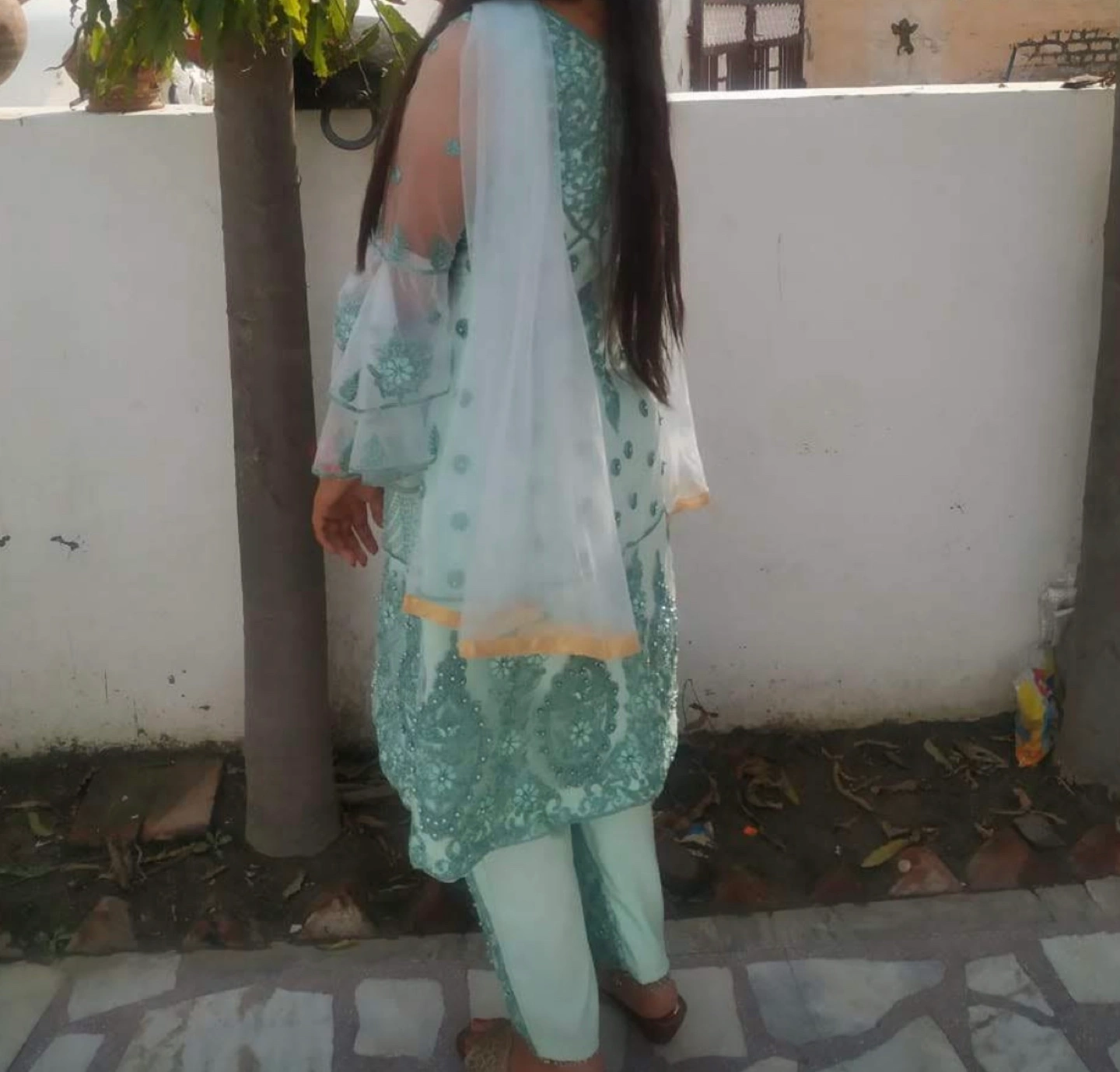 Stunning seafoam green palazzo pant kameez. Features intricate embroidery, bell sleeves, and sheer dupatta. Perfect for special occasions like eid and diwali