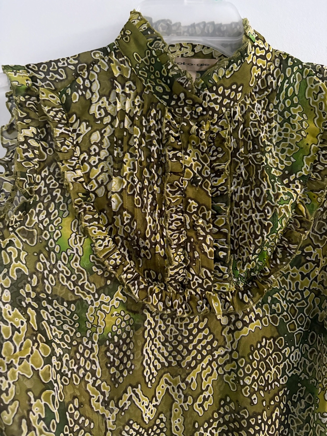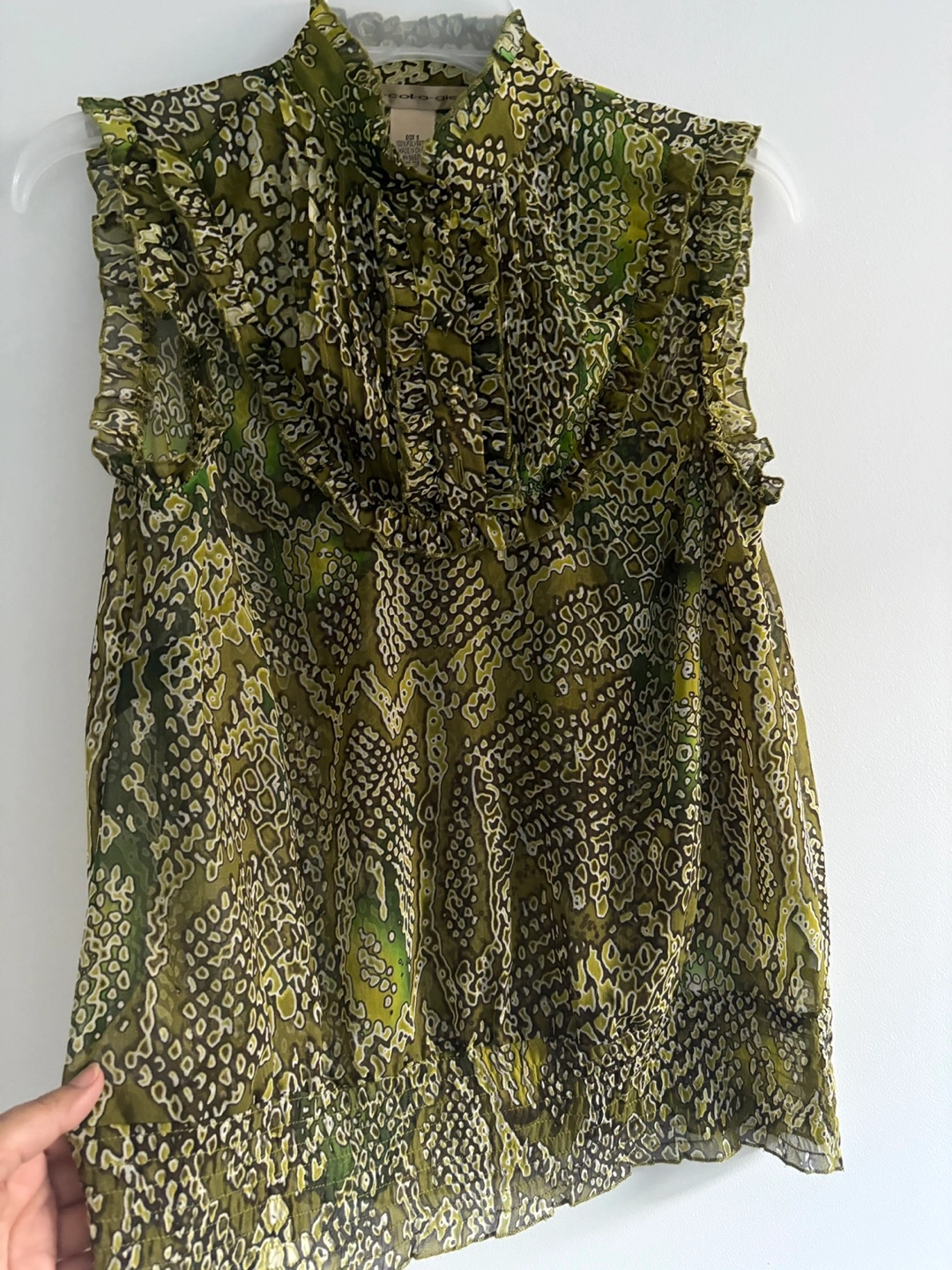 This is a beautiful blouse in olive green. It has a unique pattern and a ruffled high neckline, perfect for adding a touch of elegance to your wardrobe. From no smoking/ no pet home.