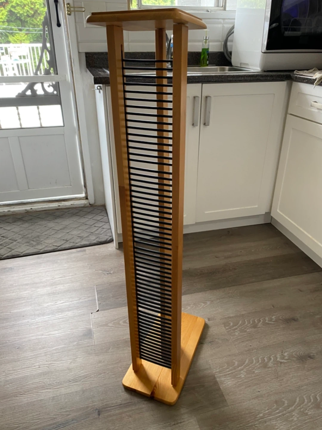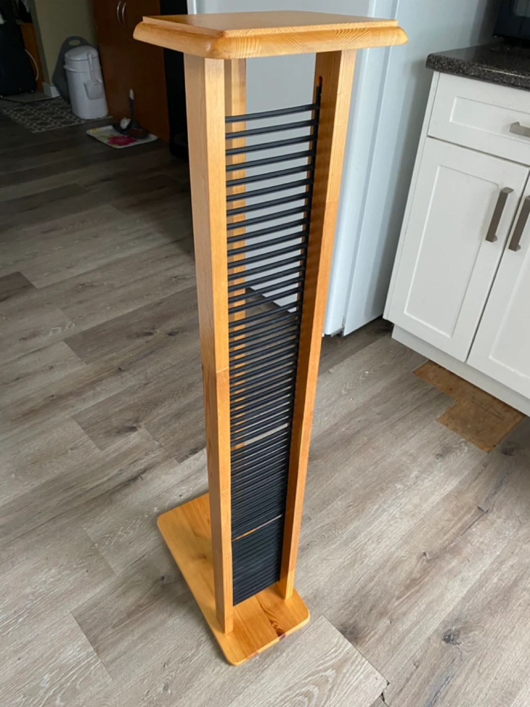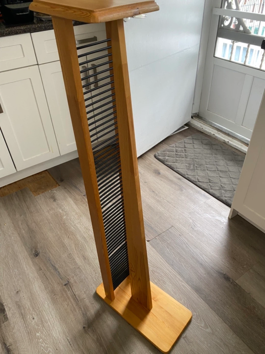 Selling a wooden CD rack stand. Put together for these pics. It holds 60 CD’S , & perfect for organizing your CD collection. The stand is made of solid natural oak with black vynol dividers. It's a stylish and functional piece for any music lover!