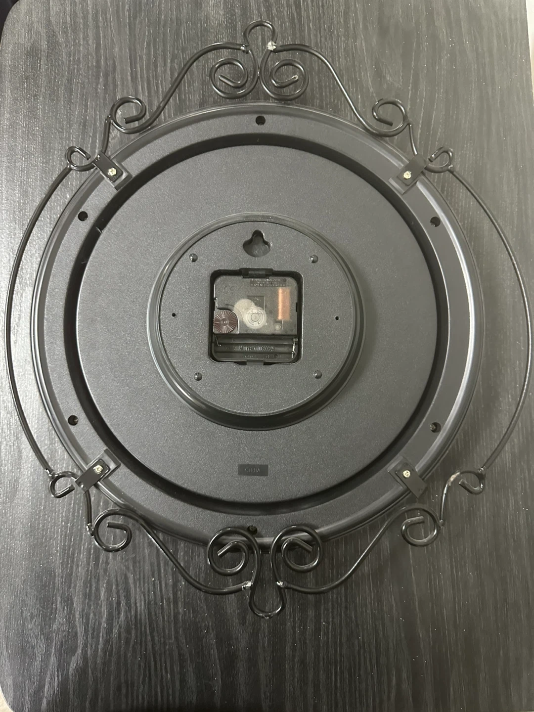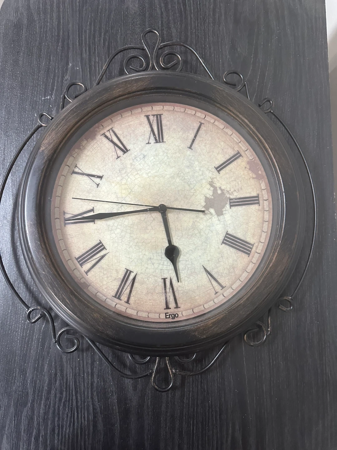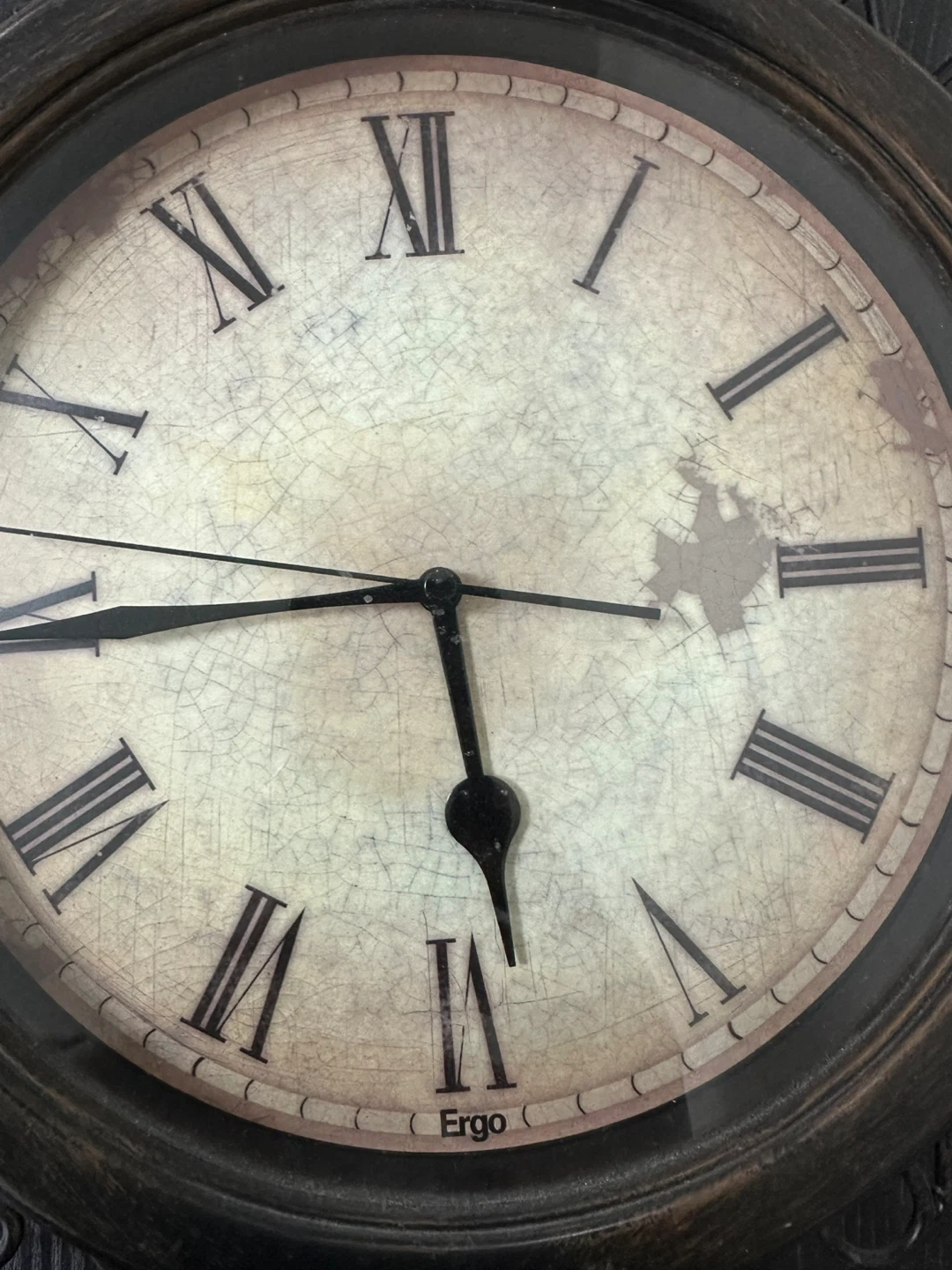 Selling a wall clock from Ergo! It has a vintage look with Roman numerals and a decorative frame. The clock face has a unique crackled texture. It's in good working condition and would look great in any room!