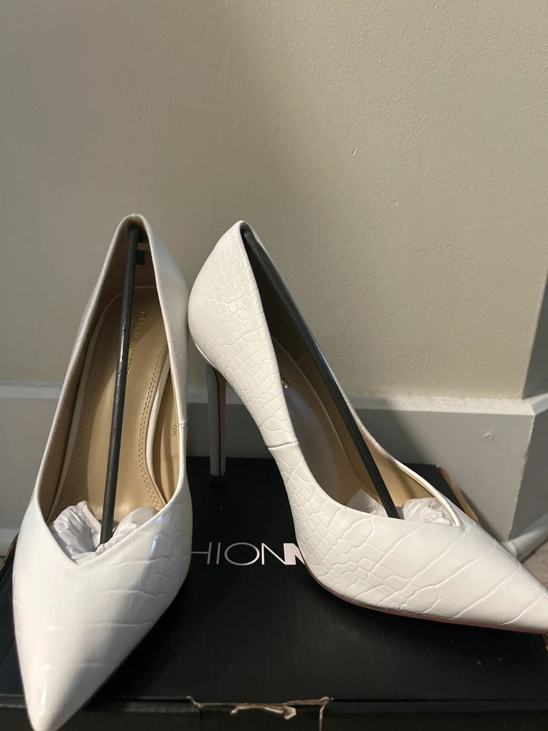 Selling this beautiful white maxi tulle dress, in brand new condition, tag attached. Perfect for any occasion. Size: M Also selling a pair of fashion nova heels, perfect condition. Never worn. Size: 10