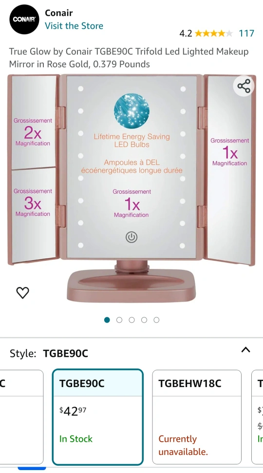 Trifold mirror with LED lights. Includes 1x, 2x, and 3x magnification that folds open and lights up. Good as new just don't have the box anymore. Product details: 🧡 * Brand: CONAIR * Product Dimensions: 7.9L x 5.5W cm * Magnification: centre panel 1x; right panel 1x; left panel 2x and 3x split * 16 lifetime energy saving led light bulbs * 3 touch light settings: low/med/high. On/Off with touch control on mirror surface * Adjustable wide angle viewing (rotates up to 40 degrees) for flawless makeup application and grooming. * Base tray to store accessories or makeup 🎗 Delivery to certain locations is available free of charge if not too far, if interested please contact
