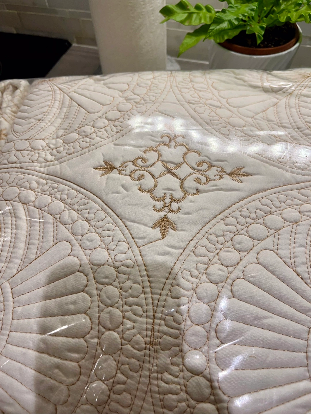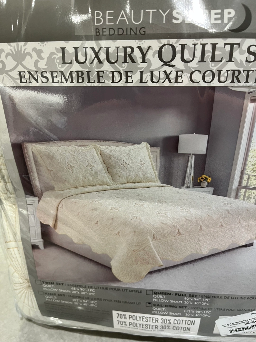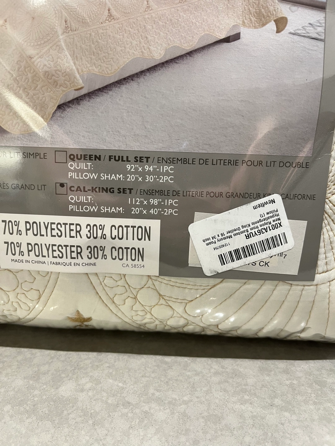 Cream coloured quilt set. 70% polyester 30% cotton. Includes quilt and two pillow shams. King size, New with tags.