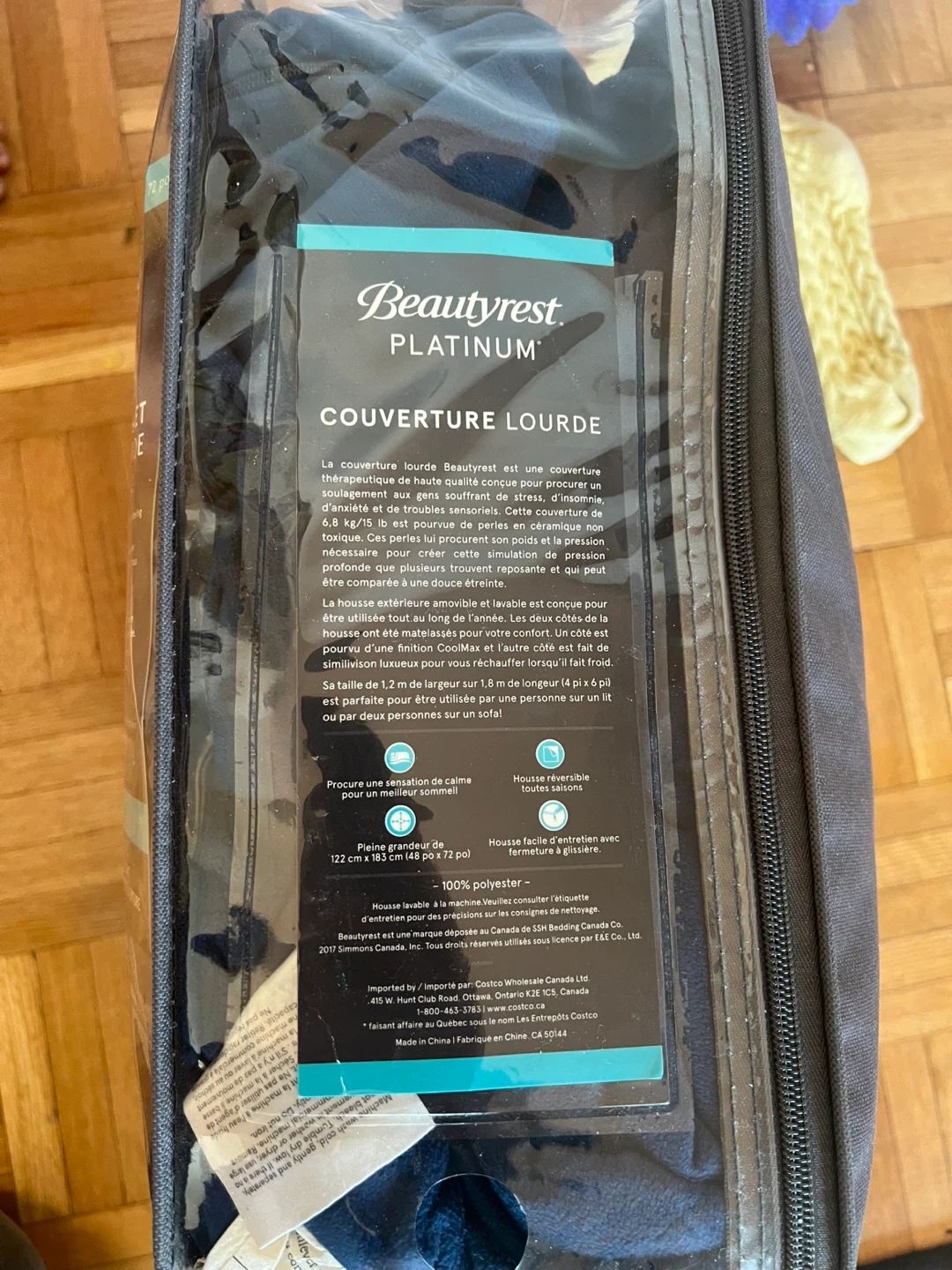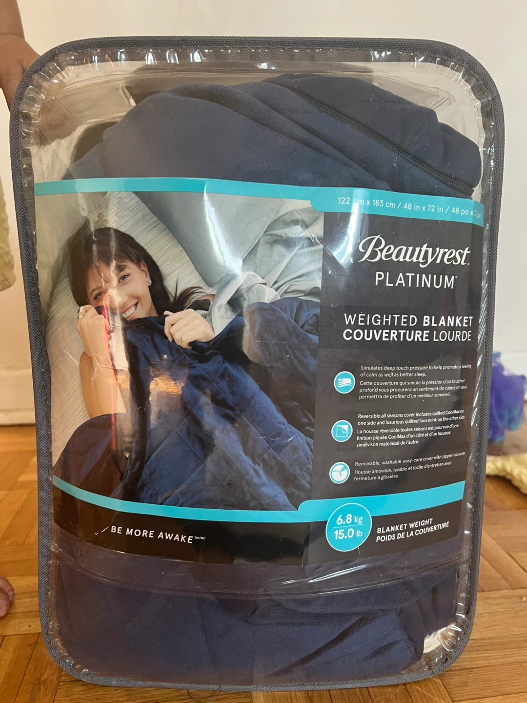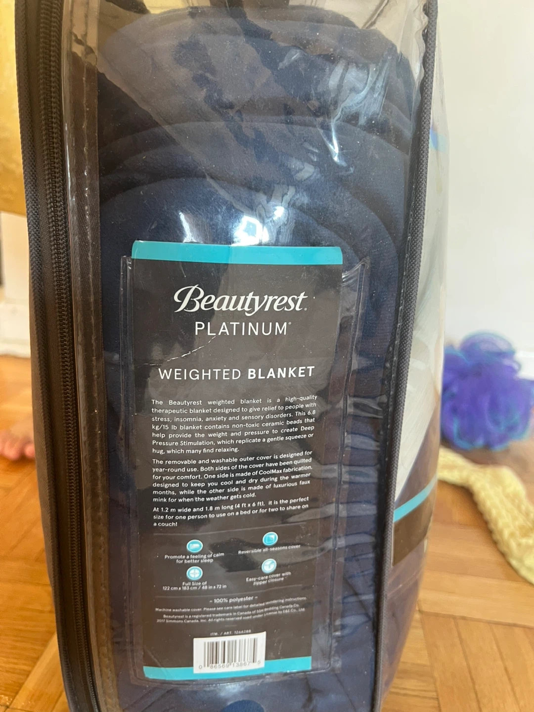 Beautyrest Platinum weighted blanket for sale! It's designed to relieve stress, insomnia, and anxiety. The blanket measures 122 cm x 183 cm (48 in x 72 in). It's made of 100% polyester and contains non-toxic ceramic beads. It's perfect for one person on a bed or two to share on a couch! The cover is removable and washable too