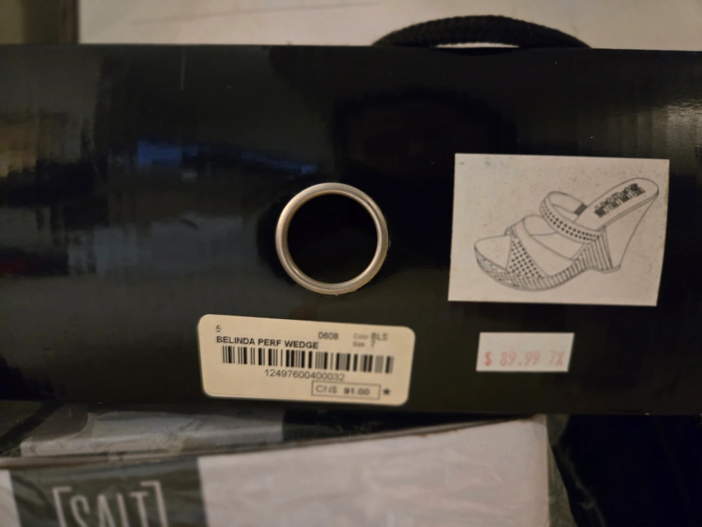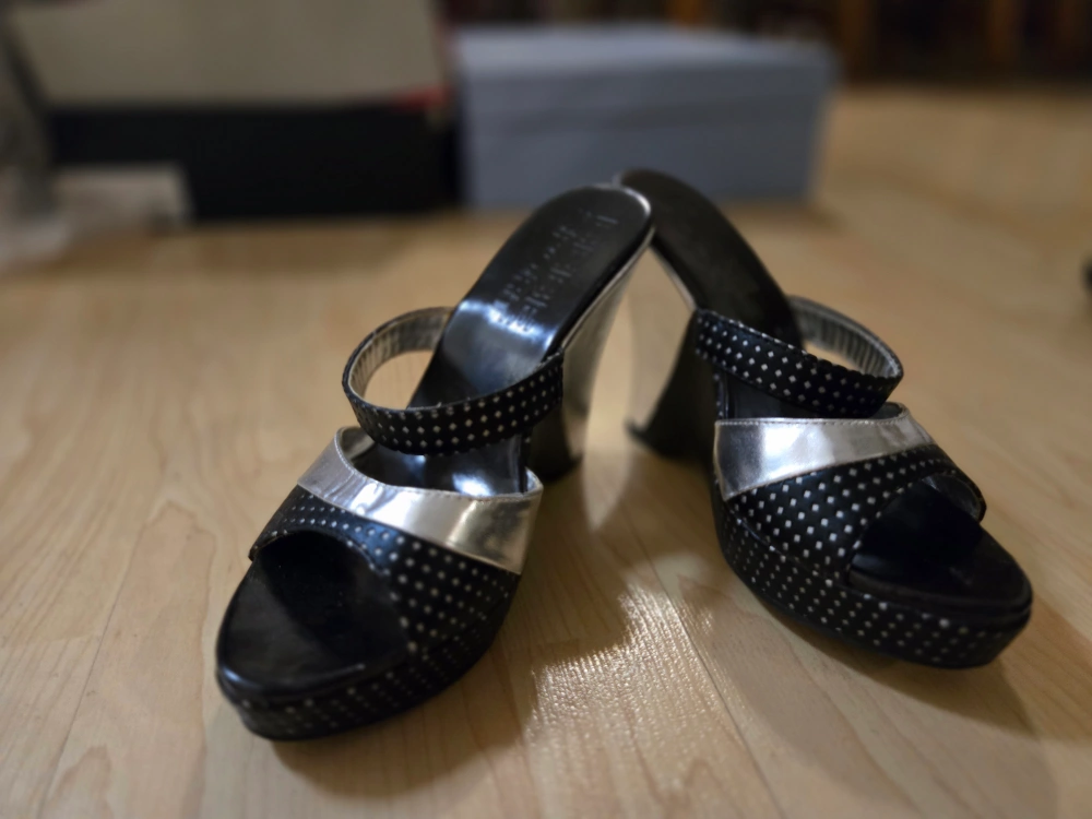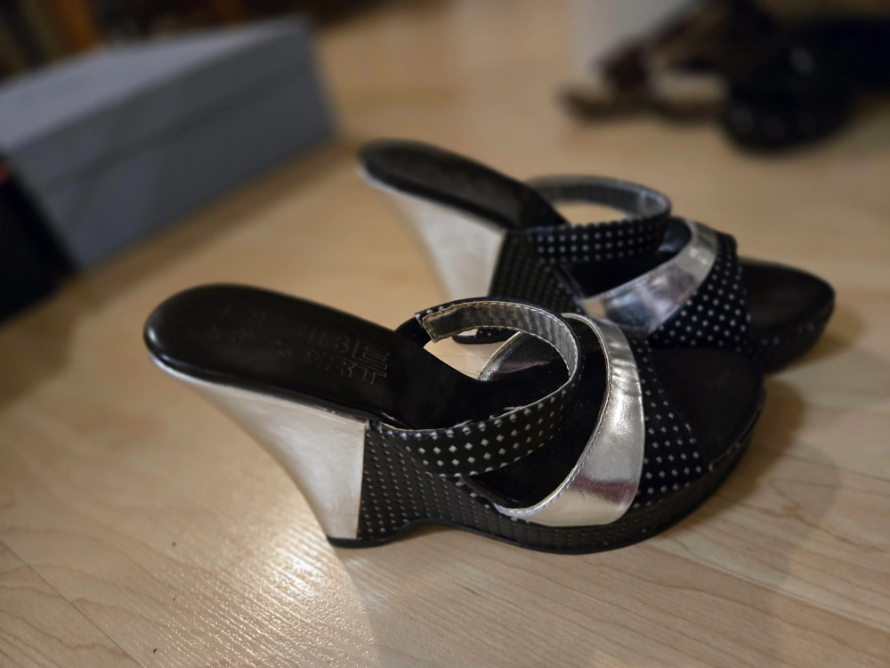 Selling a pair of Bebe Belinda Perf Wedge heels in size 7. They're black with silver accents and come with the original box. Retails for $89.99 Reason of Selling: I am moving to new place. Only available for pick up.