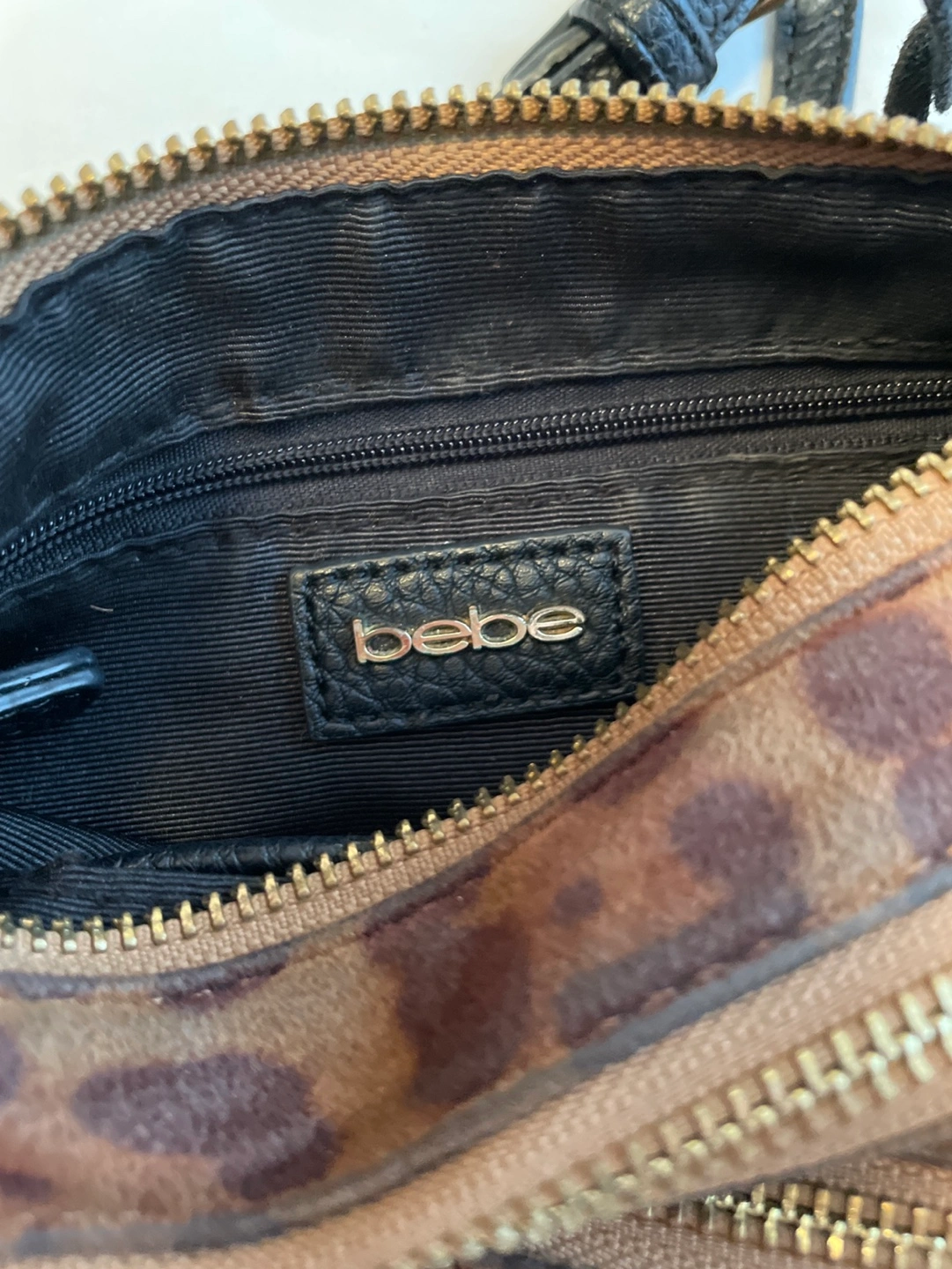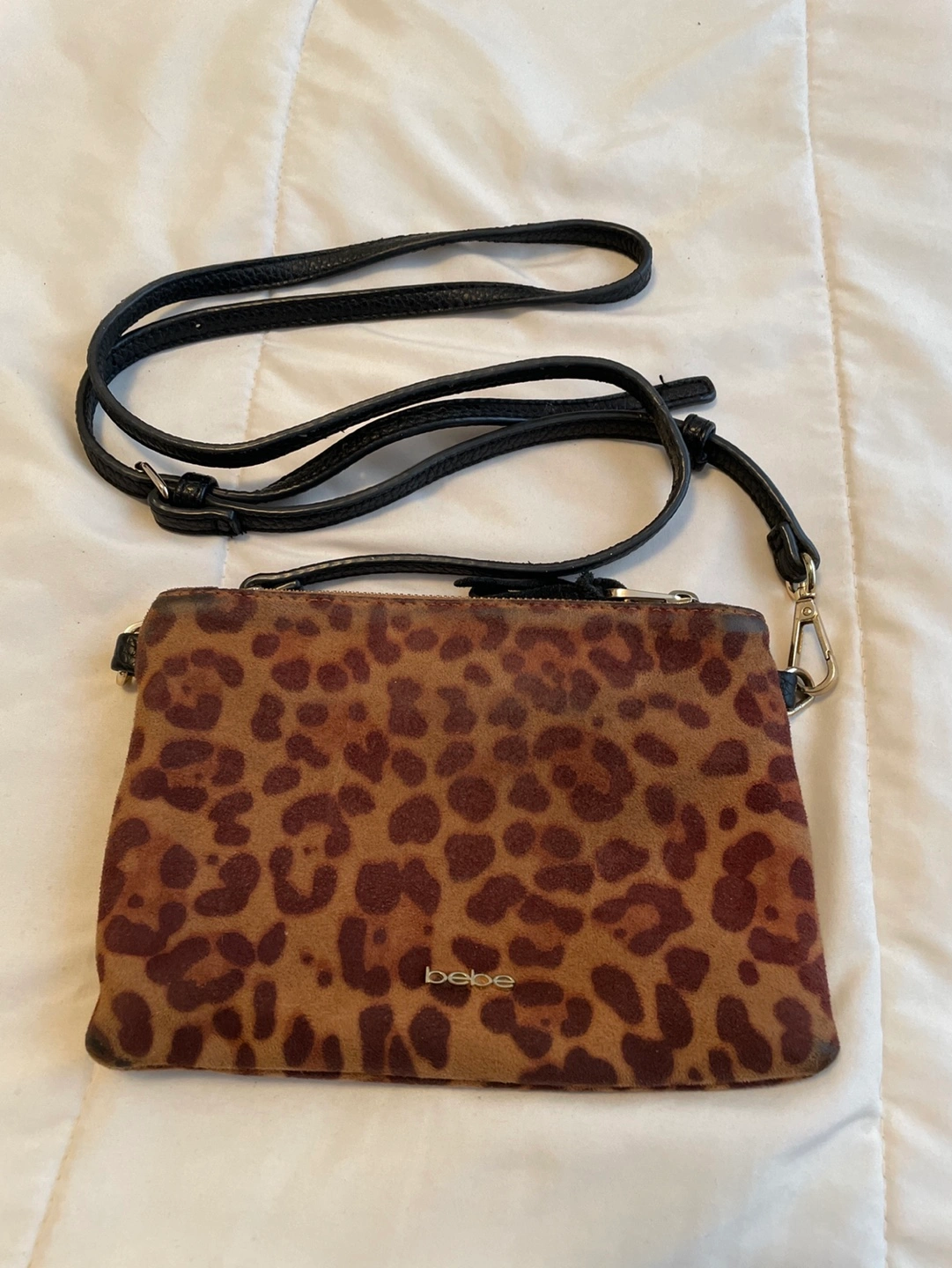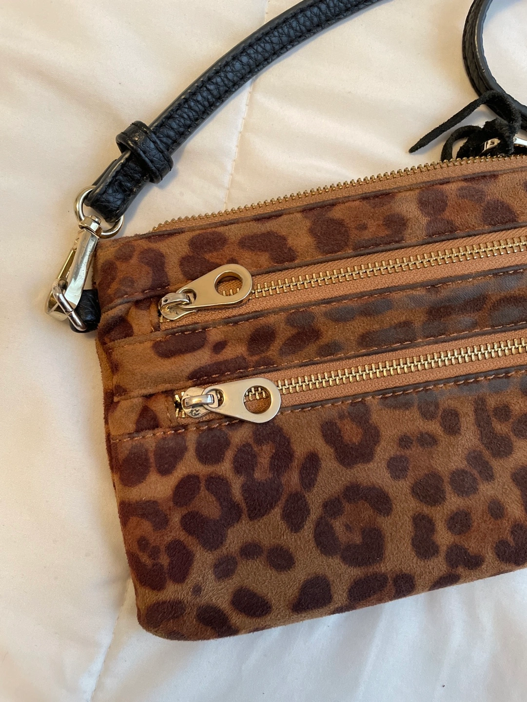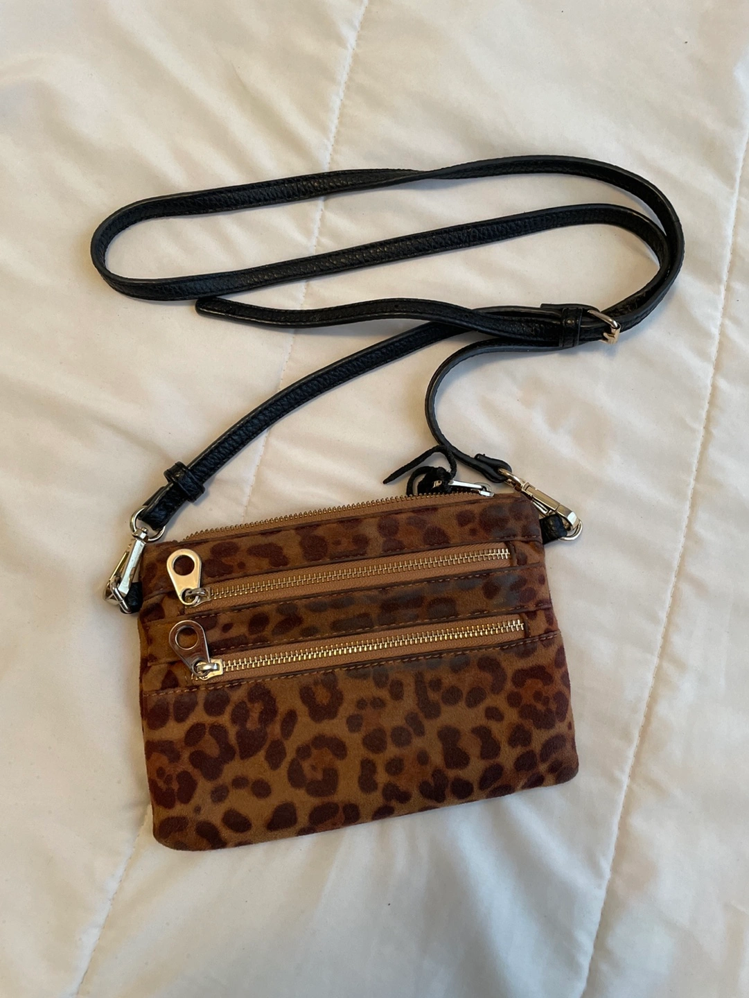 Adorable crossbody bag. Features a leopard print leather. Three zippered compartments. Black leather strap. Small and compact. Preloved with a few wears but still gorgeous.
