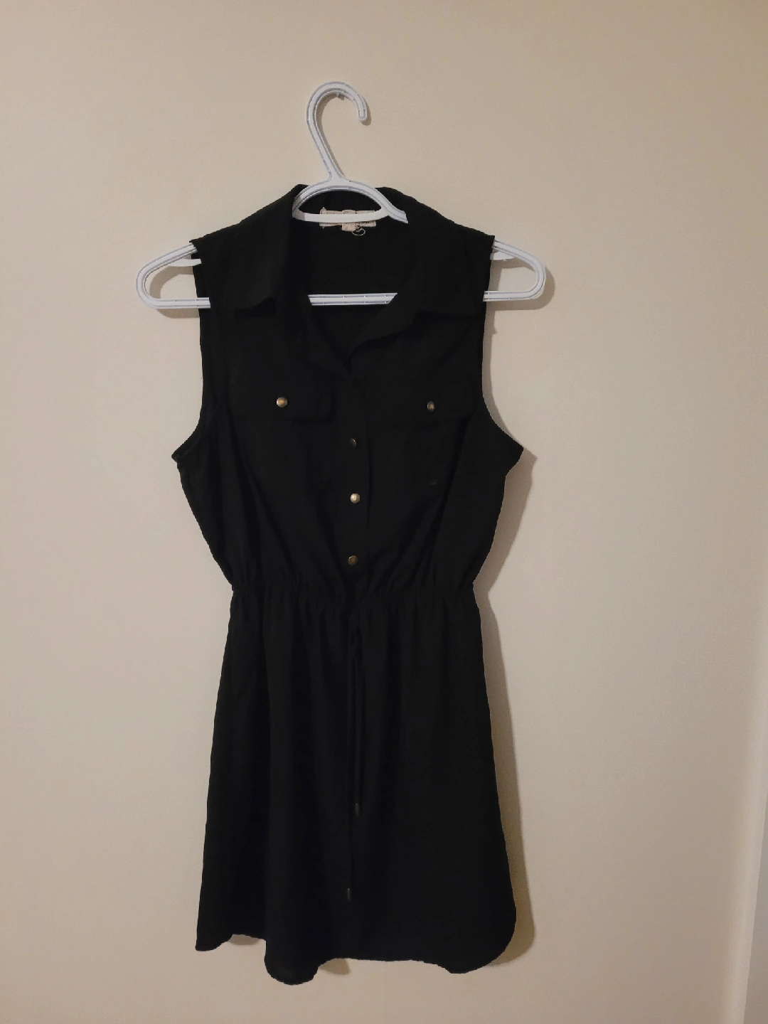 Selling a cute black sleeveless dress from Bebop! It's a size small and in great condition. Perfect for a casual day out or dressing up for an evening event. It has a button-up front and a drawstring waist for a flattering fit