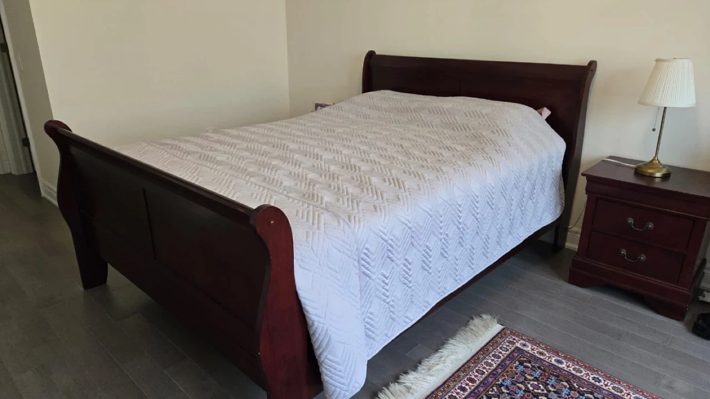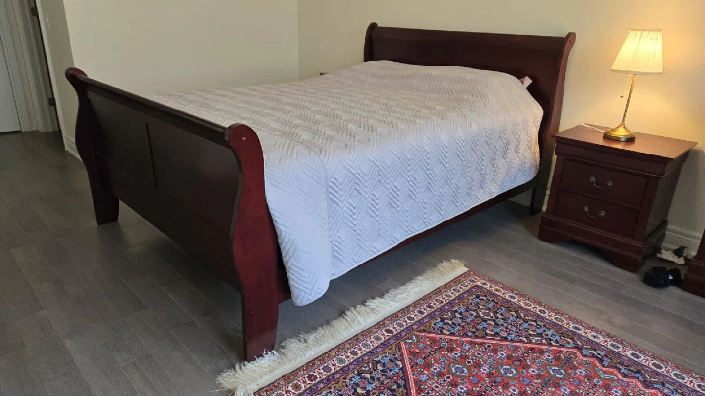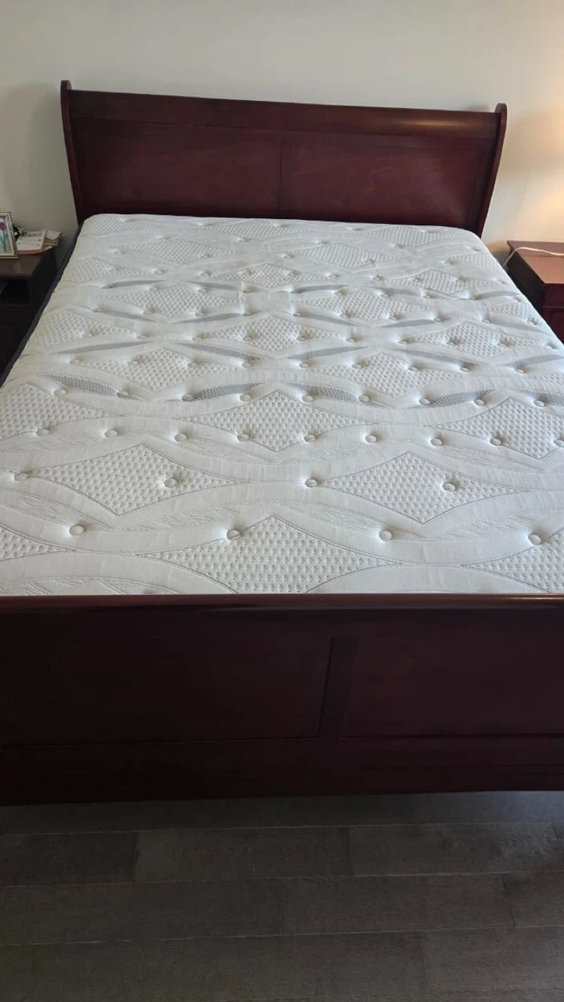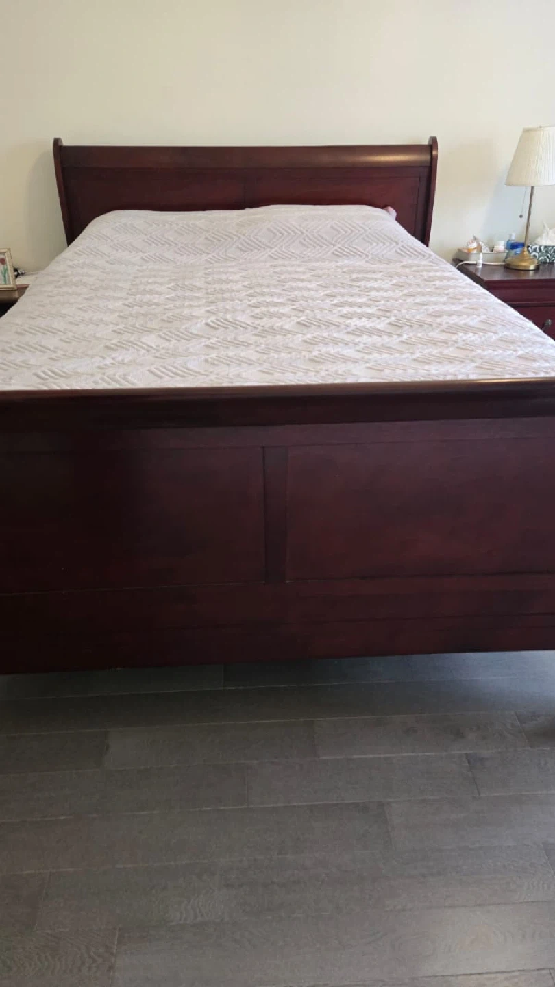 Details of bed frame: Material: wood 🪵 Size: Queen Price: 300$ (the price of the brand new is 700$) *good condition no marks or scratches Details of mattress: Brand: Sealy Proback ( posturepedic technology ) 🪶 Size: Queen Price: 450$ *it comes with a cover and it looks and feels just like Day 1 ‼️ We are also selling the drawer with its mirror if you need it to be a set.