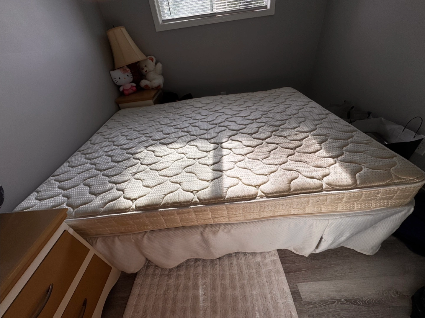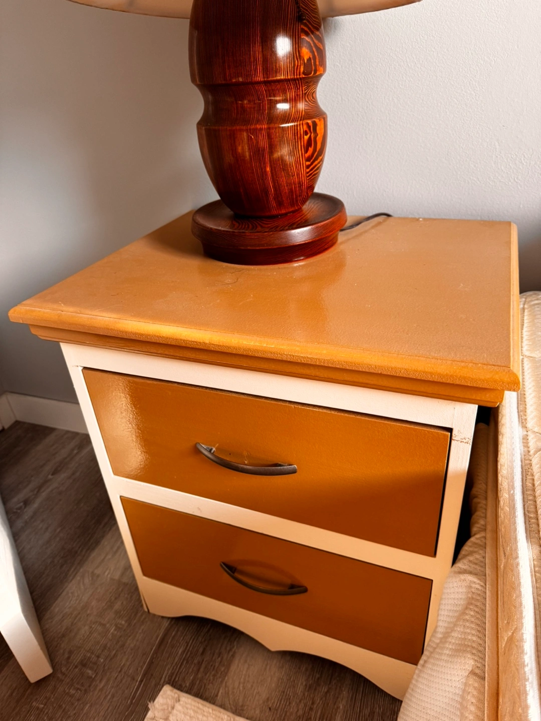 Selling a bed frame and the mattress and two charming wooden table lamps and matching nightstands. The lamps features a classic design with a warm-toned shade, perfect for creating a cozy atmosphere. The nightstands offer convenient storage with two drawers. A lovely bedroom!