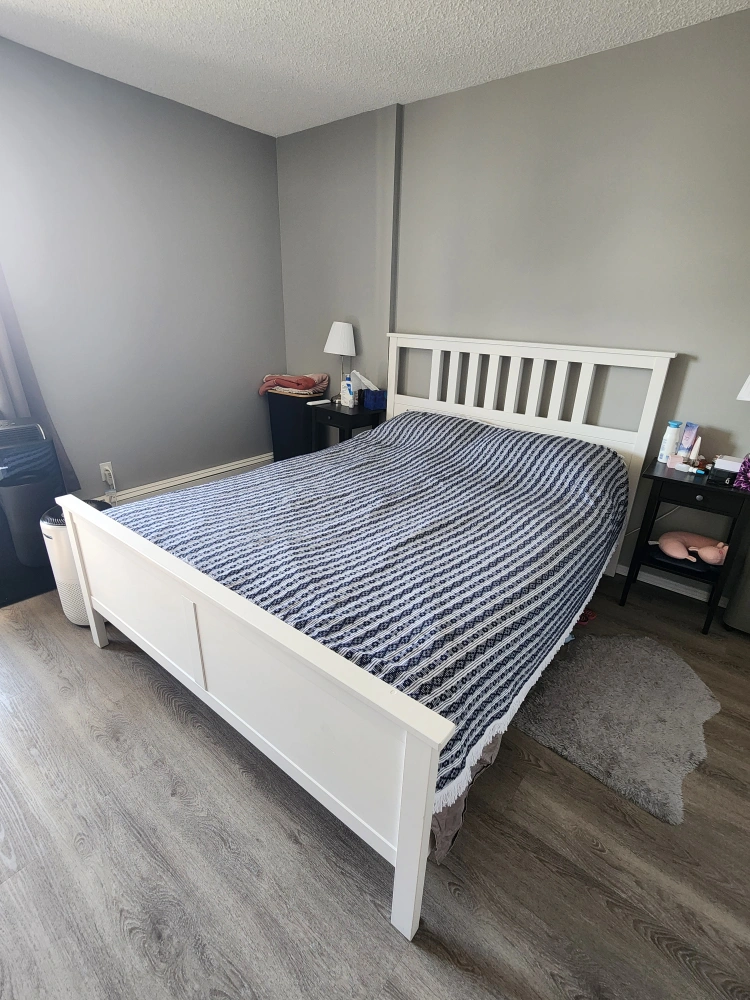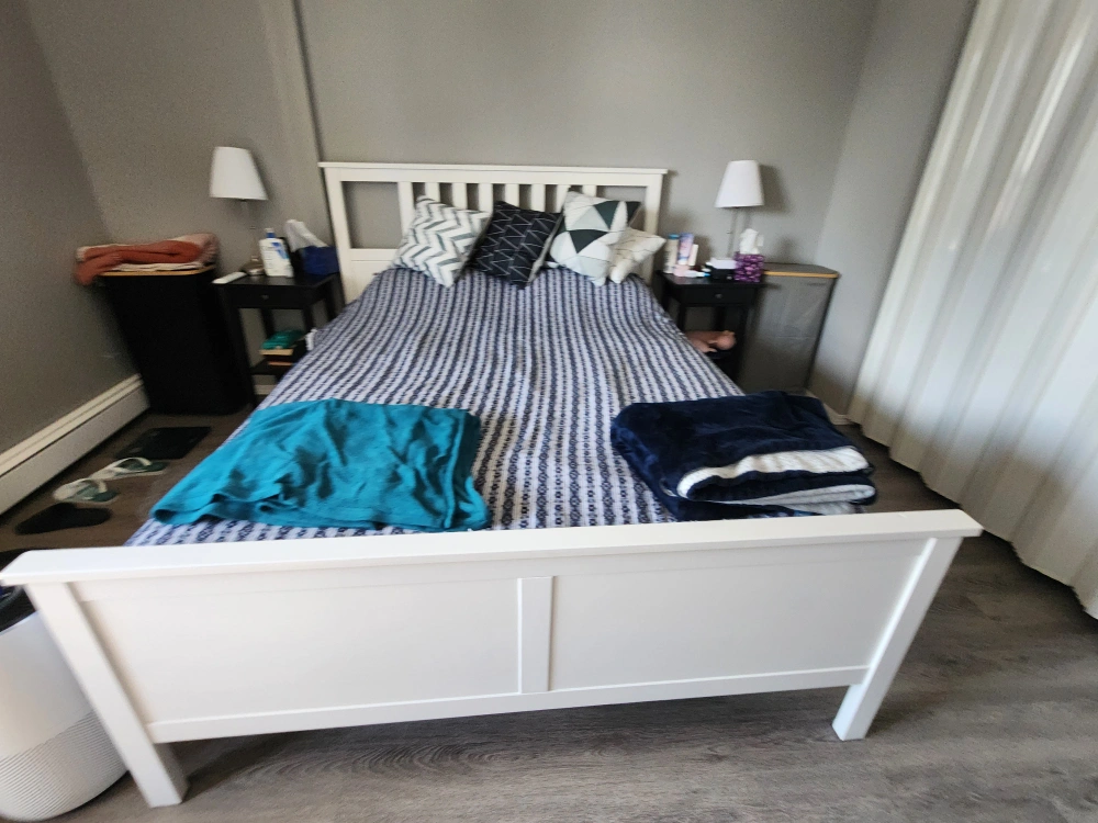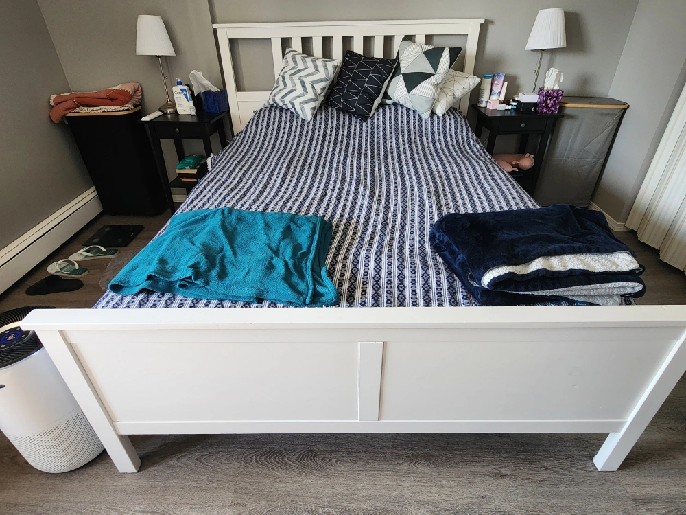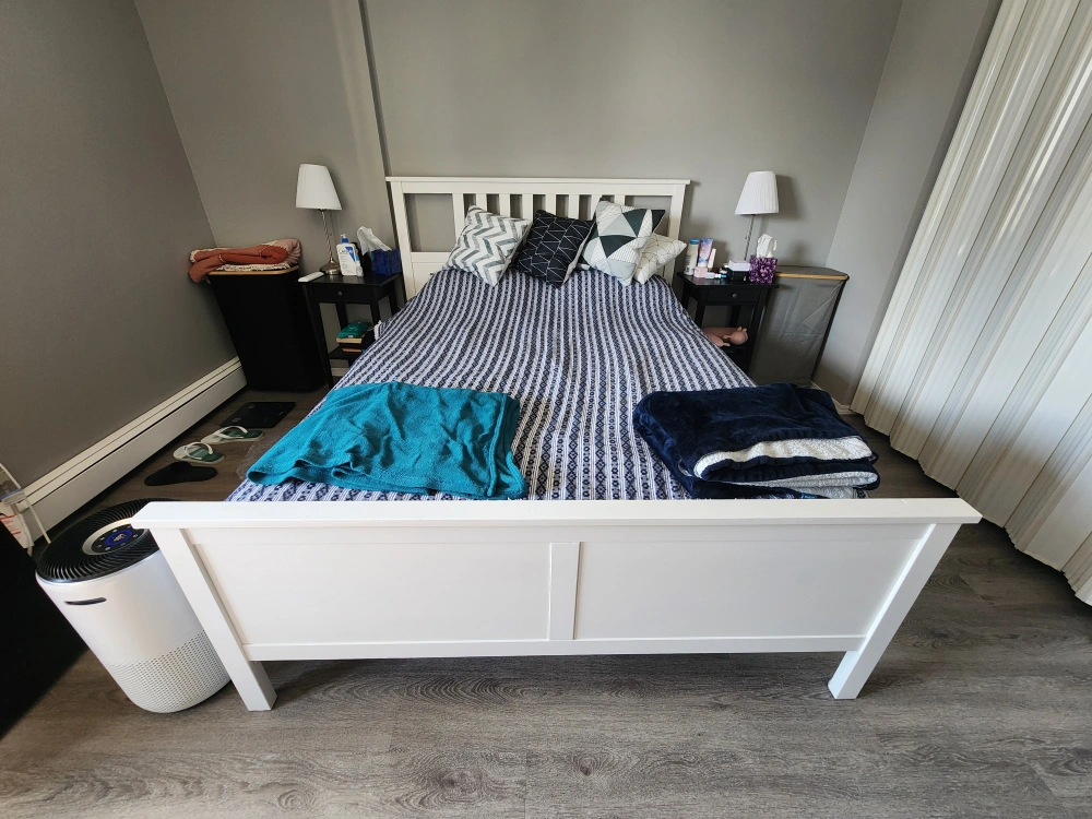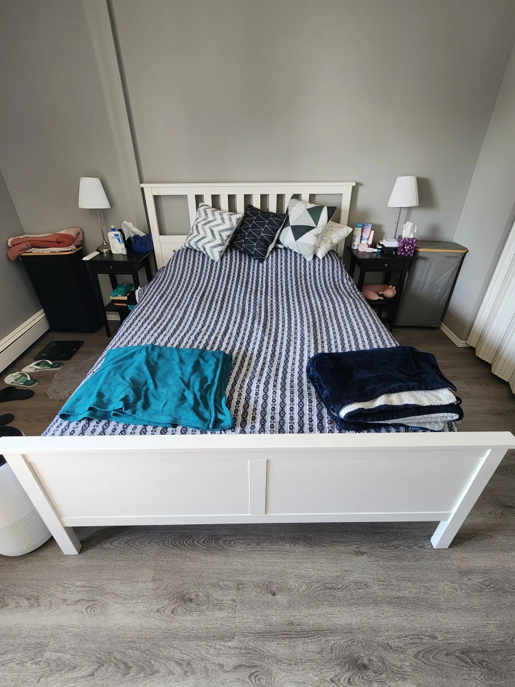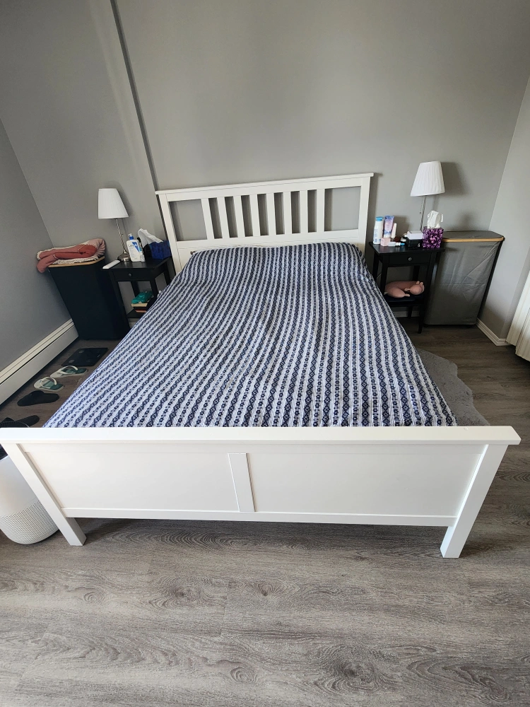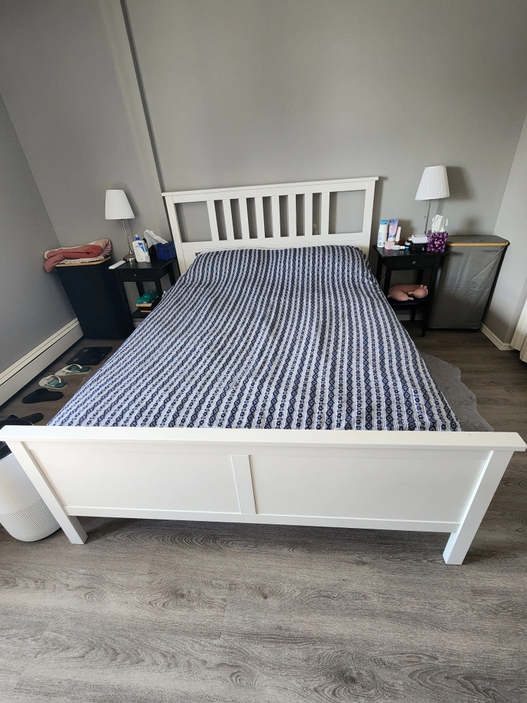 Selling a bed frame with a white wood finish. It's in great shape and ready for a new home! Perfect for adding a clean, bright look to your bedroom. Let me know if you're interested! We are selling our Queen bed size bed (only bed, MATTRESS NOT INCLUDED). There is minor details on the bed (small chips), we are including some pictures. Price today (469 CAD): https://www.ikea.com/ca/en/p/hemnes-bed-frame-white-stain-luroey-s99007856/#content Measurements: Length: 213 cm (83 7/8 ") Width: 167 cm (65 3/4 ") Footboard height: 66 cm (26 ") Headboard height: 120 cm (47 1/4 ") Mattress length: 202 cm (79 1/2 ") Mattress width: 152 cm (59 7/8 ") Please let me know if you are interested.