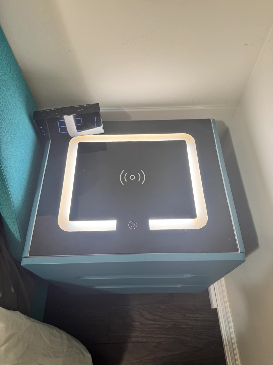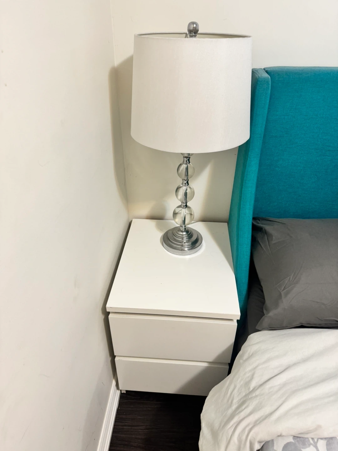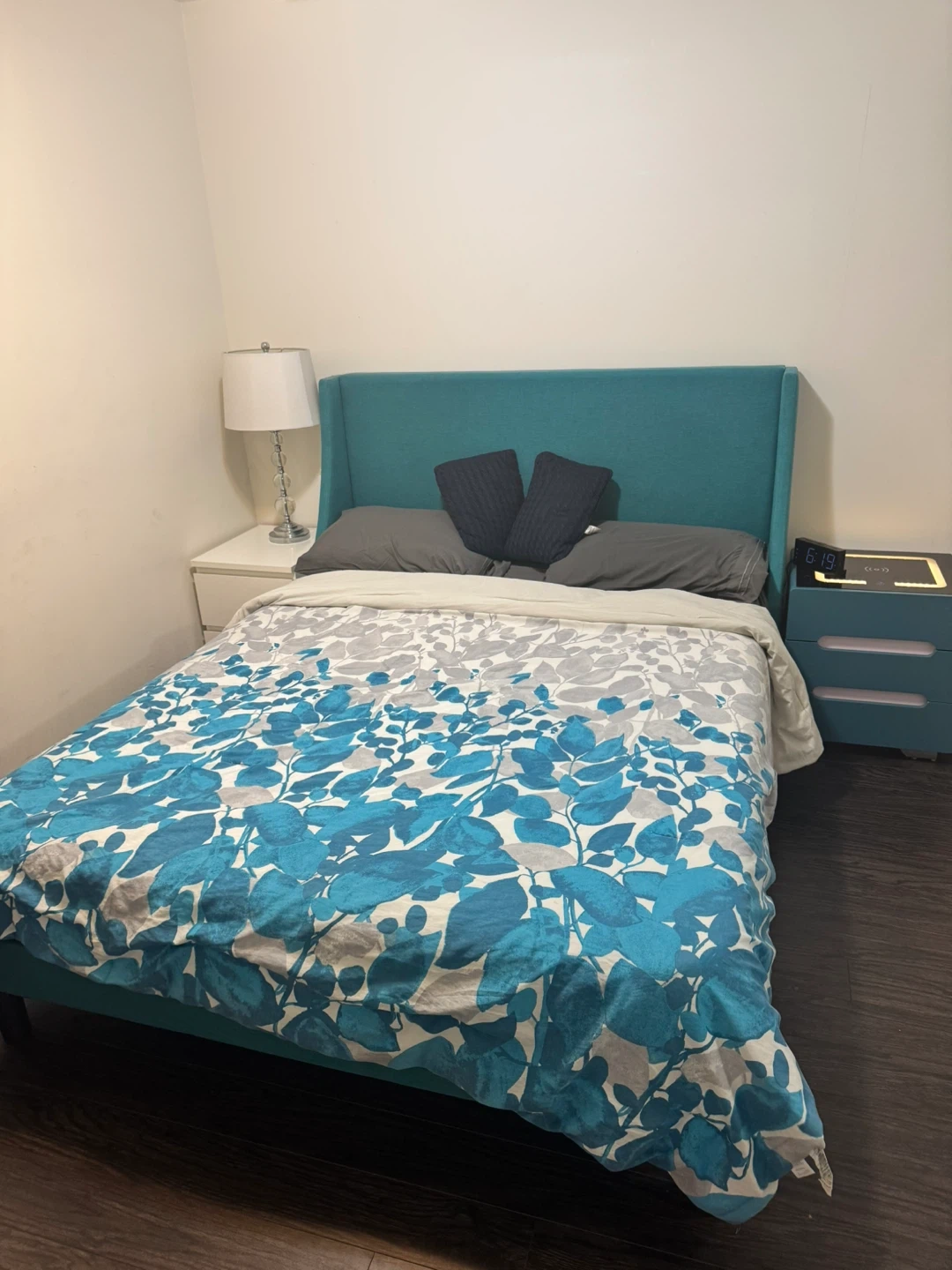 Looking to upgrade your bedroom? I'm selling this stylish smart nightstand in a lovely blue colour! It features a built-in wireless charger for your phone and a sleek design that will complement any decor. It is in great condition and ready for a new home $220- queen size bed $100- queen size mattress $40 - white ikea night stand $100- green night stand with dimmable lights and wireless charging $140- desk and chair combo