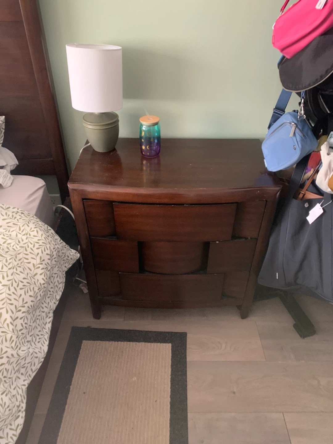 Selling a bedroom set that includes a nightstand, dresser, and bed frame. The furniture is in good condition, with some signs of wear. It's a great set for anyone looking to furnish their bedroom! Mattress included