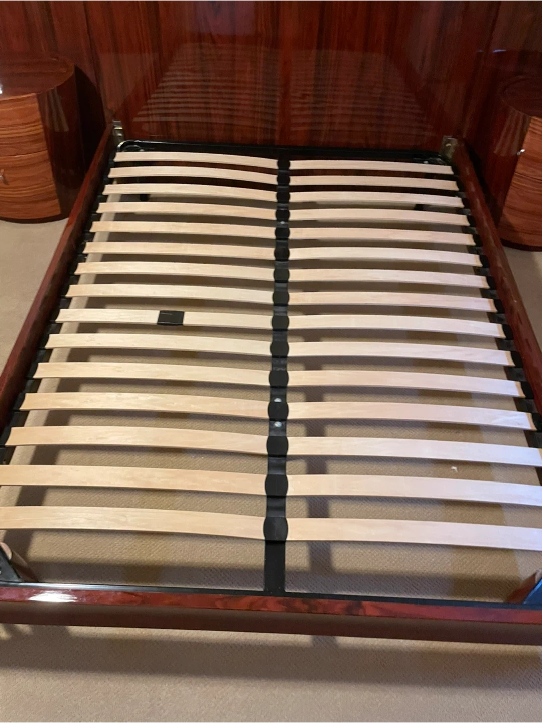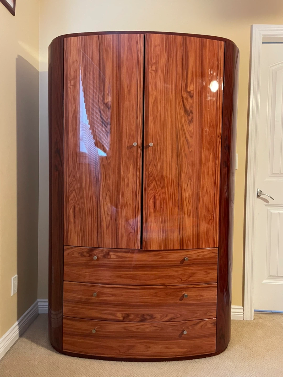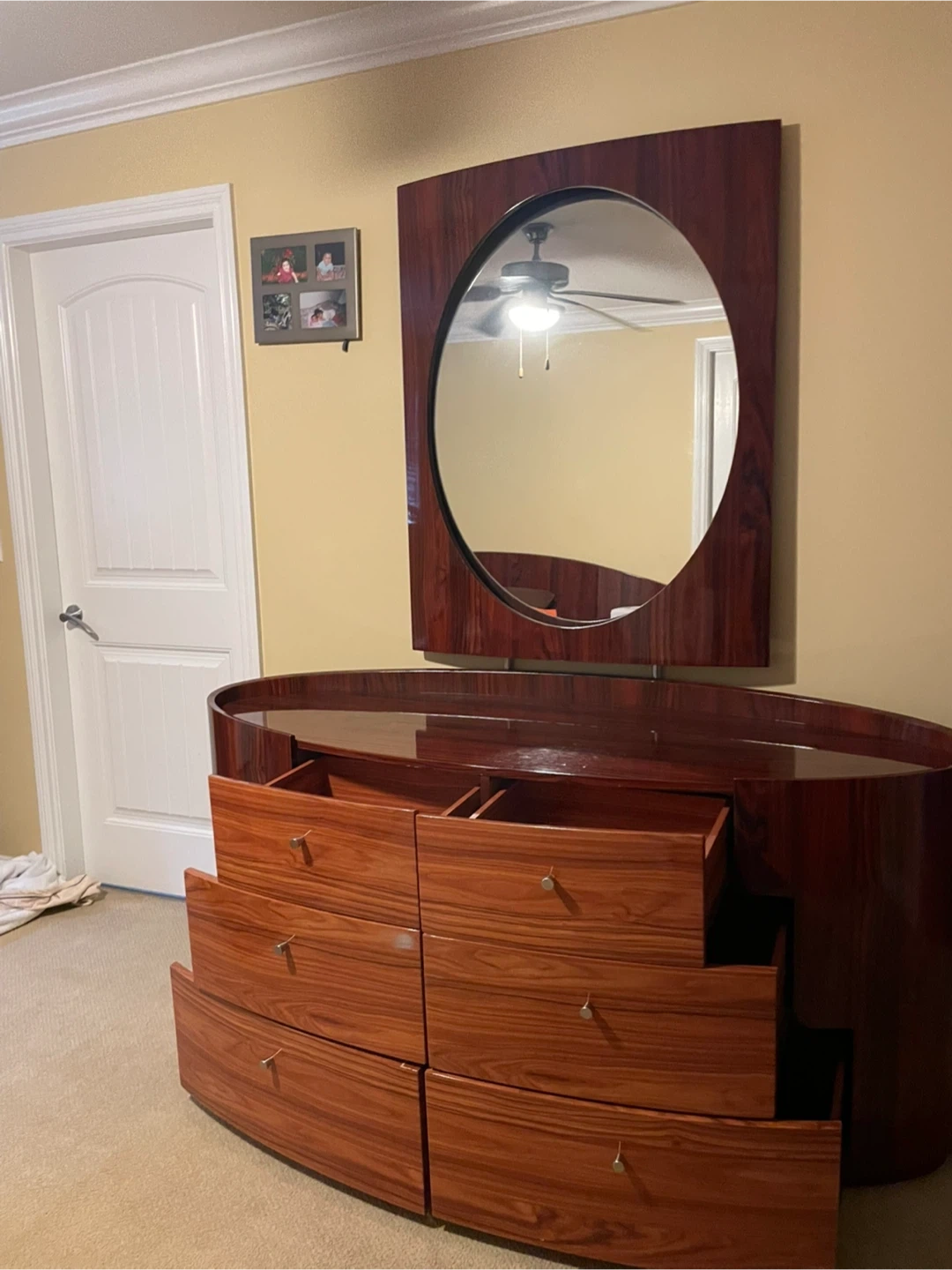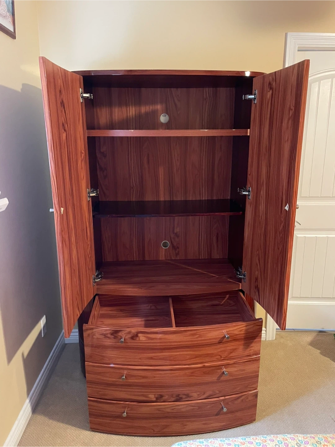 Selling a complete bedroom set, including an armoire, bed frame, dresser, and two nightstands. The set features a unique wood grain finish and curved design. Perfect for adding a touch of elegance to your bedroom! If someone buy separately piece they can buy