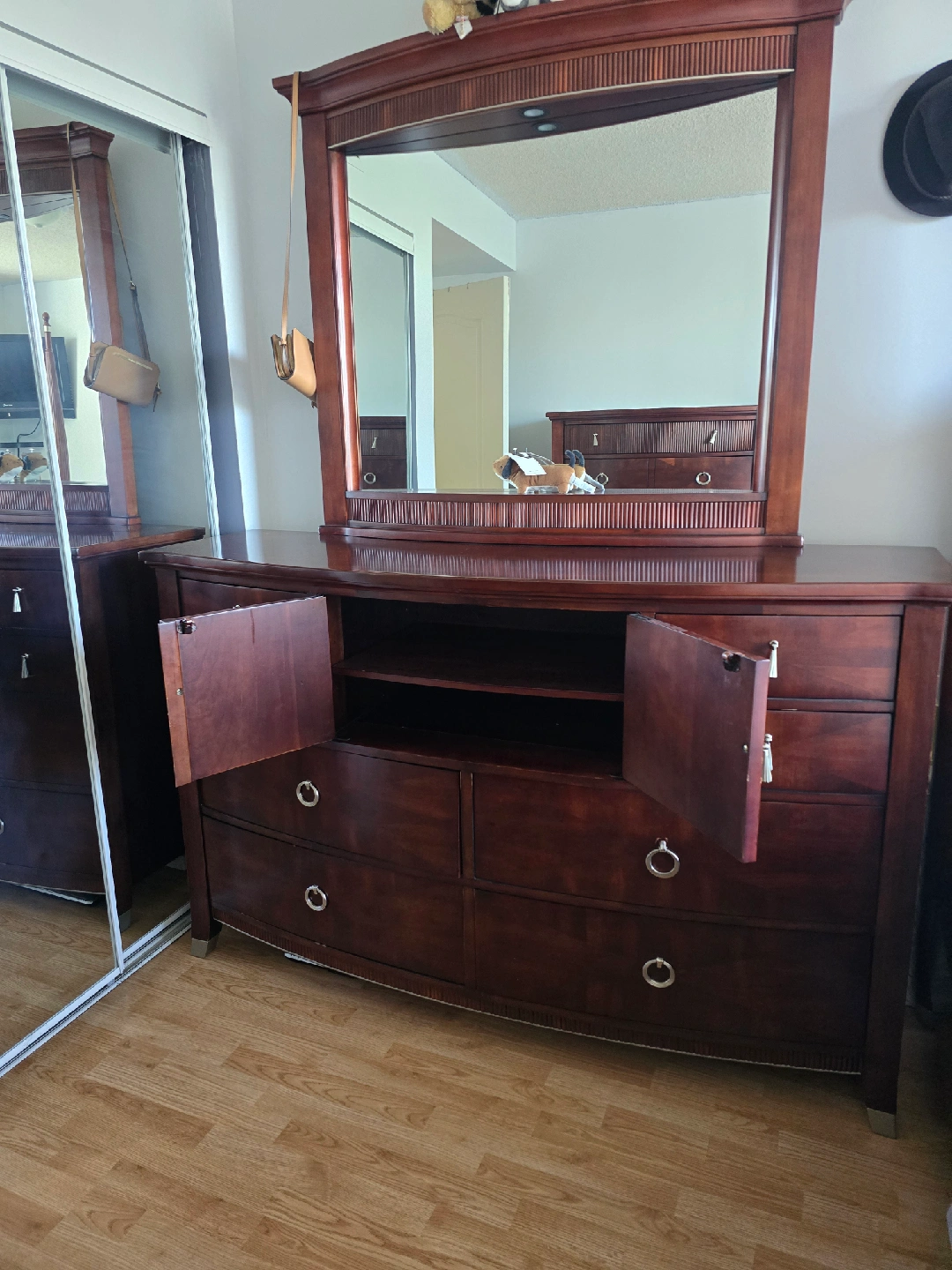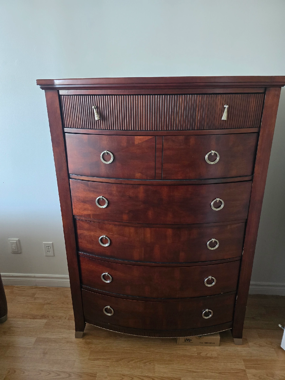 I am offering a lovely queen bedroom set for sale, which includes a bed frame, a dresser with a mirror, a nightstand, a tall six-drawer chest, as well as a mattress and box spring. The set is crafted from wood with a rich, dark finish. It is in good condition and would certainly enhance any bedroom. The top drawers of the dresser and nightstand are lined with velvet, adding a touch of sophistication.