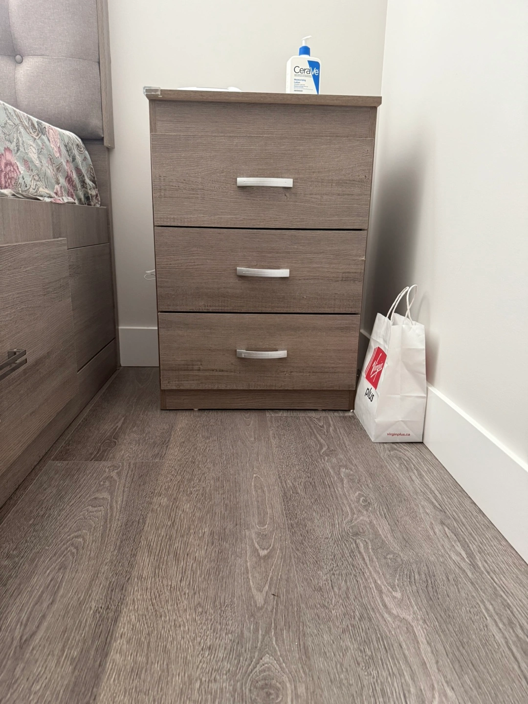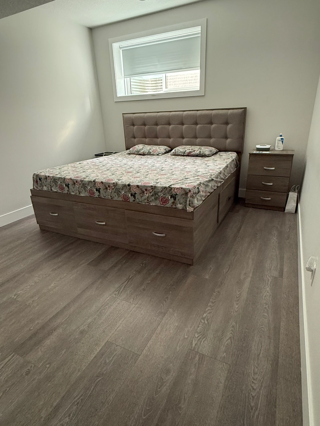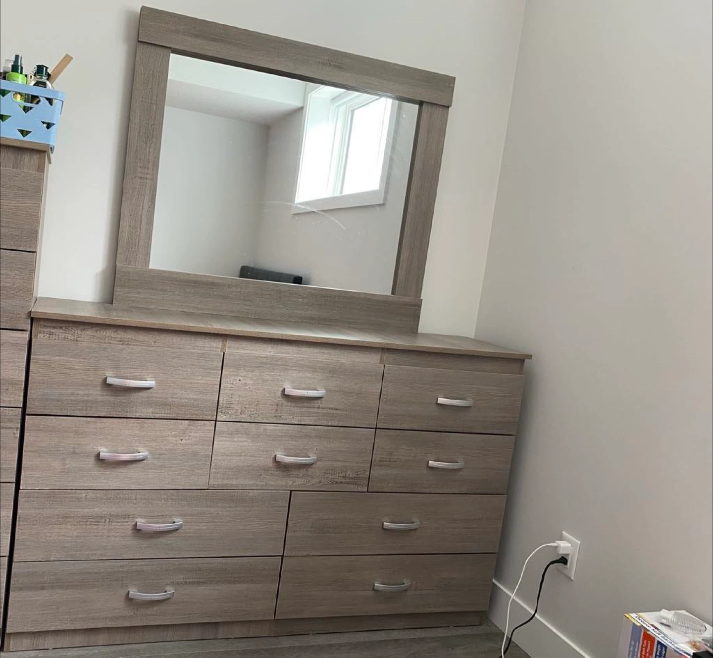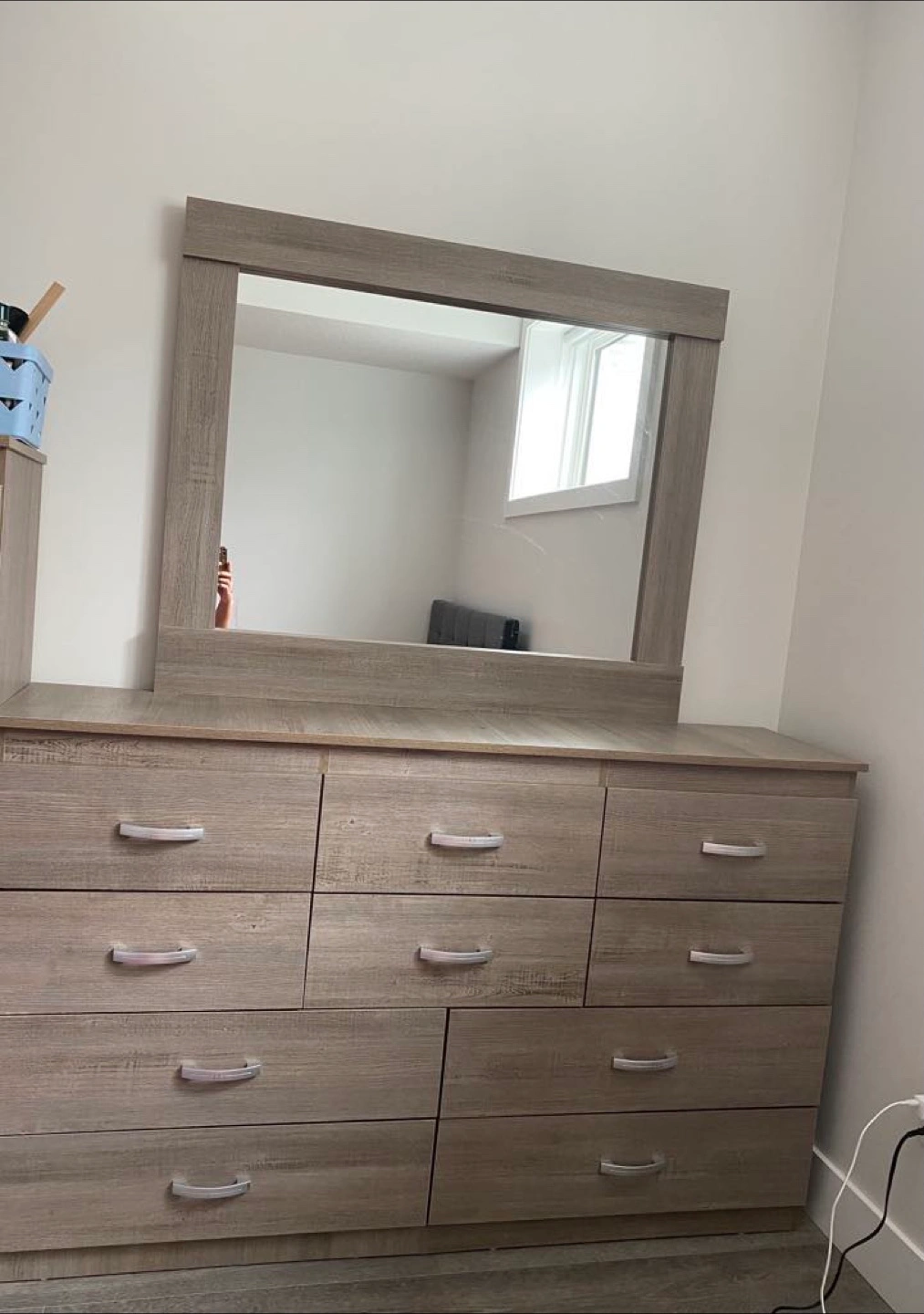 Bedroom set including a bed frame with storage drawers, a dresser with a mirror, and a nightstand. All pieces are in a matching light brown finish. Perfect for furnishing a bedroom!