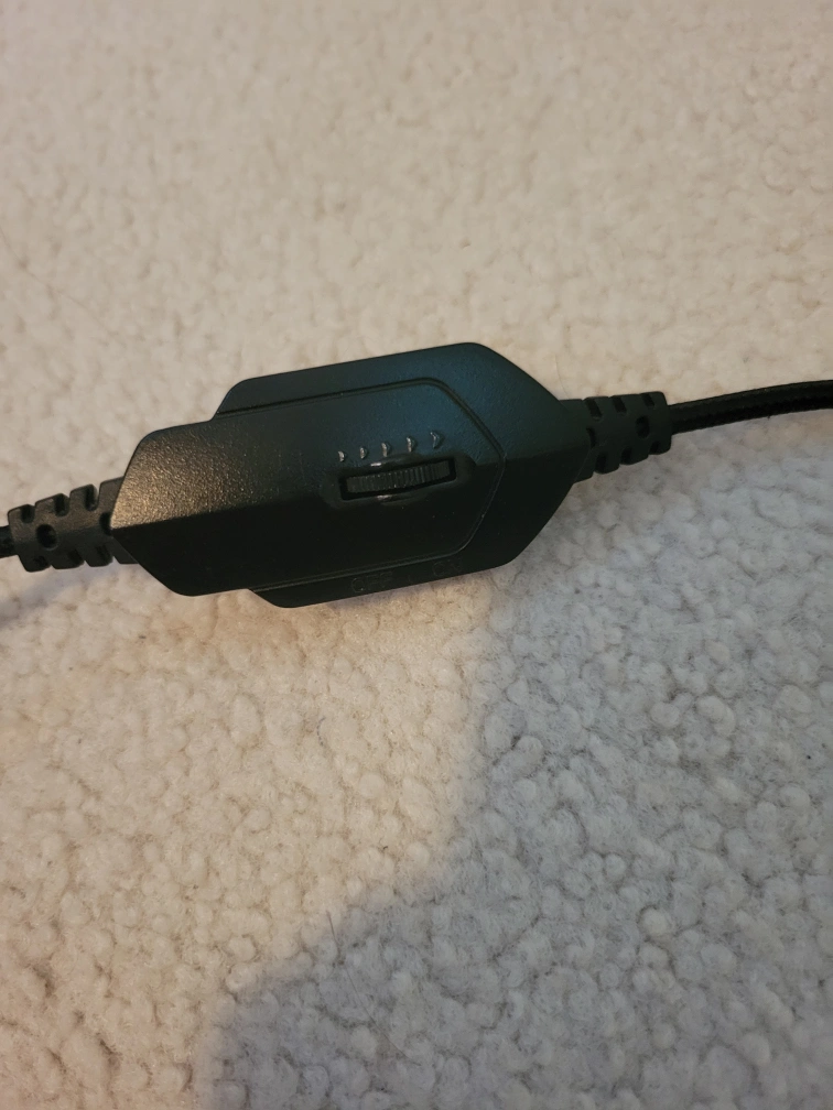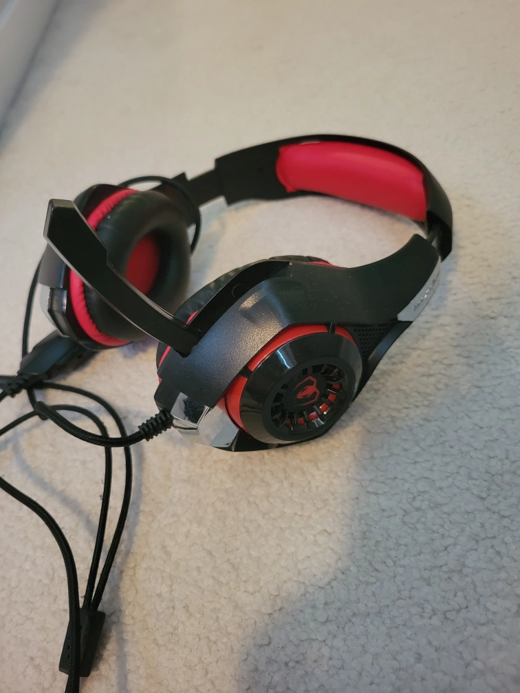 Black and red wired gaming headset. Features an adjustable microphone and volume control. Comfortable over-ear design. Great for gaming and online chatting.