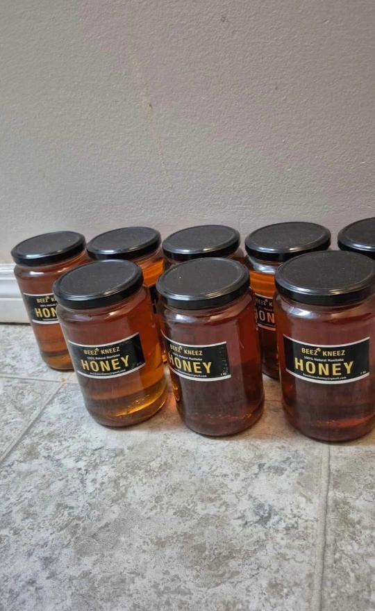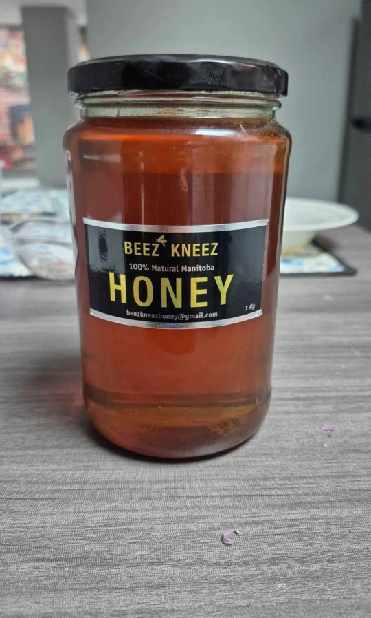 Selling Beez Kneez 100% Natural Manitoba Honey! It's a 1kg jar of delicious, locally sourced honey. Perfect for adding a touch of sweetness to your day!