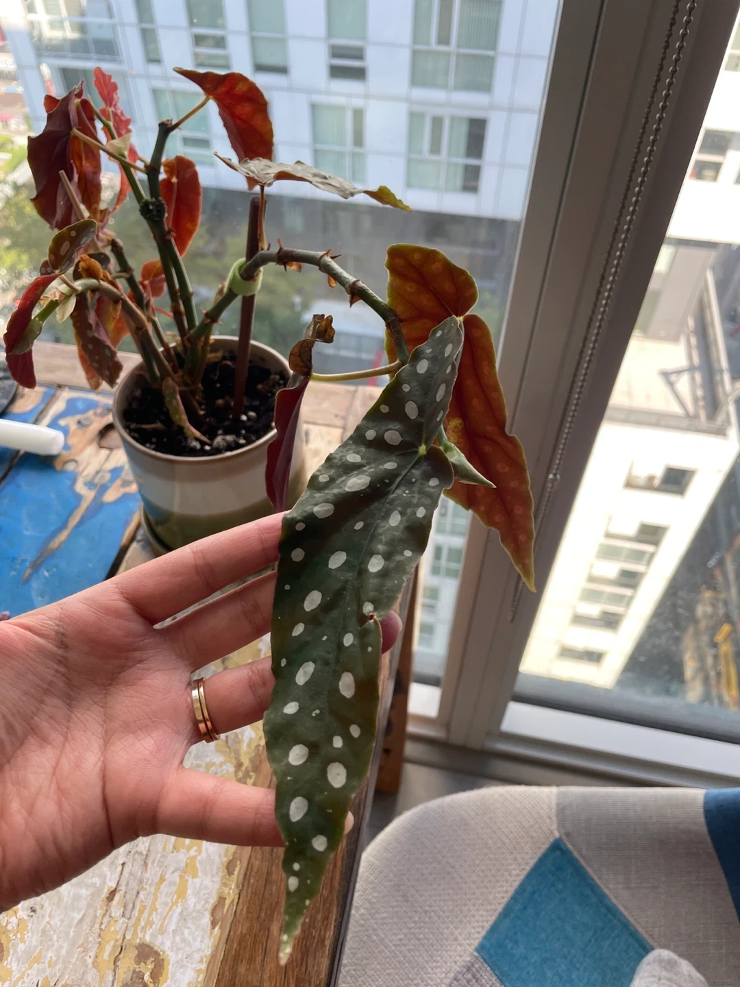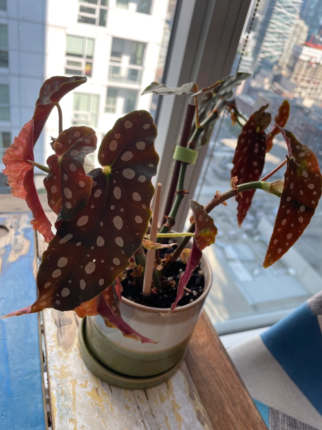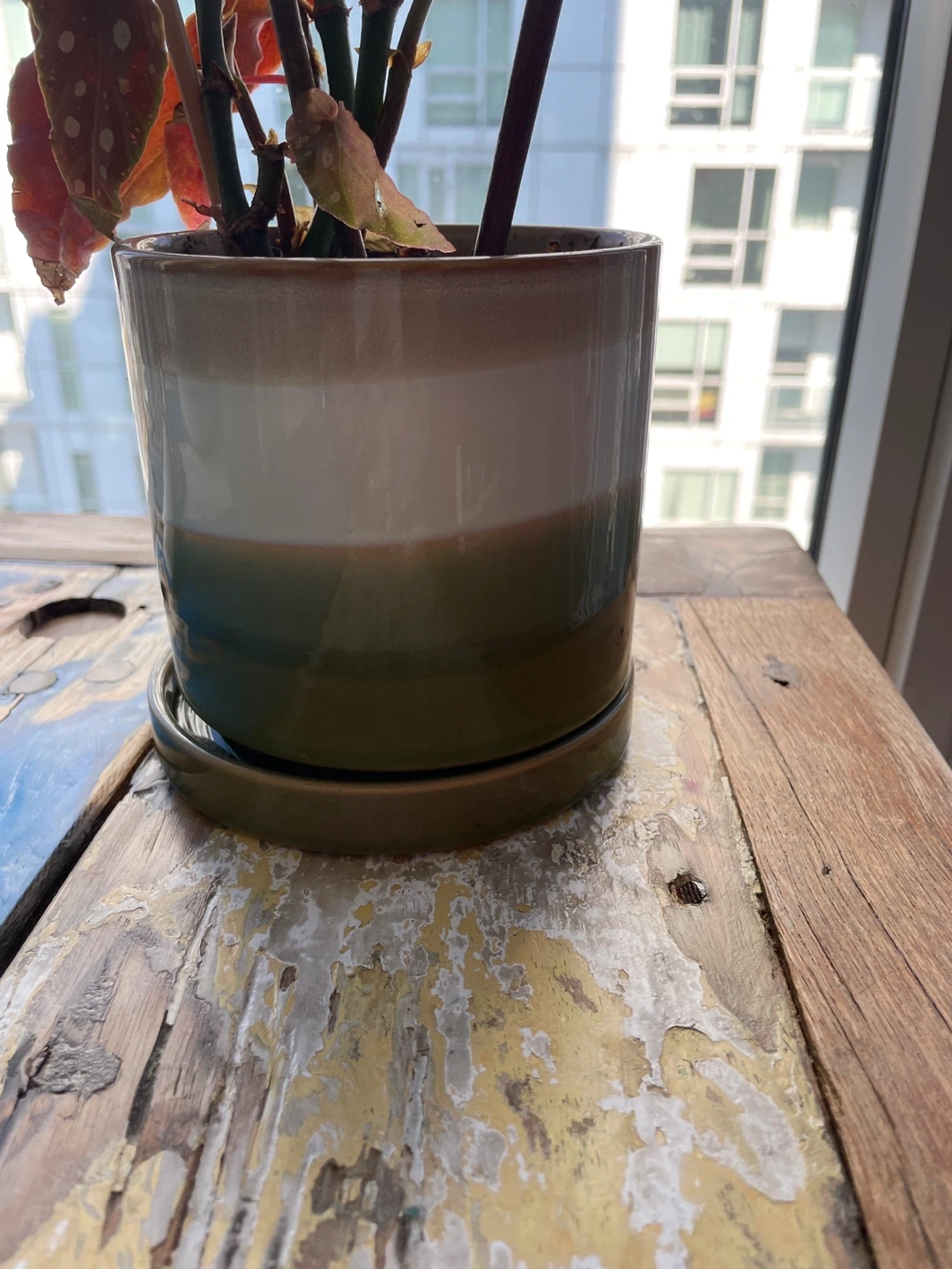 Selling a cute Begonia Maculata in ceramic plant pot with a matching saucer! It features a lovely gradient design with cream, white, and green tones. Perfect for adding a touch of style to your indoor plants