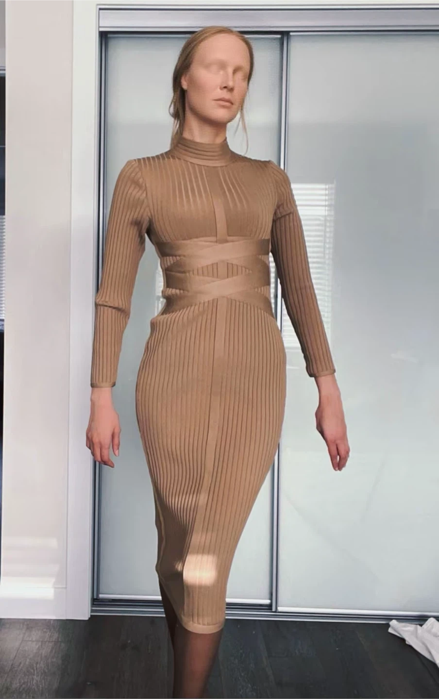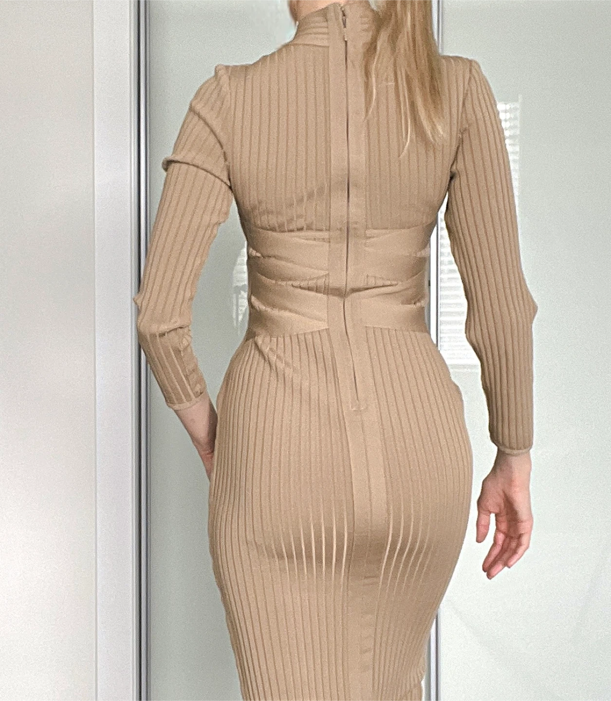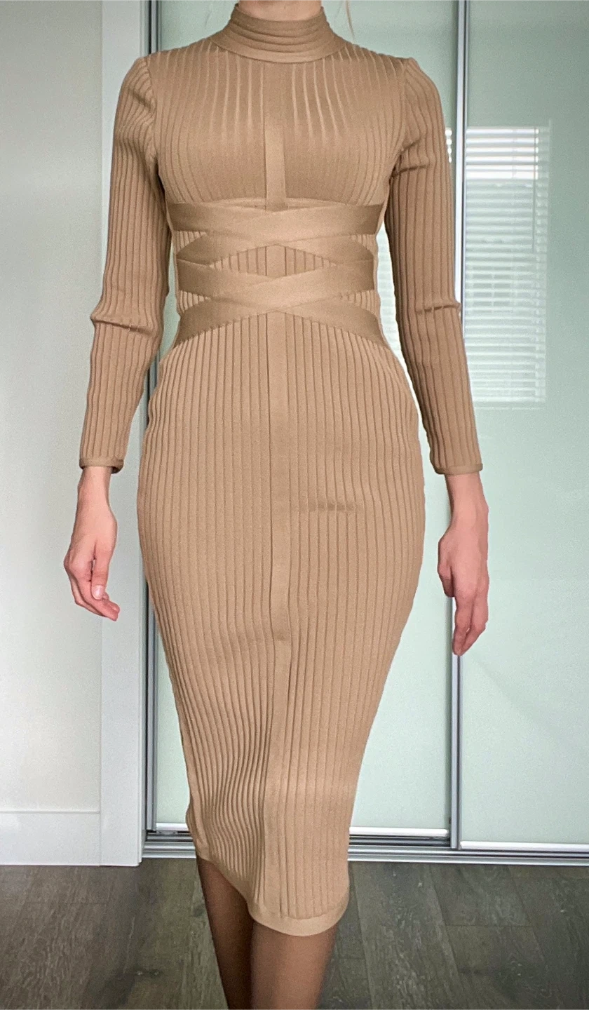 Here's a stylish beige bandage midi dress. It features a unique design with ribbed detailing and a flattering silhouette. Perfect for a night out or a special occasion!