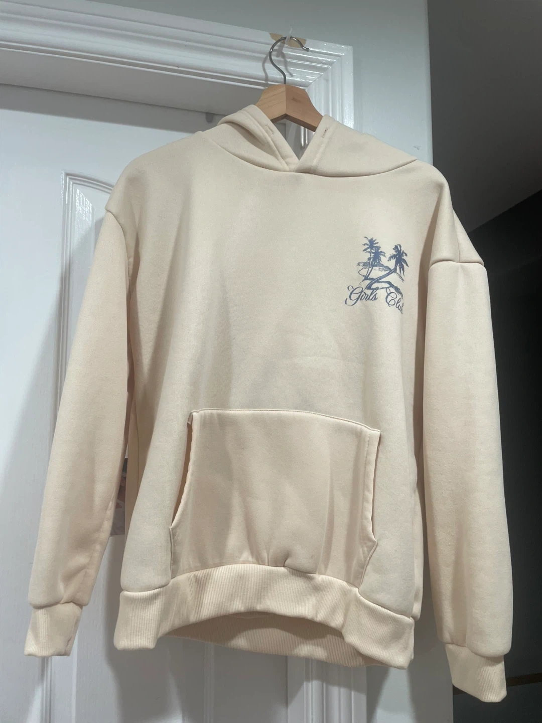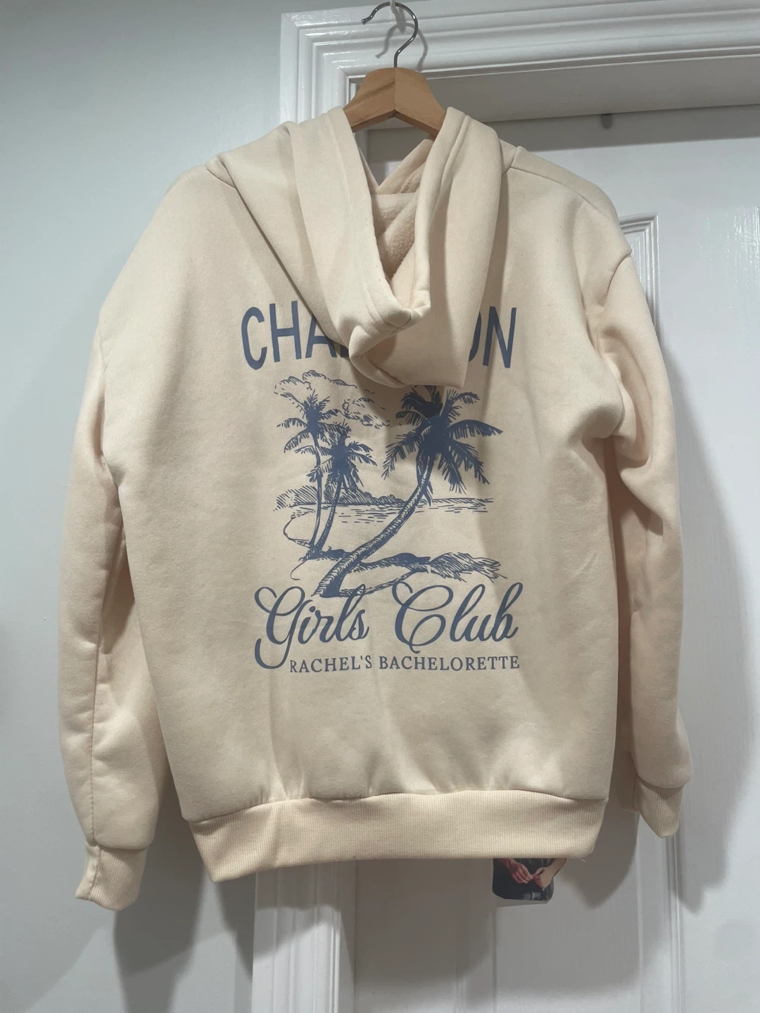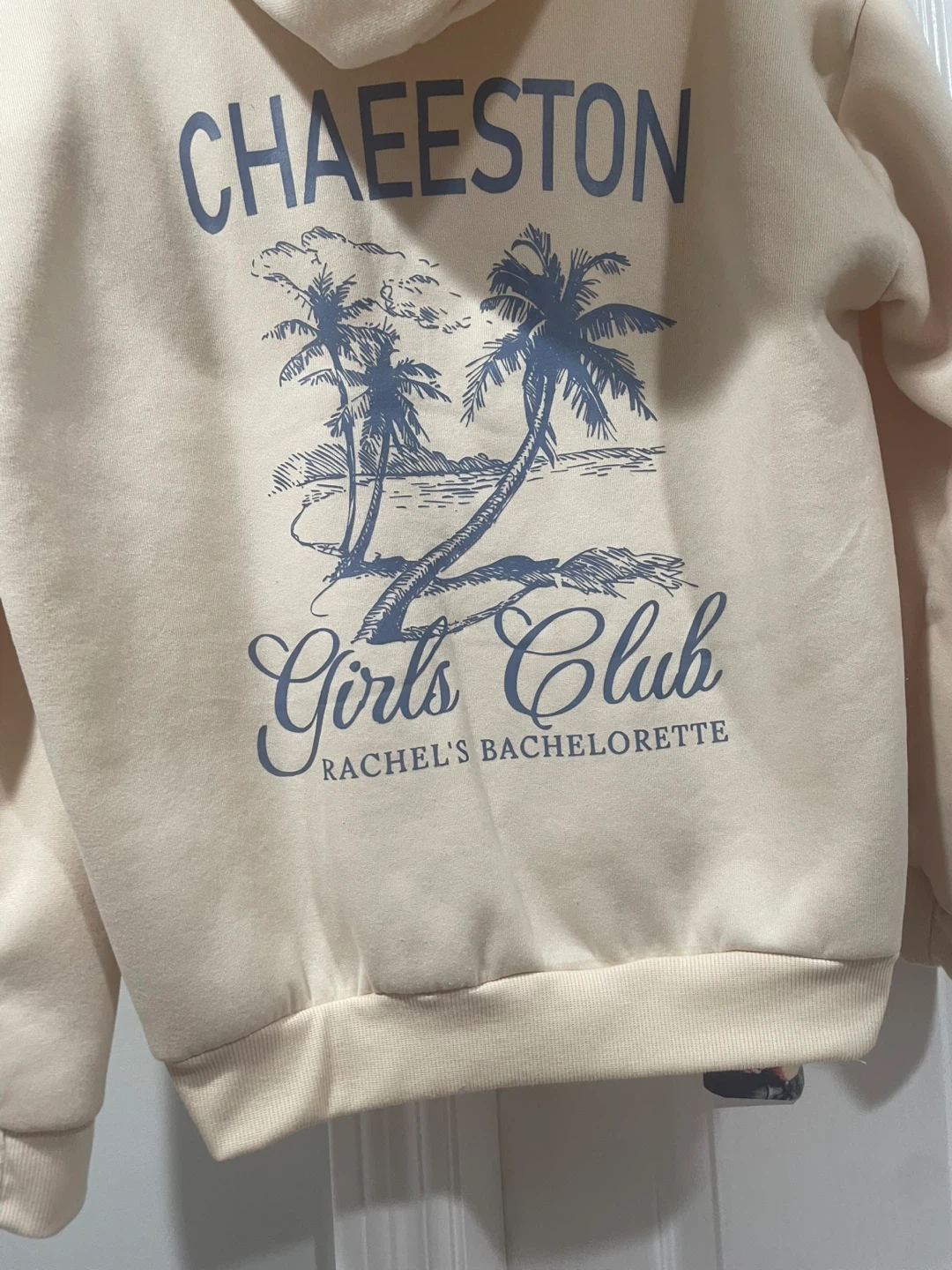 Cozy beige hoodie with a 'ChaeestonGirls Club' design on the back! Perfect for casual wear or lounging around the house. It features a front pocket and a comfortable hood. The design includes palm trees and the text 'Rachel's Bachelorette'.
