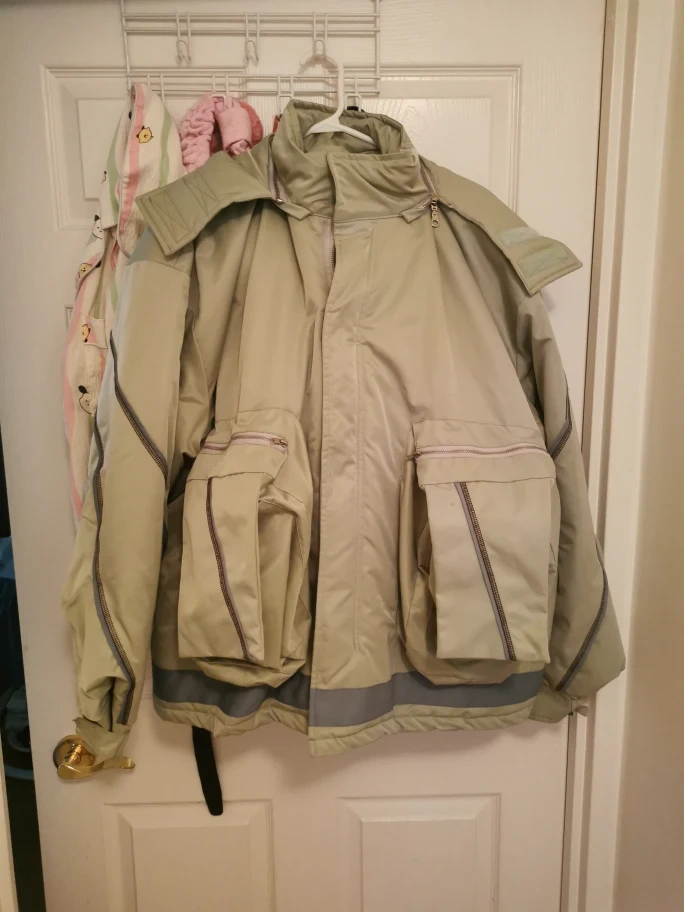 This is a beige winter jacket with lots of pockets. It's in like new condition and ready to keep you warm this winter!