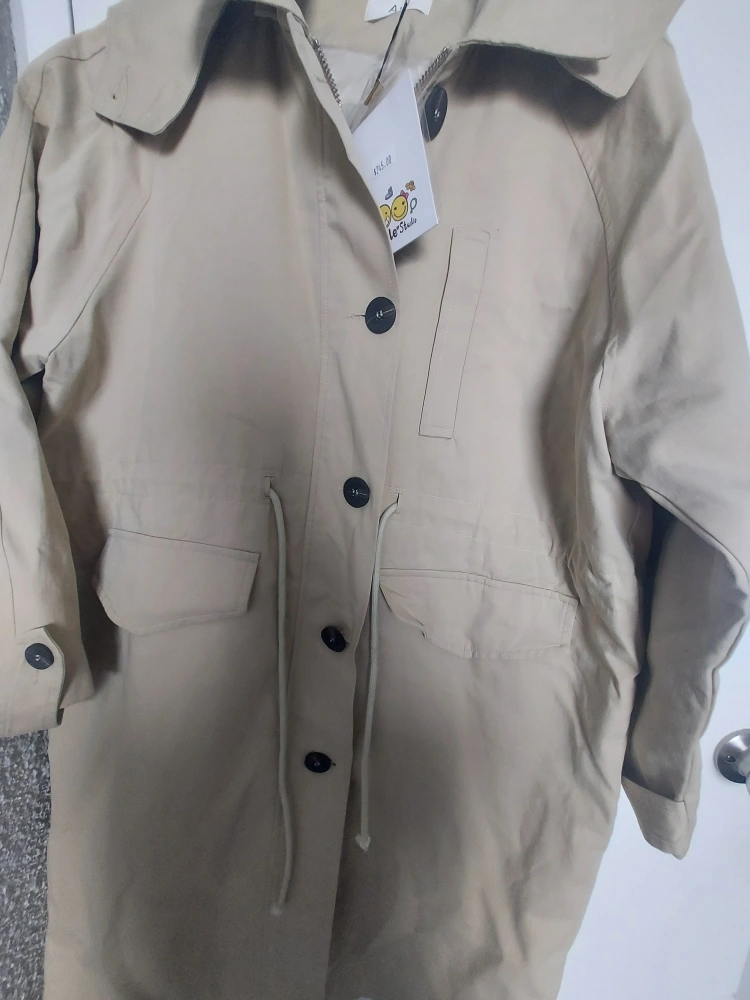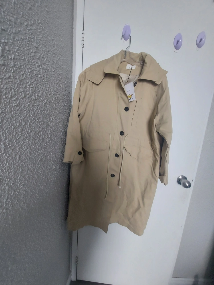 Stylish beige hooded Coat, Long sleeves, button closure. Drawstring waist. Pockets. Size Large