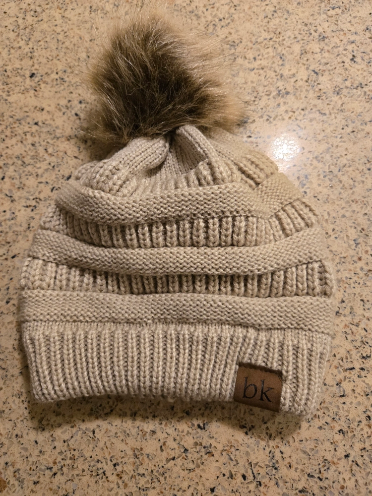 Cozy knit beanie. Features a fluffy pom pom and ribbed design. Neutral beige colour. Never worn. Selling for $3. Pickup only. Smoke free and pet free home.