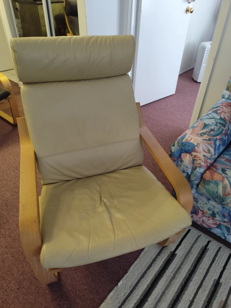 A comfy armchair with a beige leather seat and back! The wooden frame gives it a warm and inviting look. It's perfect for relaxing after a long day or curling up with a good book. There are some signs of use on the wooden arm rests.