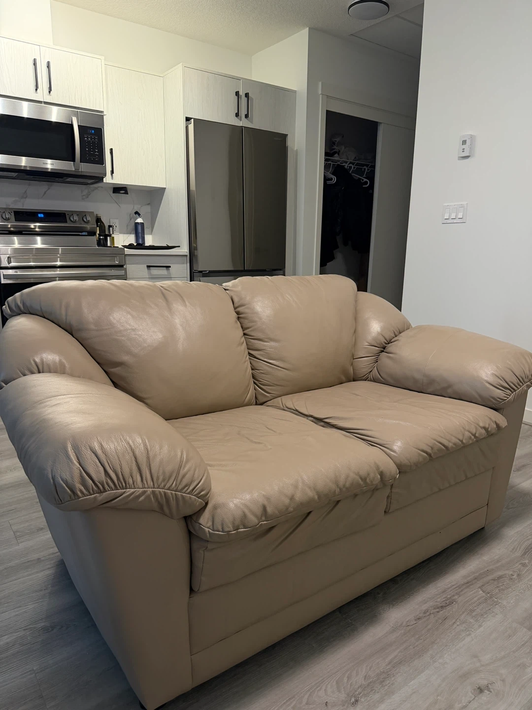 Dimensions: 160 cm (W) × 88 cm (D) × 80 cm (H) Selling a comfy beige leather loveseat. It's in good condition and perfect for a smaller space. The leather is soft and the cushions are plush, making it a great spot to relax