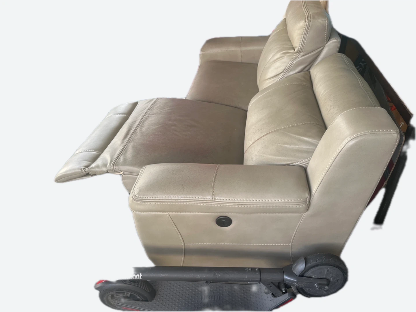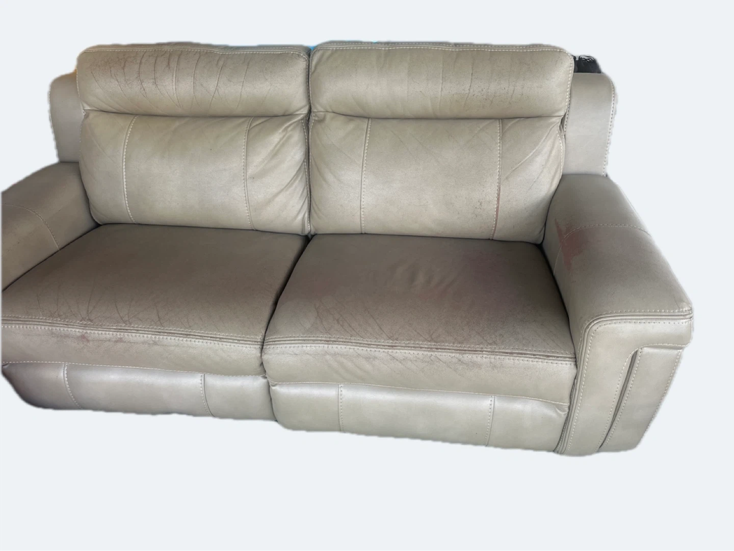 Selling a beige leather reclining sofa. It shows signs of use, as seen in the photos. Perfect for a cozy living room! Only leather like that u can use cover also but good working condition