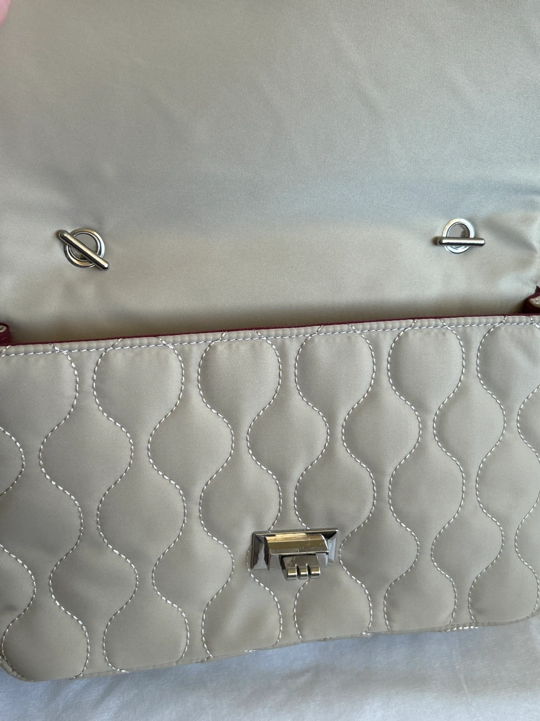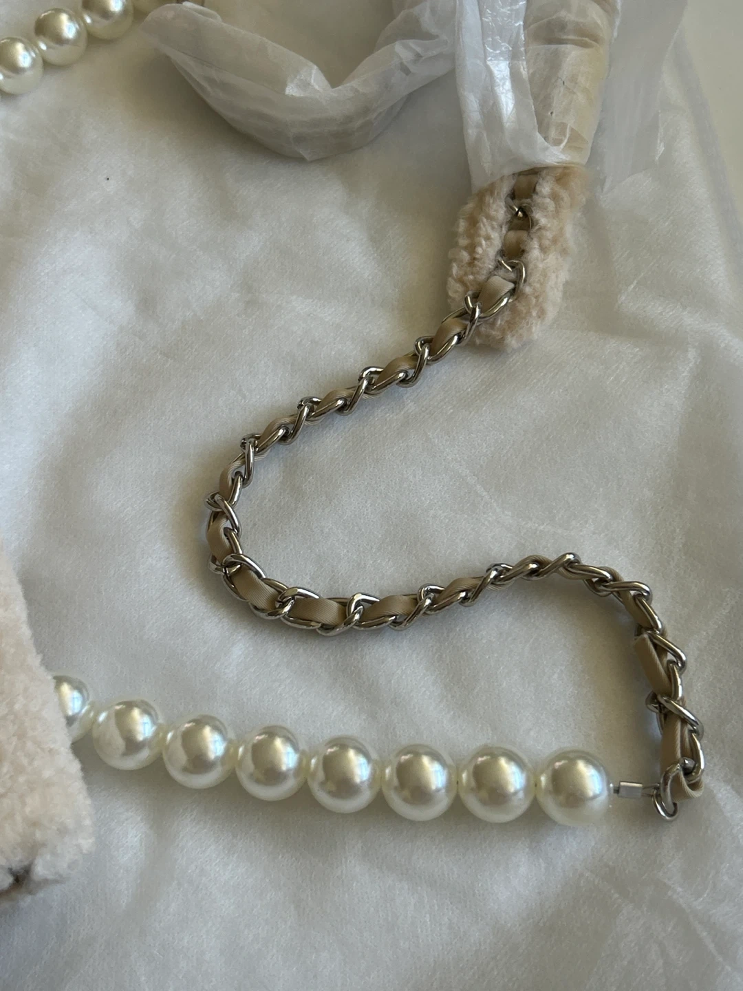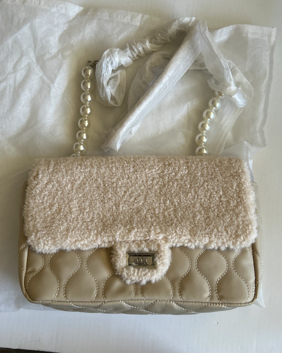 Brand new, stylish shoulder bag featuring a quilted design with a soft faux fur flap. It comes with a pearl-beaded strap and is perfect for adding a touch of elegance to any outfit. The bag is beige and has a unique beautiful texture that makes it stand out! Was bought in New York few years back. Check out all photos provided. Smoke/Pet free home. Cash & Pick Up only.