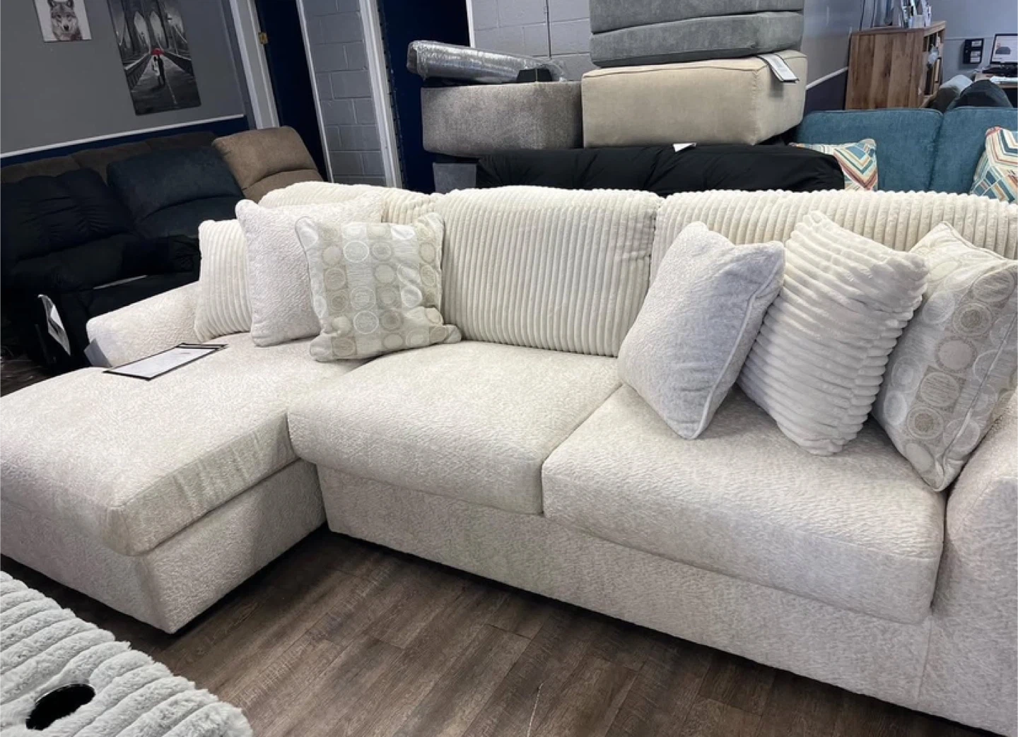 Selling a comfy beige sectional sofa! It comes with several decorative pillows to complete the look. Perfect for a living room or den. The sofa is in great condition!