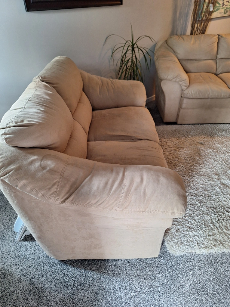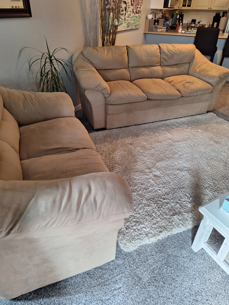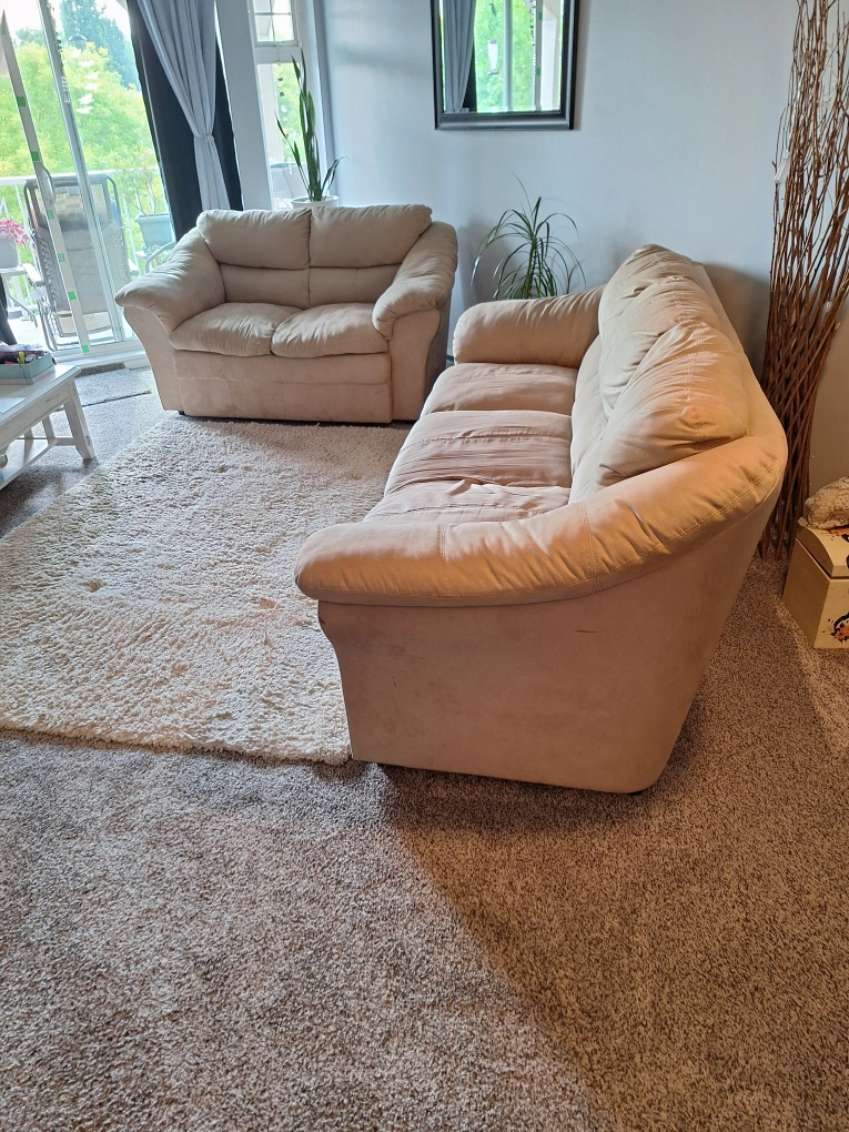 Selling a comfy beige sofa and loveseat set! This set is perfect for a living room or den. The neutral colour will fit in with any decor. It's in good condition and ready for a new home! $350 open to offers.