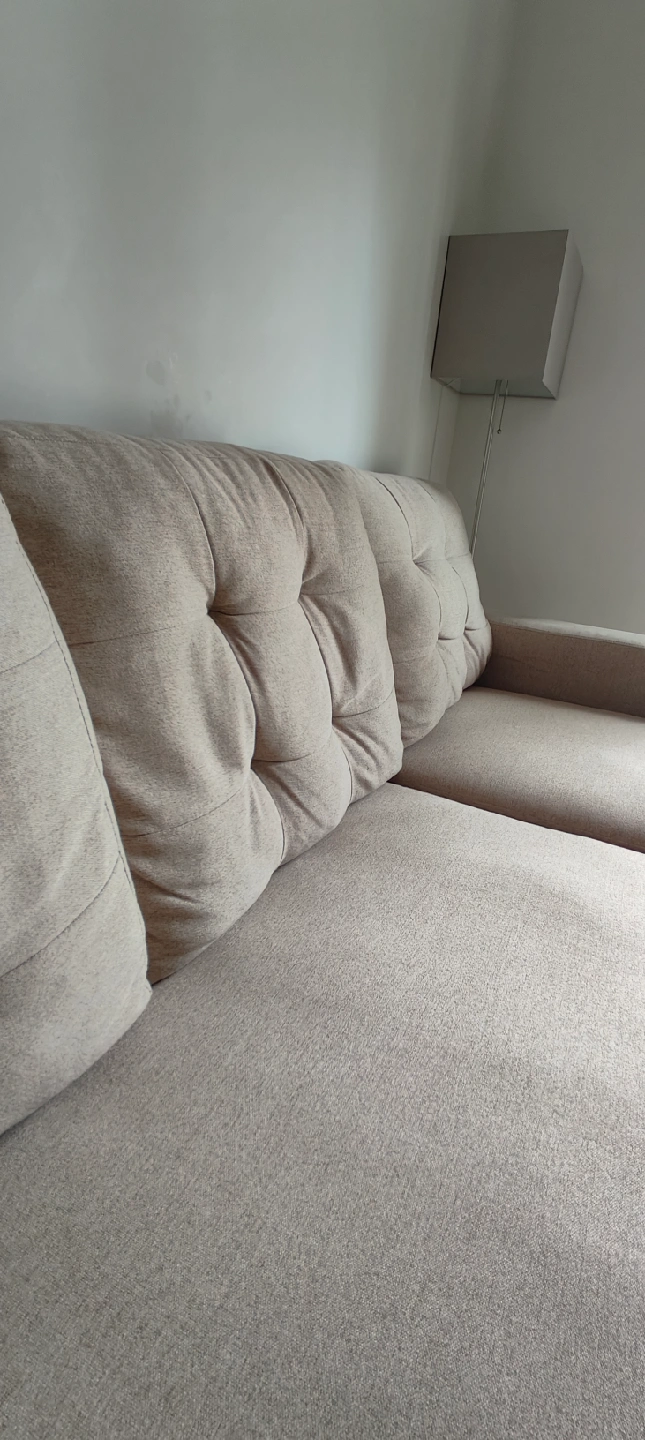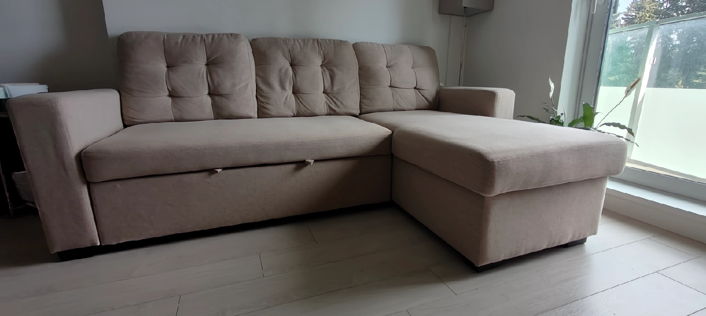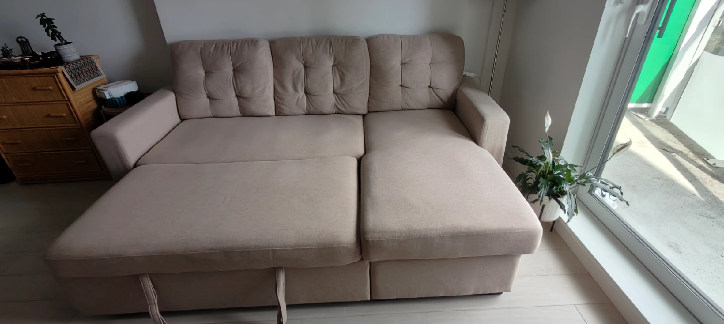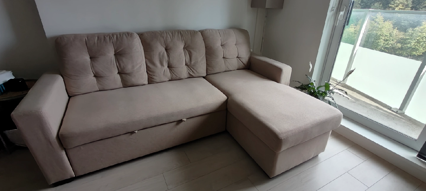 Selling a comfy beige sofa bed with a convenient pull-out section. It's in great shape and perfect for guests or small spaces. The cushions are plush and the fabric is durable. the chaise has storage underneath it. it has been used for just about a year in a smoke free and pet free home. no stains or tears on the fabric either! It can be dismantled for easier transportation.