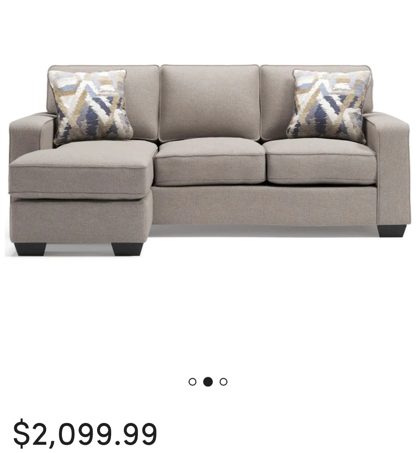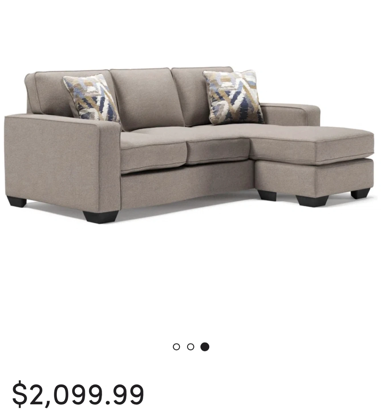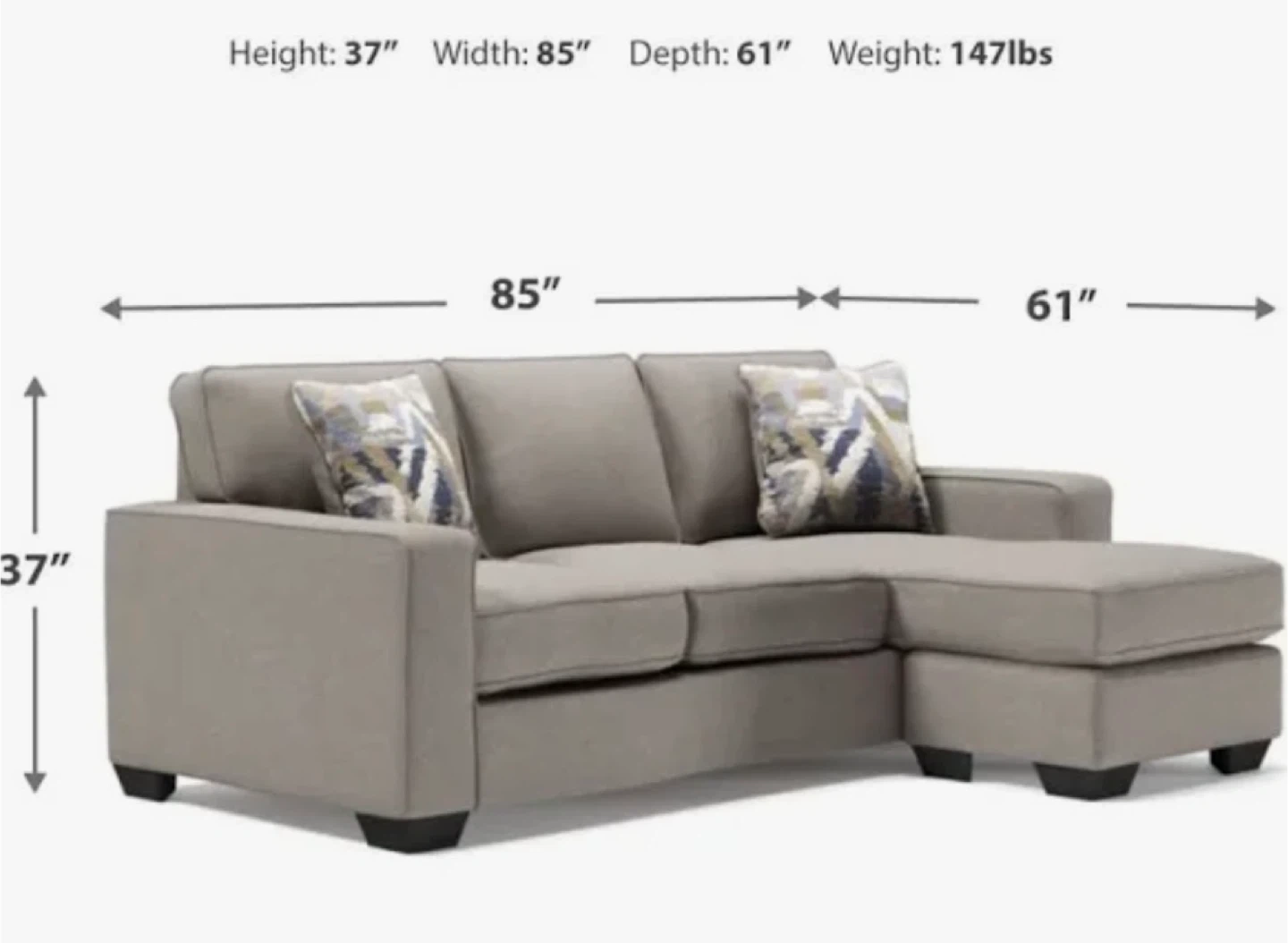 Selling a comfy beige sofa with a chaise lounge! It's in great shape and would be perfect for a living room or den. The dimensions are 85" wide, 37" high, and 61" deep. It's a great size for relaxing and watching movies