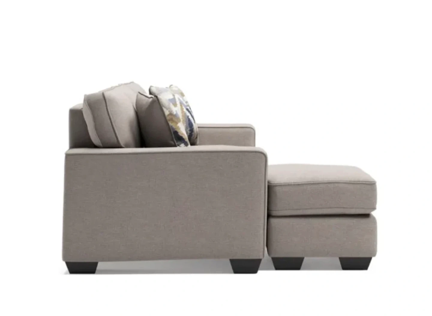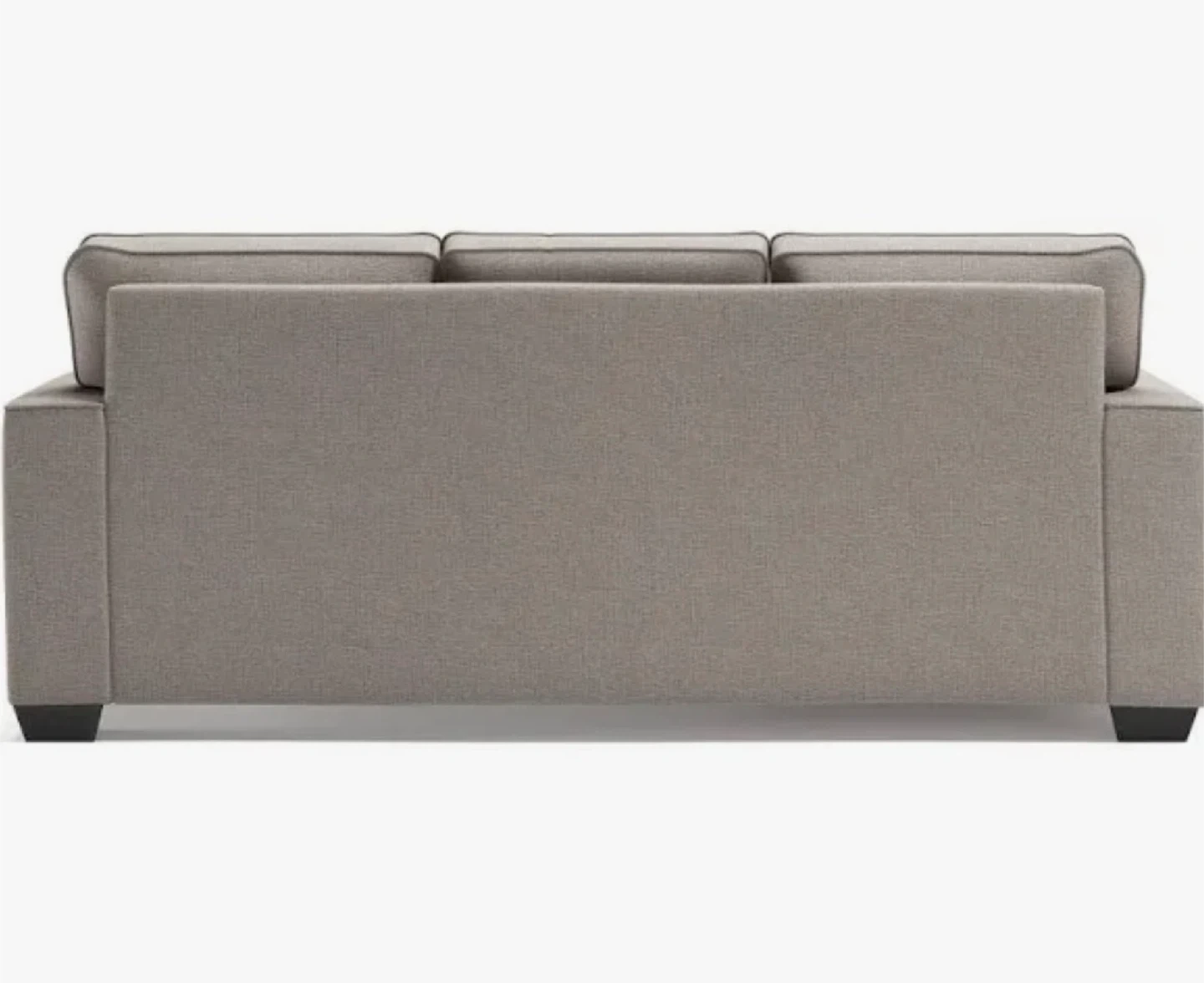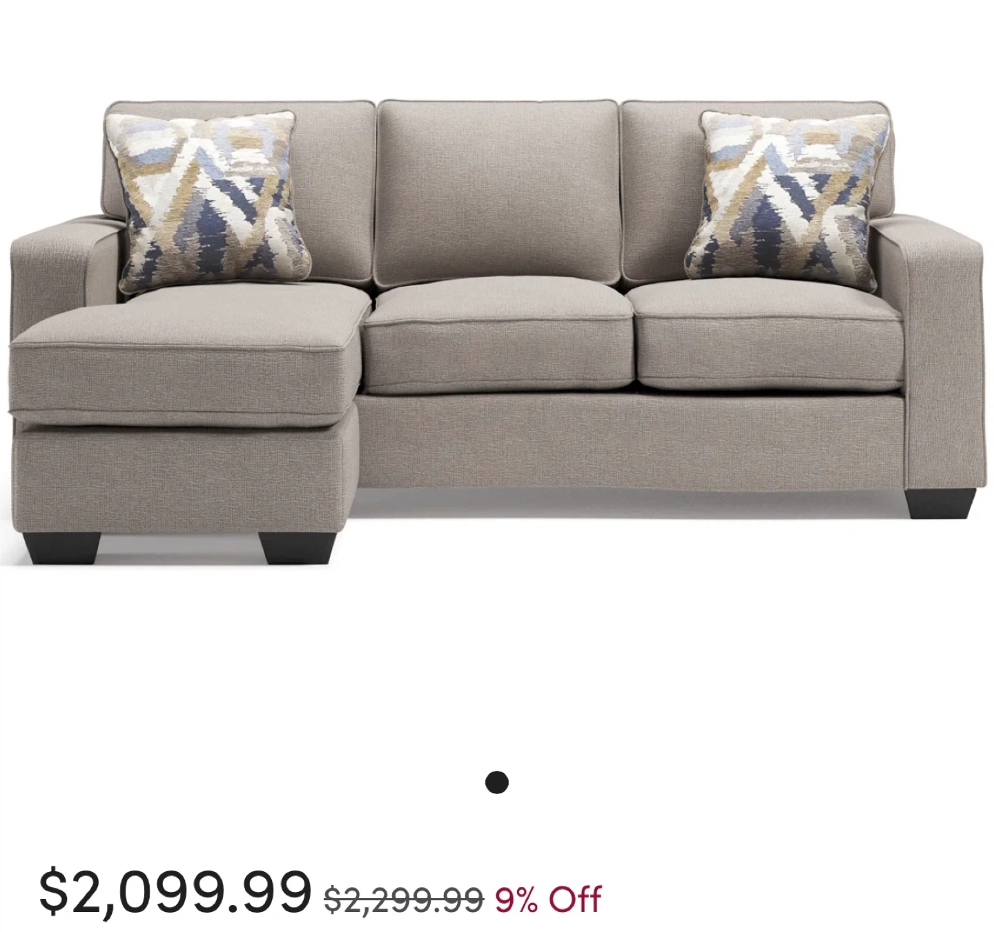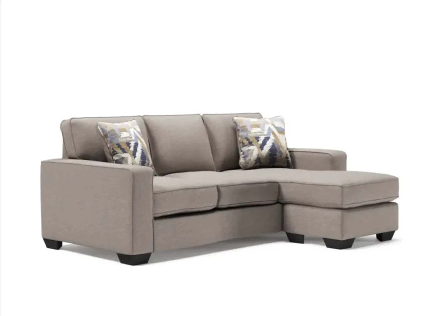 Selling a comfy beige sofa with a chaise lounge! It's in great shape and would be perfect for a living room or den. The dimensions are 85" wide, 37" high, and 61" deep. It's a great size for relaxing and watching movies