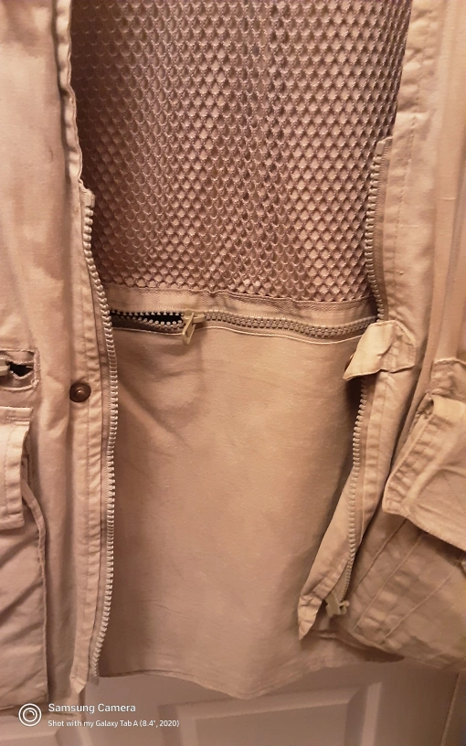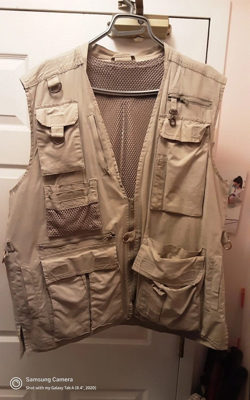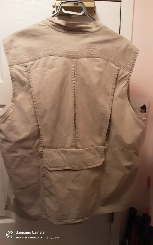 Selling a beige utility vest with lots of pockets! It's in good condition and perfect for outdoor activities or just adding a unique touch to your wardrobe. Lots of storage space with all the pockets!