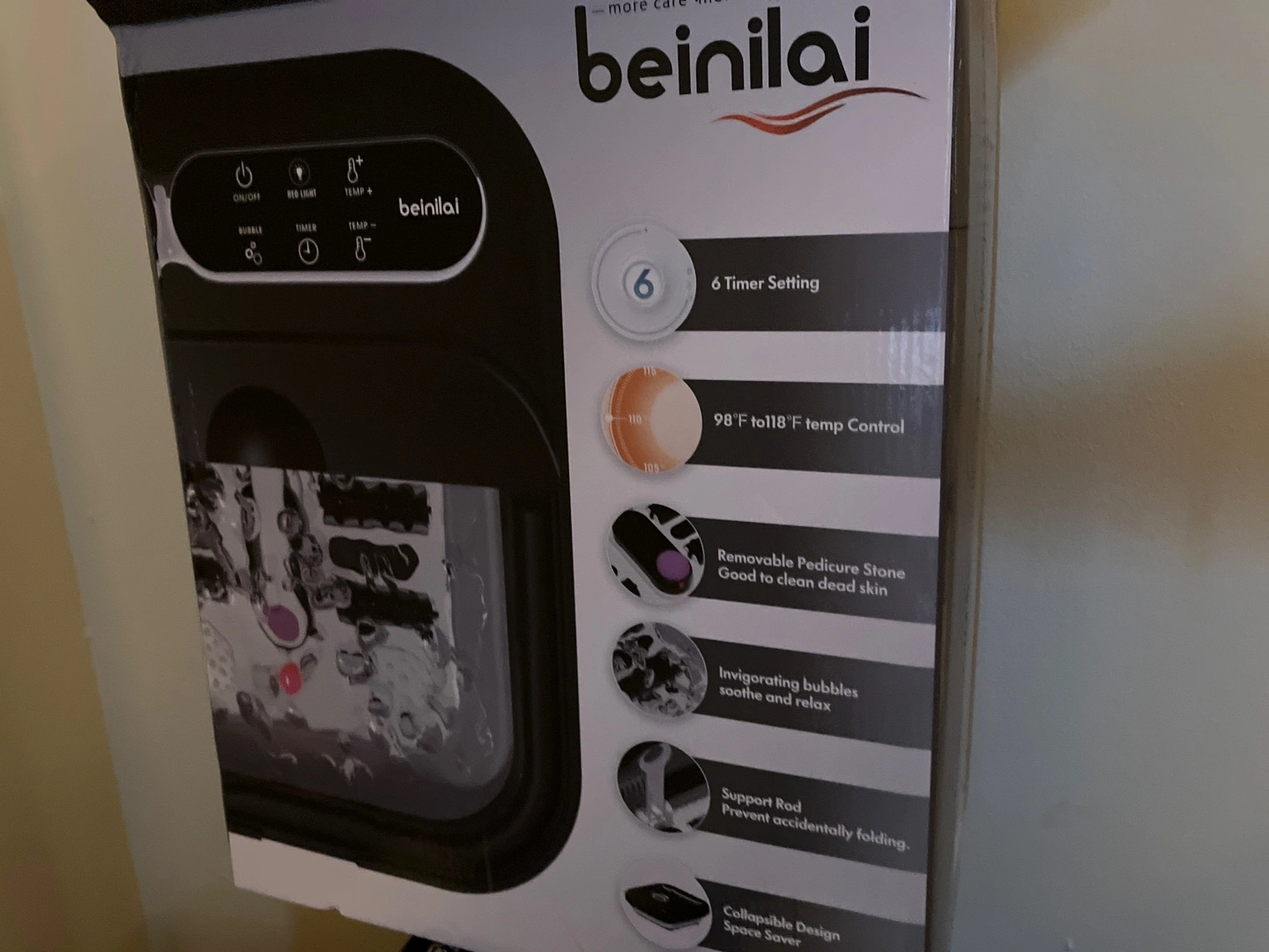 I'm selling a beinilai foot spa massager! It features: - 6 timer settings - Temperature control from 98°F to 118°F - A removable pedicure stone for cleaning dead skin - Invigorating bubbles to soothe and relax - A support rod to prevent accidental folding - Collapsible design for space saving Brand new, never been used.