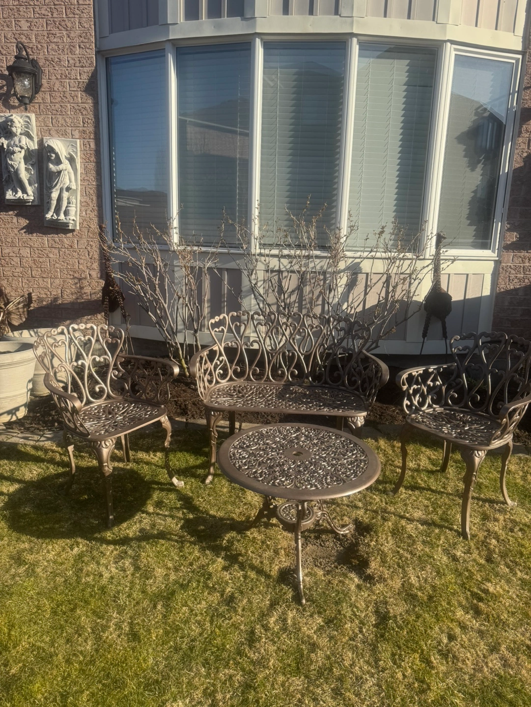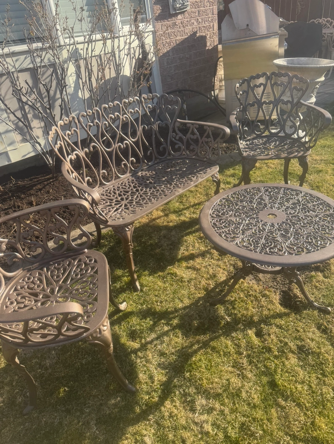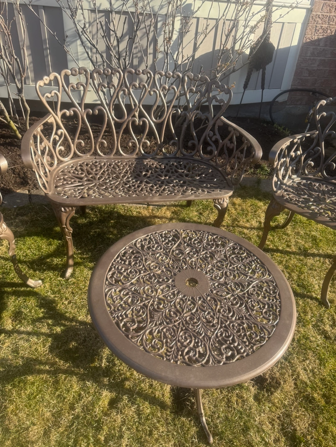 Beautiful cast aluminum patio furniture set. Includes two armchairs, a love seat, and a small round table. Intricate detailing throughout. Perfect for small spaces.