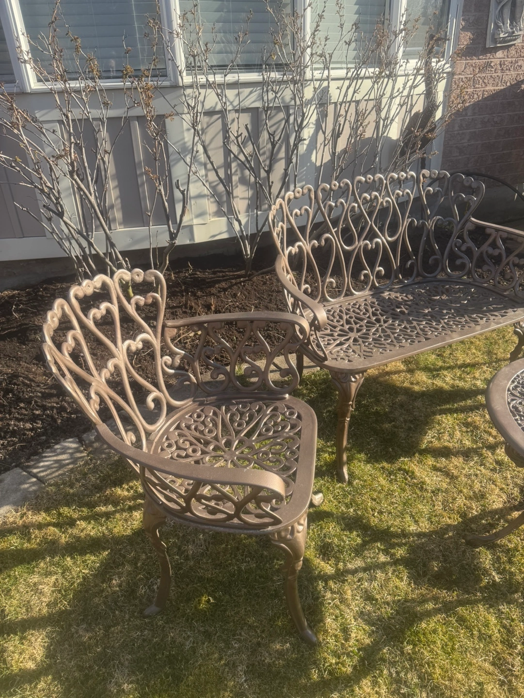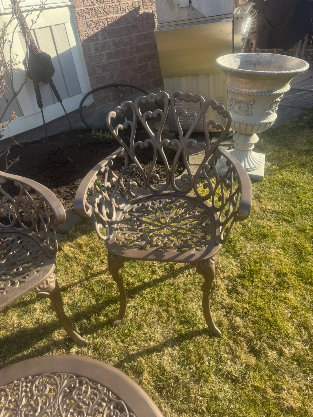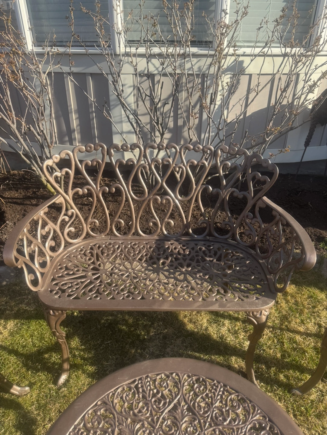 Beautiful cast aluminum patio furniture set. Includes two armchairs, a love seat, and a small round table. Intricate detailing throughout. Perfect for small spaces.